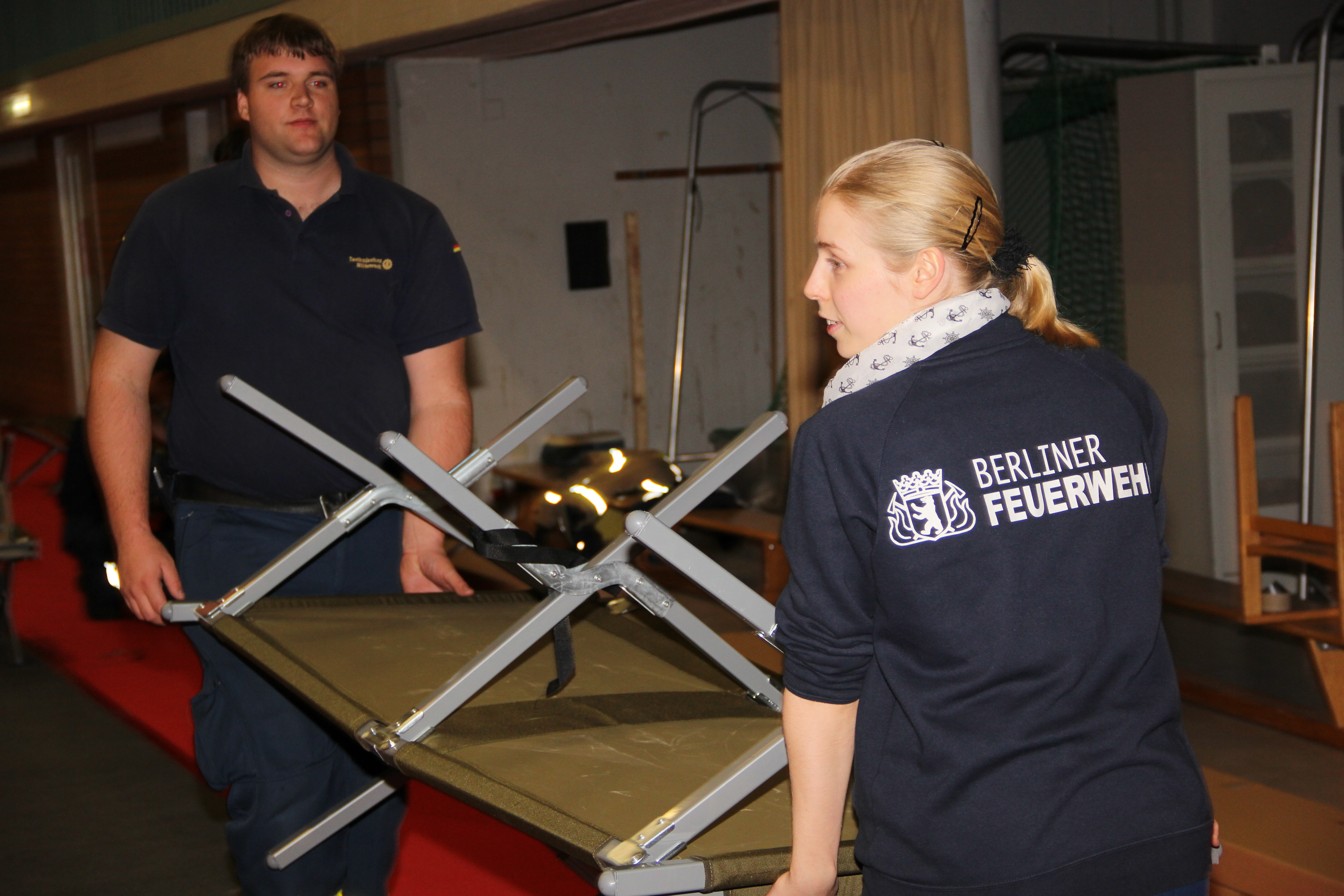 In der Nacht vom Donnerstag auf Freitag richteten 19 Helferinnen und Helfer aus unserem Ortsverband gemeinsam mit der Berliner Feuerwehr eine Notunterkunft für Flüchtlinge in einer Turnhalle ein. Aufgrund erschöpfter Kapazitäten für die Aufnahme hatte das Land Berlin kurzfristig beschlossen, die Sportstätte im Bezirk Steglitz-Zehlendorf als warme, schnelle Übergangslösung bereitzustellen.