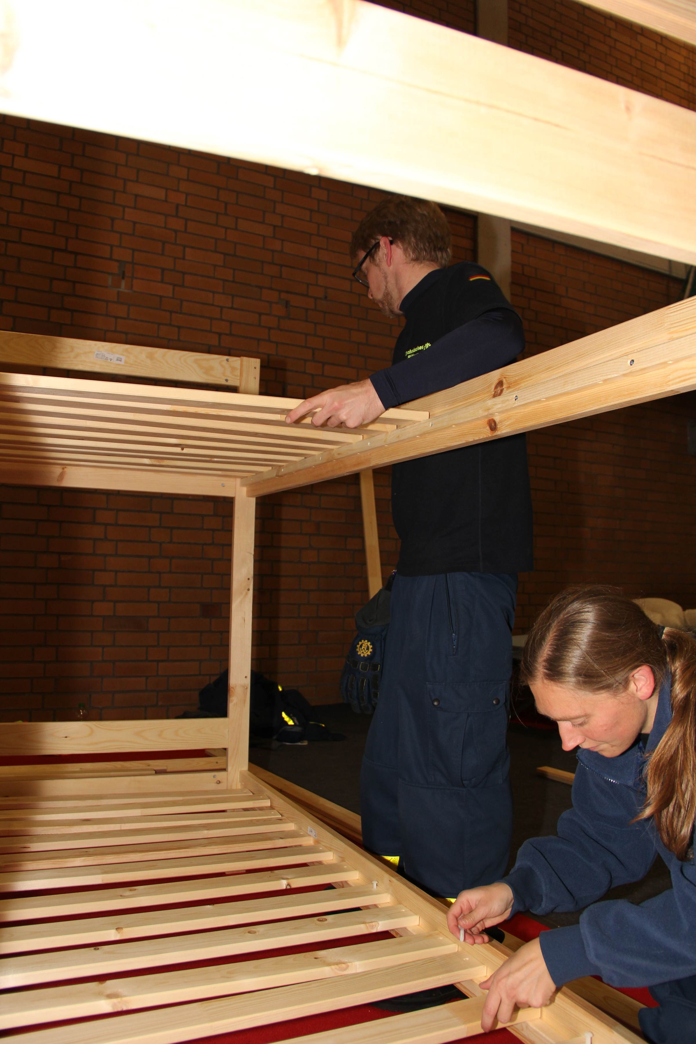 Die Einsatzkräfte waren vor allem damit beschäftigt, Feldbetten aufzustellen und Doppelstockbetten aus Holz aufzubauen. Die palettenweise angelieferten hölzernen Schlafquartiere wurden im Auftrag des Betreibers zusammengebaut und mit Matratzen ausgestattet. Es musste besonders schnell gehen, denn die ersten Flüchtlinge bezogen die Schlafplätze noch in der Nacht. Durch hohen Personalaufwand bis in die frühen Morgenstunden und gelungene Kooperation zwischen dem Landesamt für Gesundheit und Soziales, der Freiwilligen- und Berufsfeuerwehr sowie dem THW konnten in Rekordgeschwindigkeit 200 Schlafplätze zur Verfügung gestellt werden.
