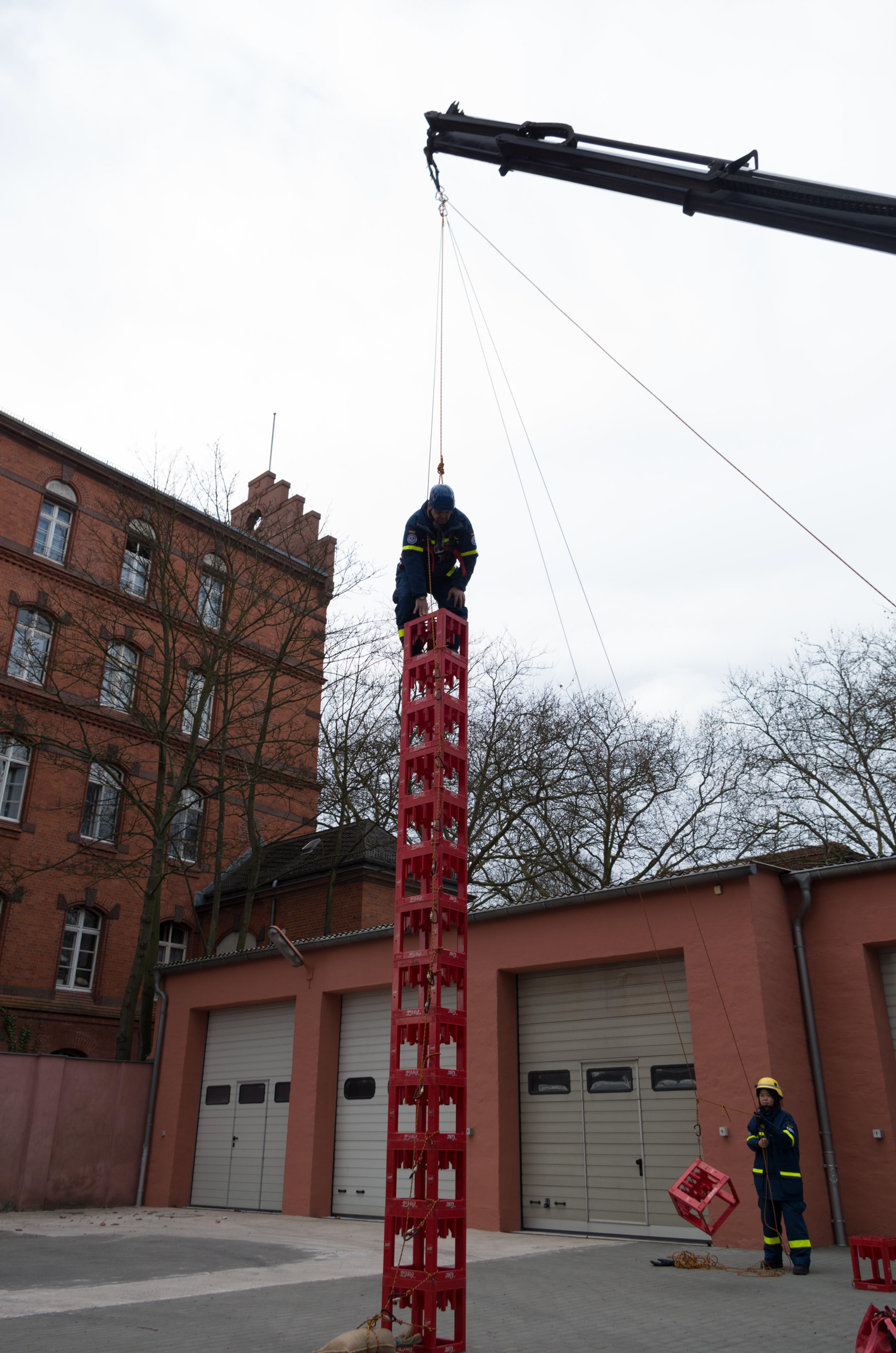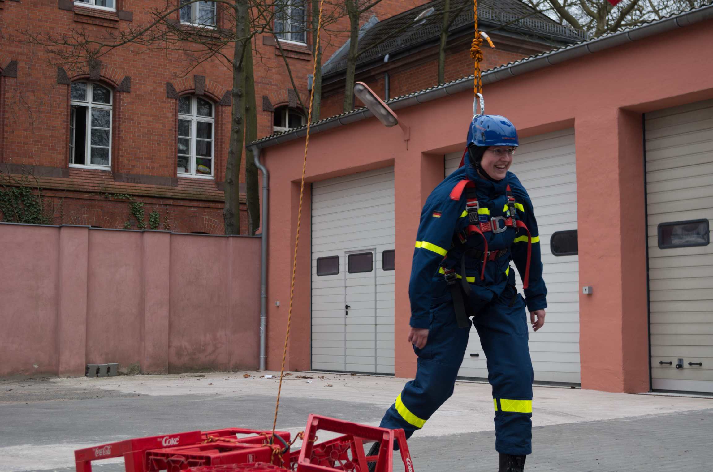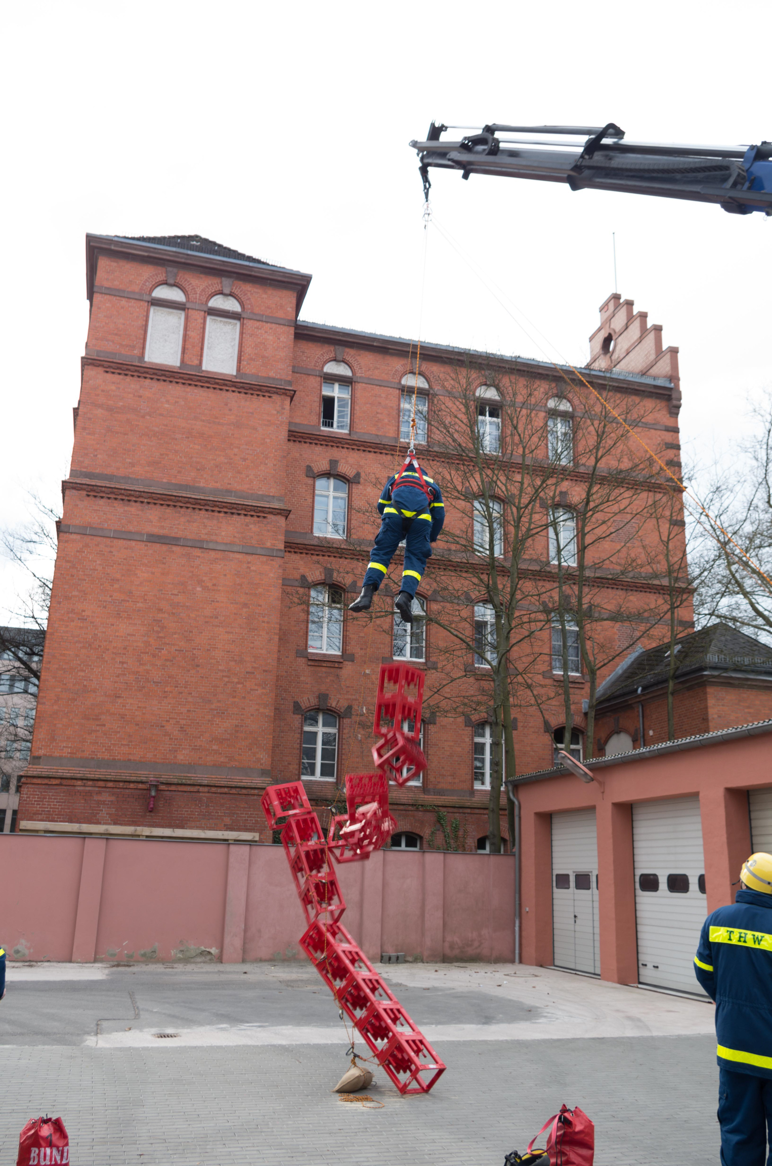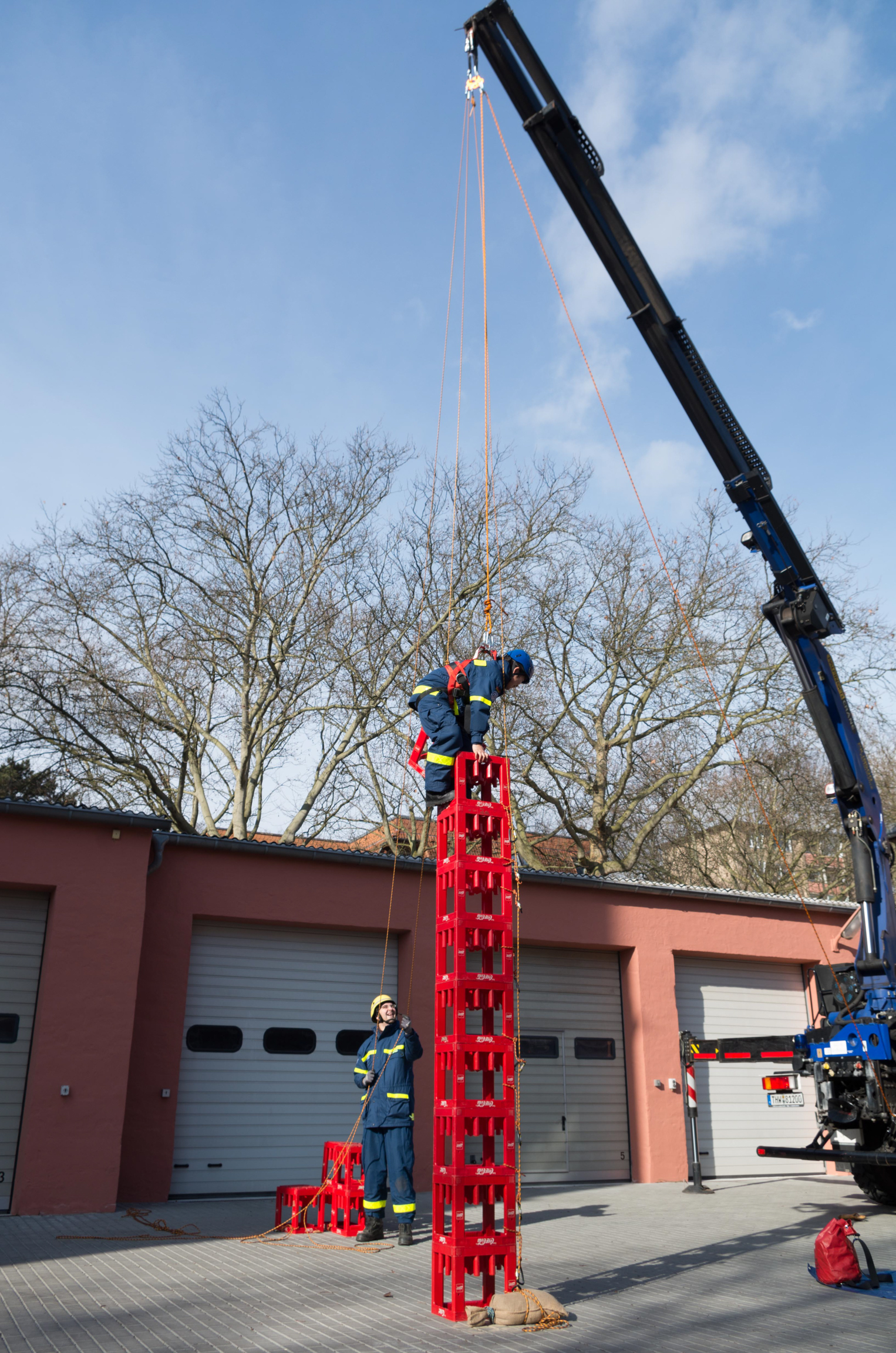 Insgesamt elf Stunden lang trainierten die Helferinnen und Helfer aus Charlottenburg-Wilmersdorf, Neukölln und unserem Ortsverband die richtige Handhabung des Spiels mit großer Technik. Viele Dinge sind zu erlernen gewesen, von der richtigen Positionierung des THW-Krans bis zur richtigen Sicherung der Teilnehmenden. Als Nebeneffekt konnten die Neulinge unter den Expertinnen und Experten gleich selbst testen, wie schwer das Kistenstapeln, am Kran hängend, eigentlich ist.