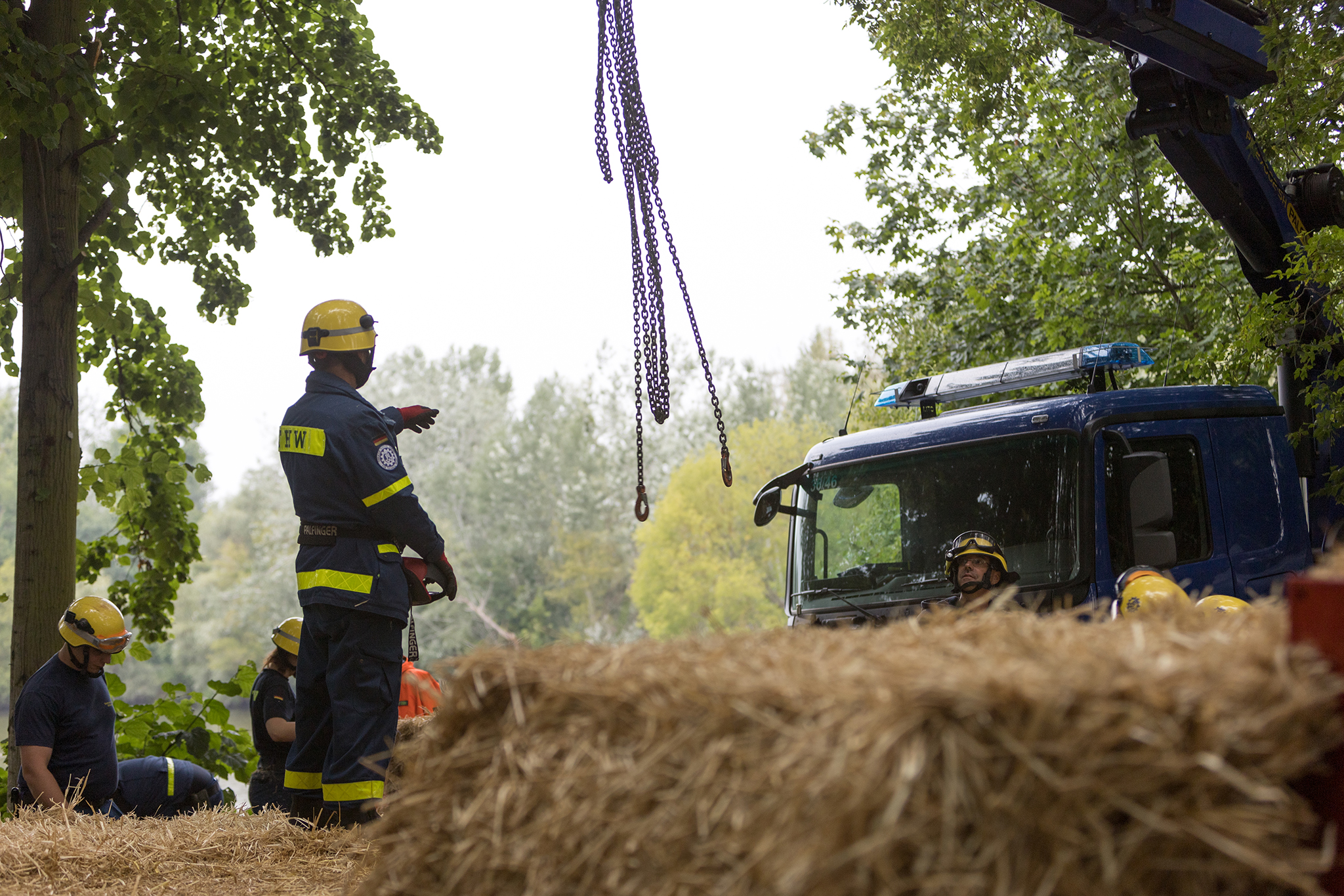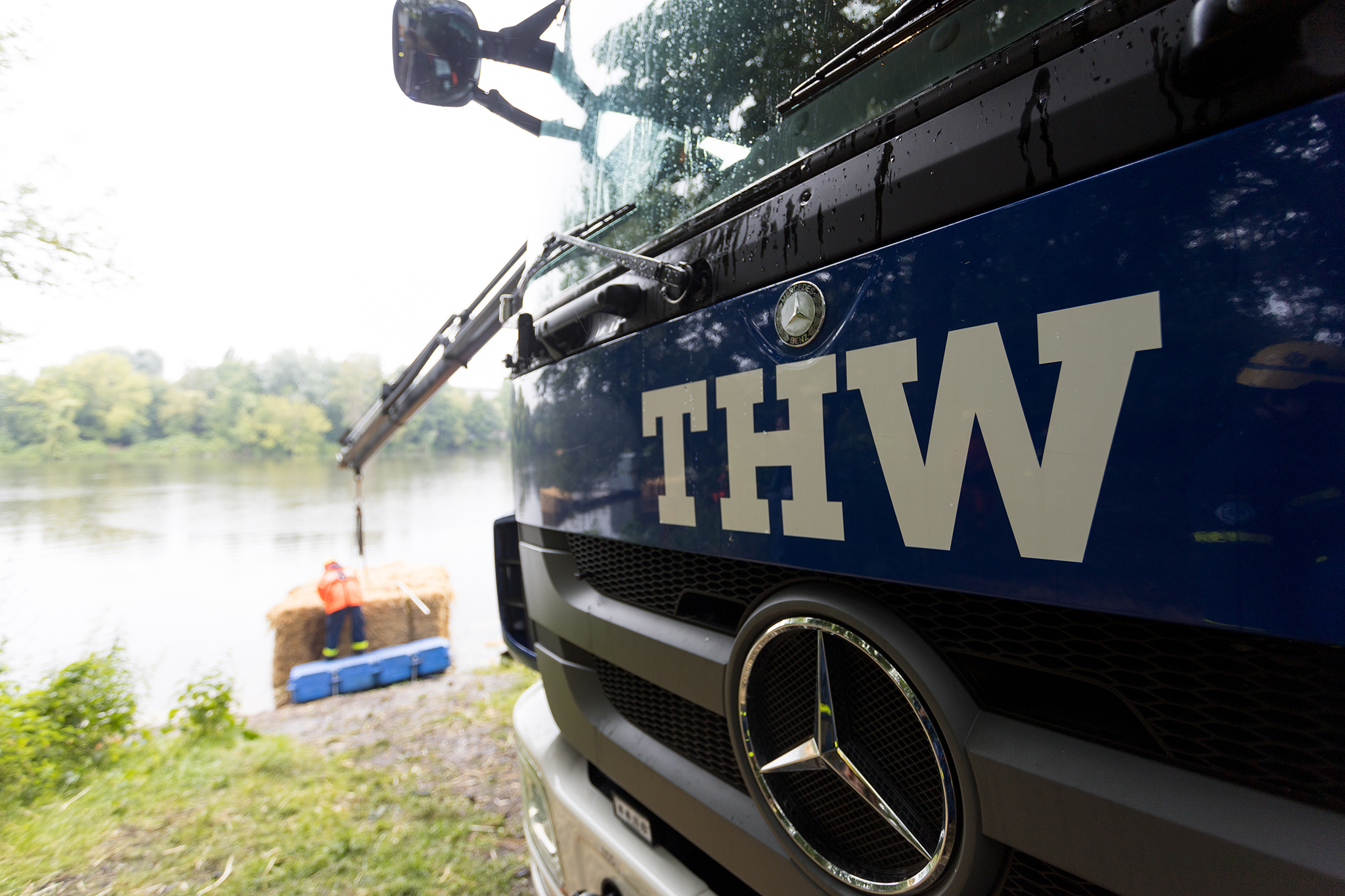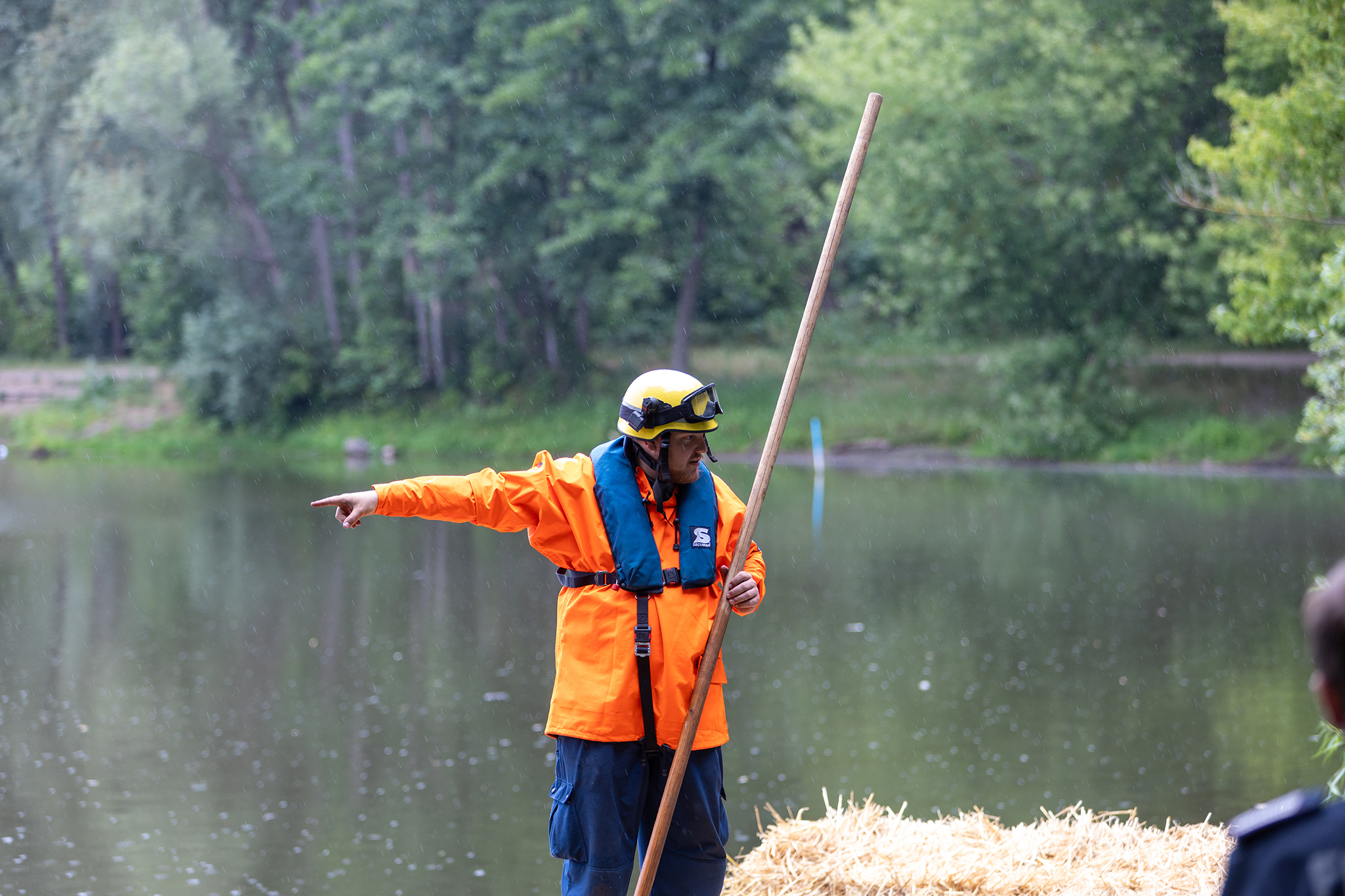 Die Kameraden des OV Potsdam haben am 15.07.2020 am Aradosee in Potsdam eine sieben mal acht Meter große schwimmende Strohplattform aus 45 Strohballen erstellt. Dies sollte bei der Sprengung einer 250kg schweren Weltkriegsbombe für Schutz vor herumfliegenden Metallsplittern bieten.