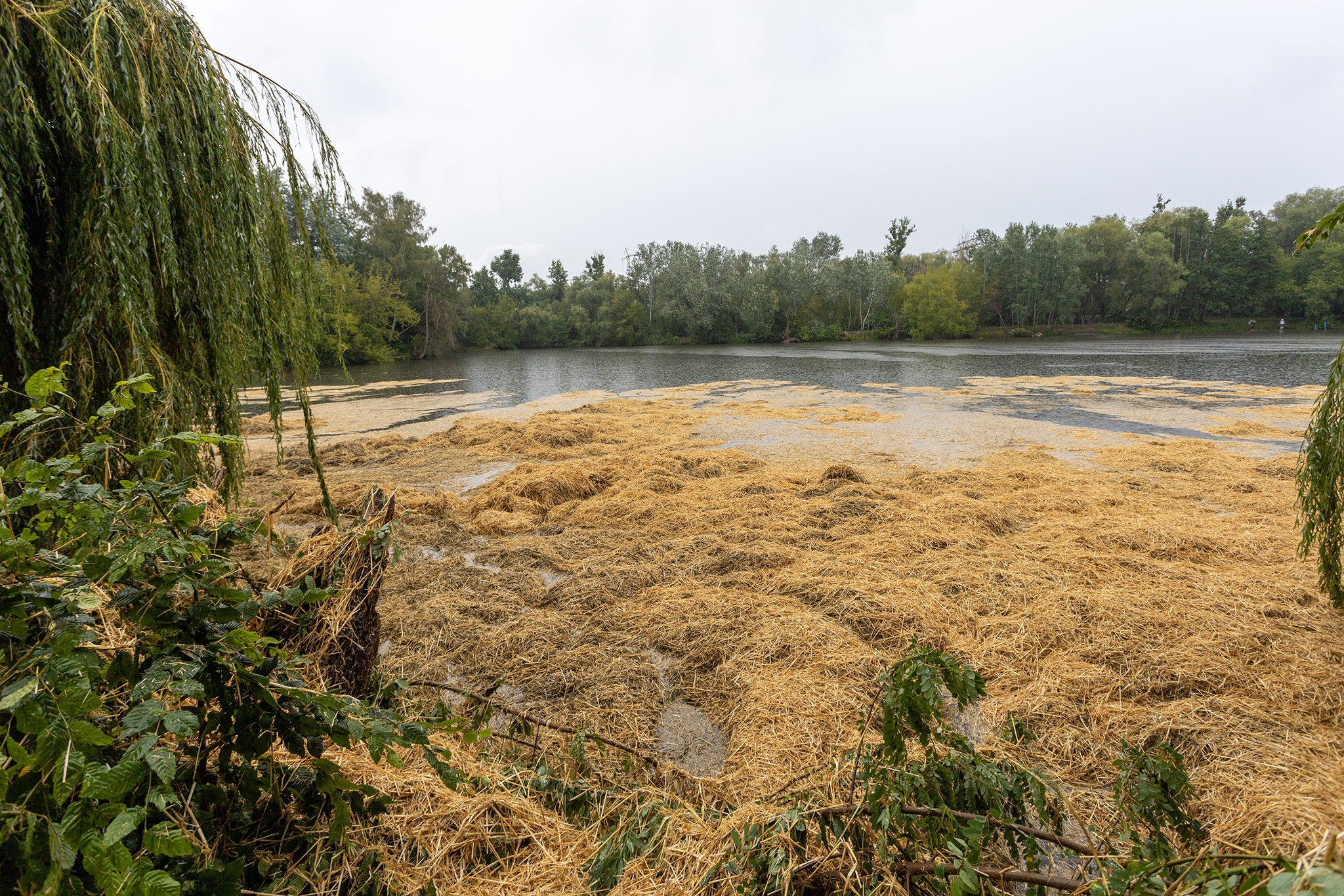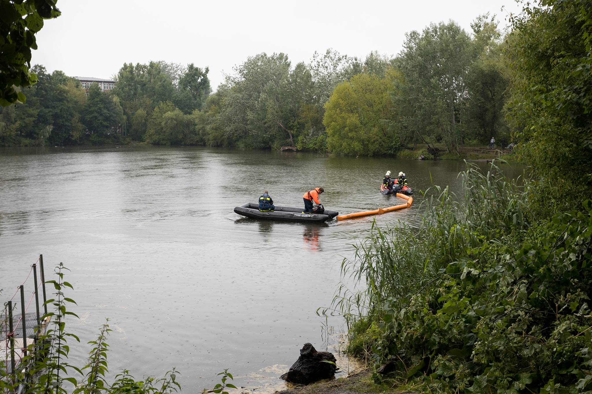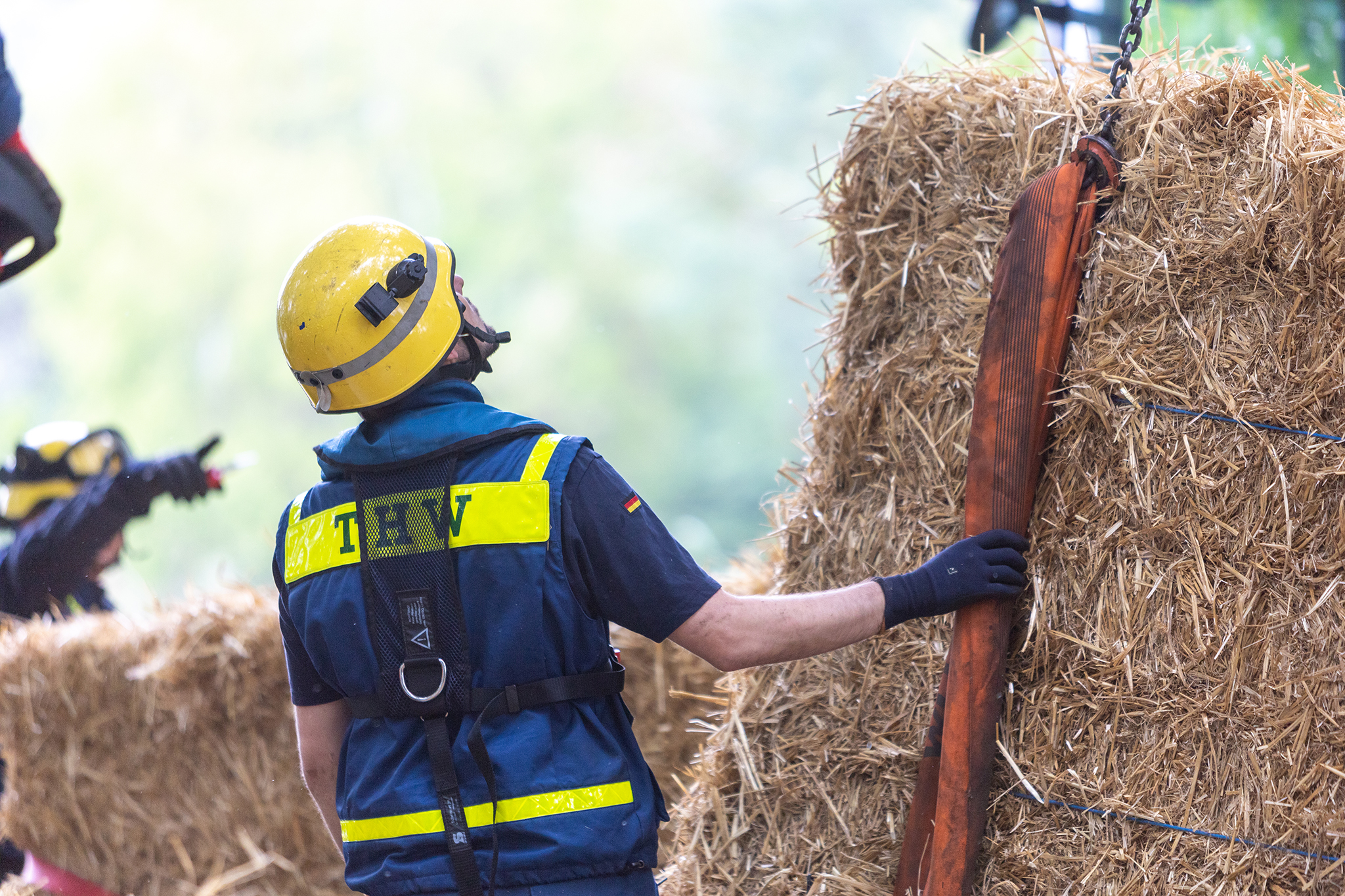 Die Kameraden des OV Potsdam haben am 15.07.2020 am Aradosee in Potsdam eine sieben mal acht Meter große schwimmende Strohplattform aus 45 Strohballen erstellt. Dies sollte bei der Sprengung einer 250kg schweren Weltkriegsbombe für Schutz vor herumfliegenden Metallsplittern bieten.