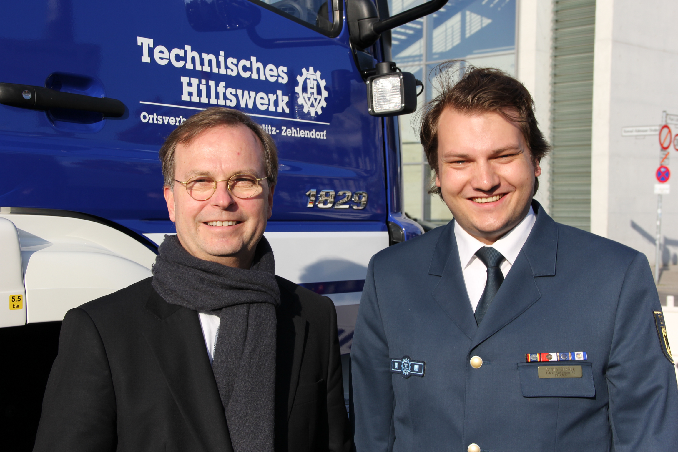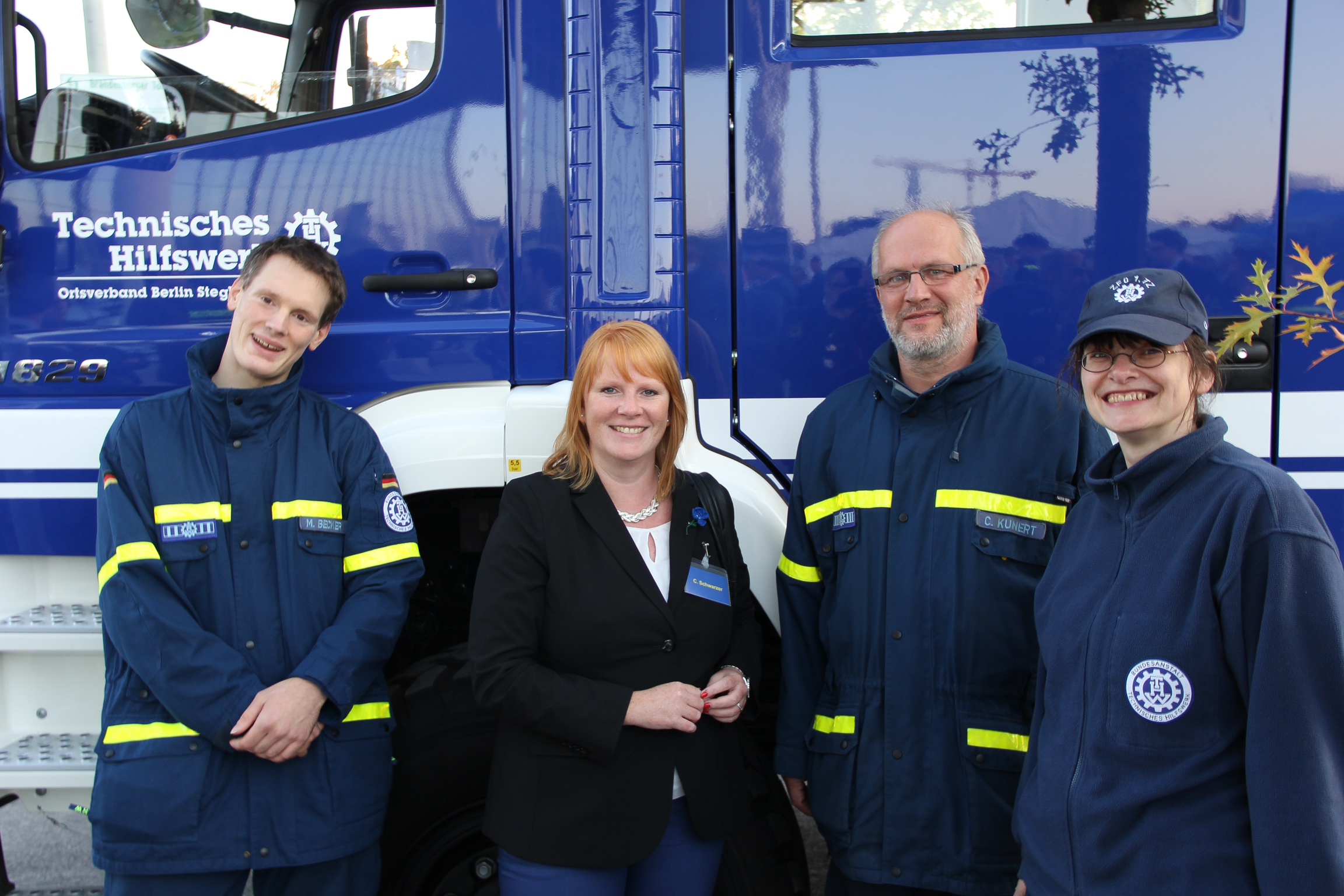 Christina Schwarzer, MdB, mit Vertretern des Ortsverbandes Neukölln und unserem Gruppenführer Maximilian Becker vor dem Gerätekraftwagen I