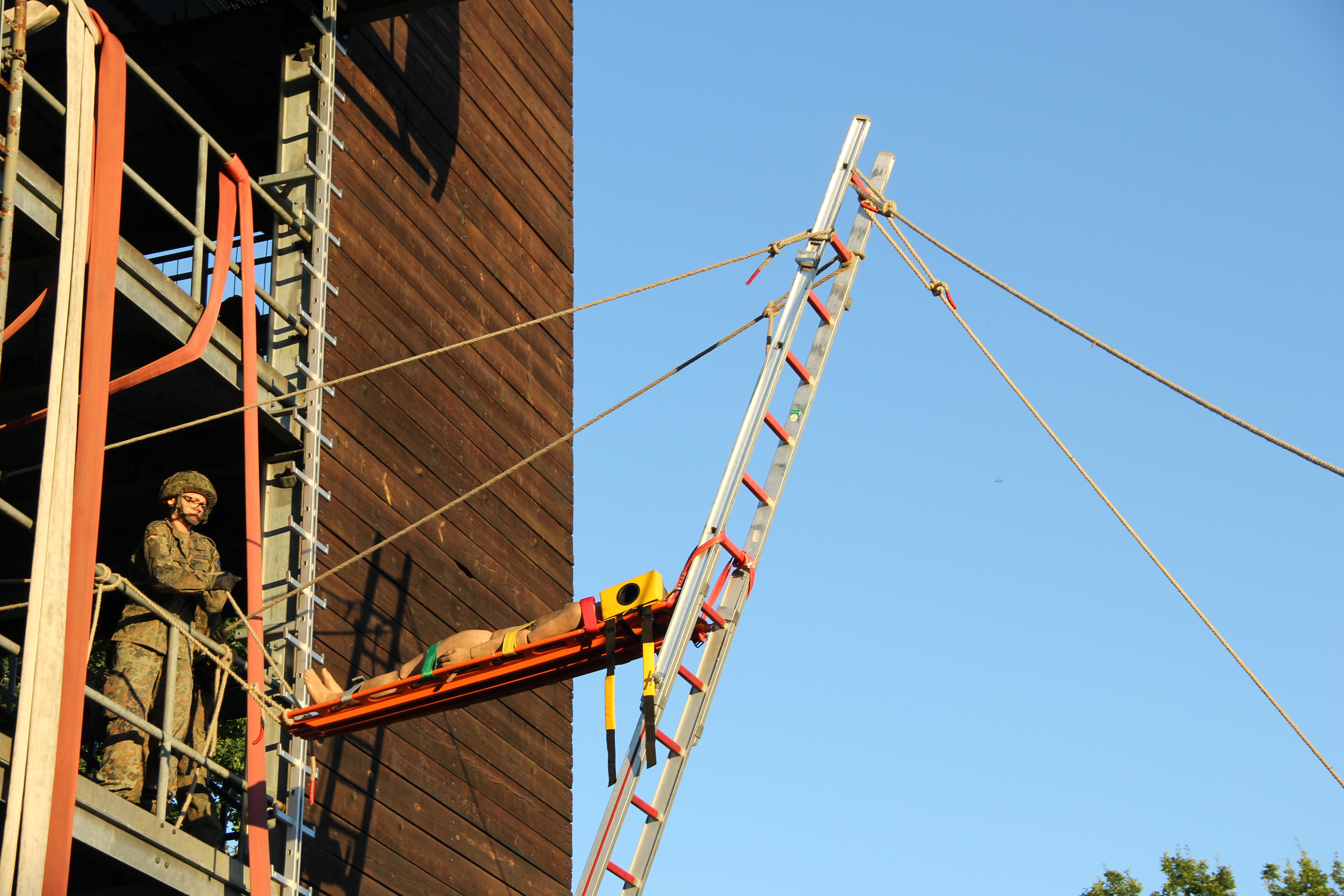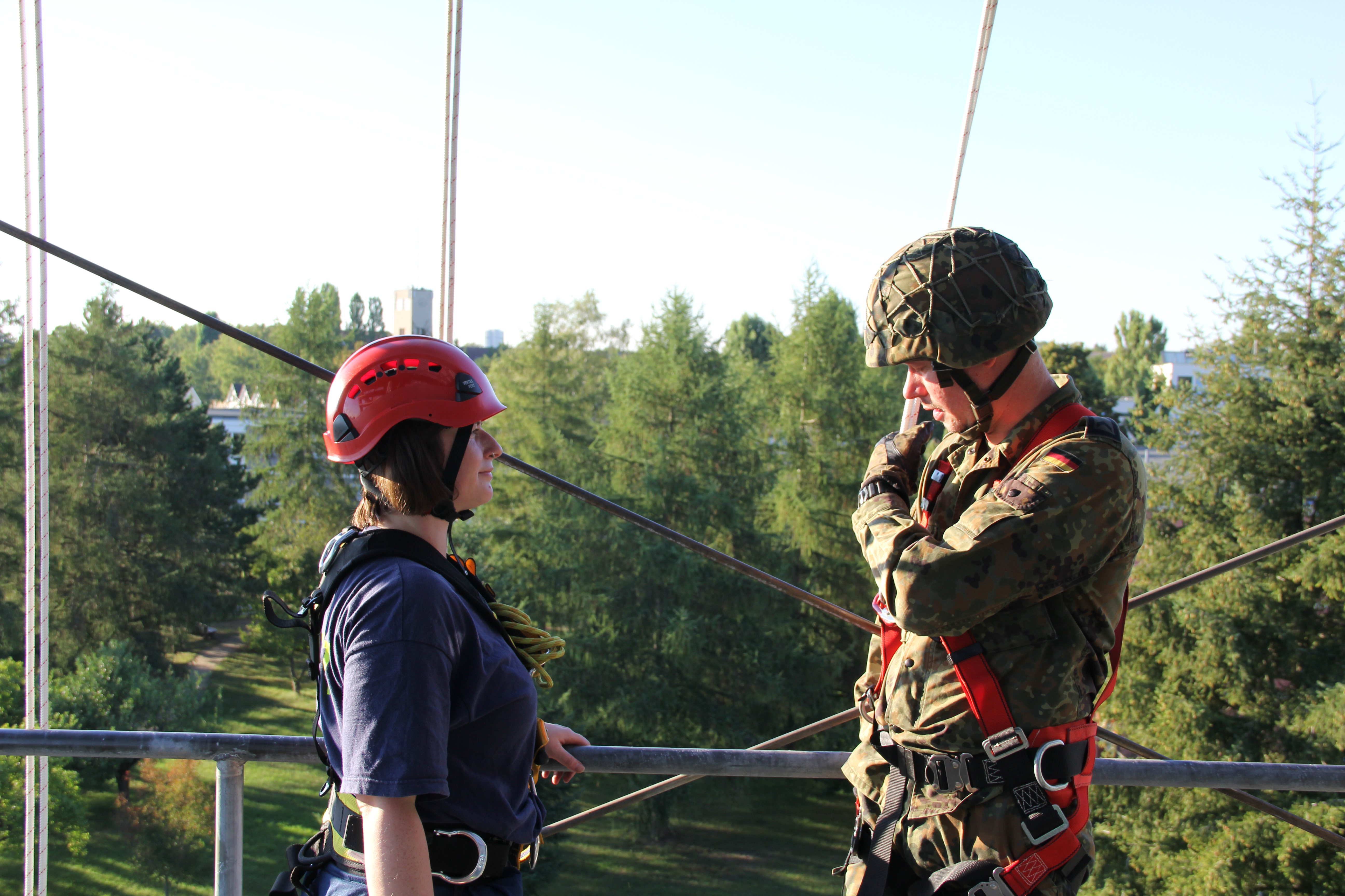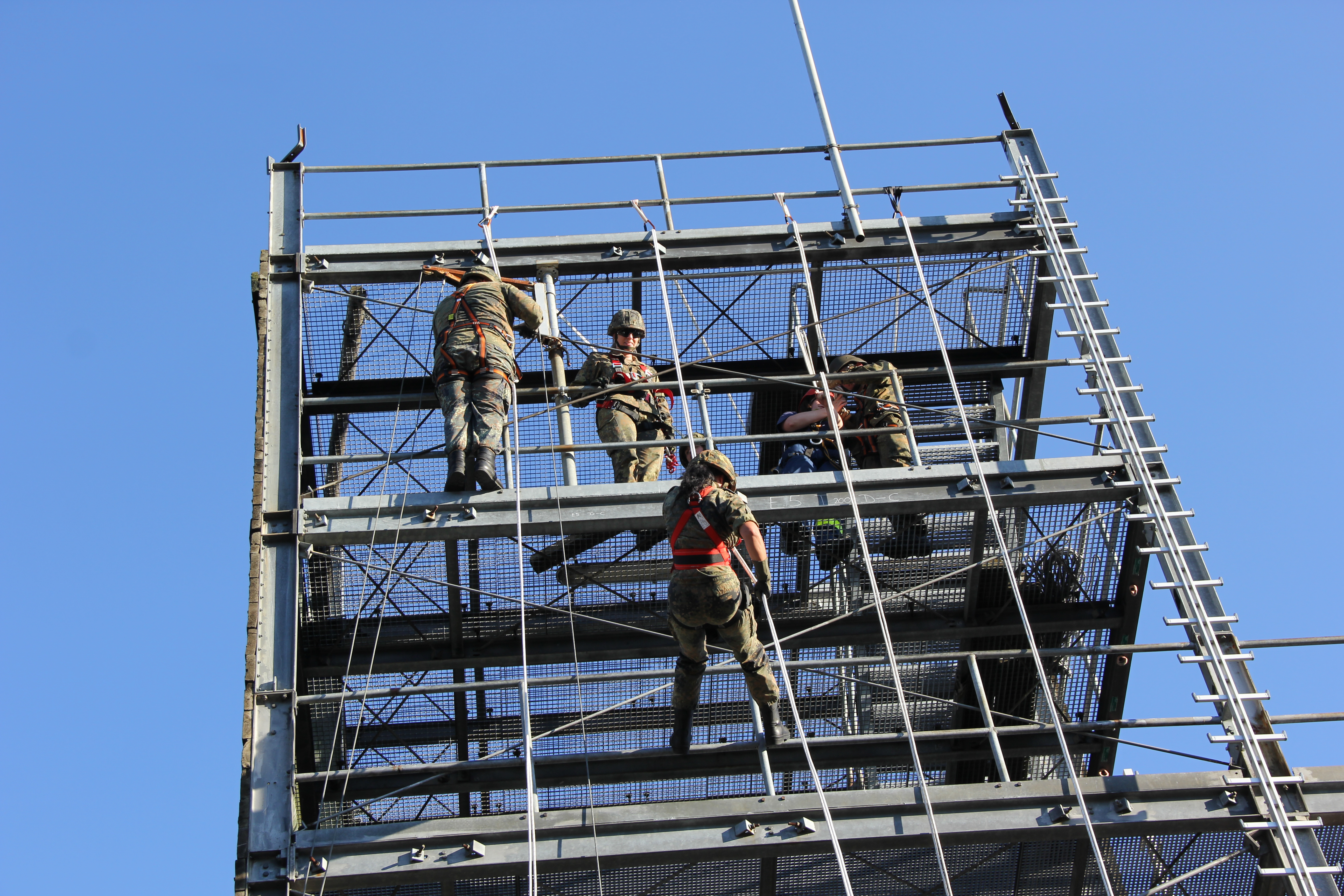 Am Turm zeigte unsere Höhenrettungsgruppe, dass es zwar Überwindung kostet, sich aus über zehn Metern abzuseilen. Wenn man es aber erst einmal geschafft hat, sich darauf einzulassen, macht es sogar Spaß. Viele Soldatinnen und Soldaten drehten als Beweis einige Extrarunden und übten sich so weiter im Umgang mit den Seilen.