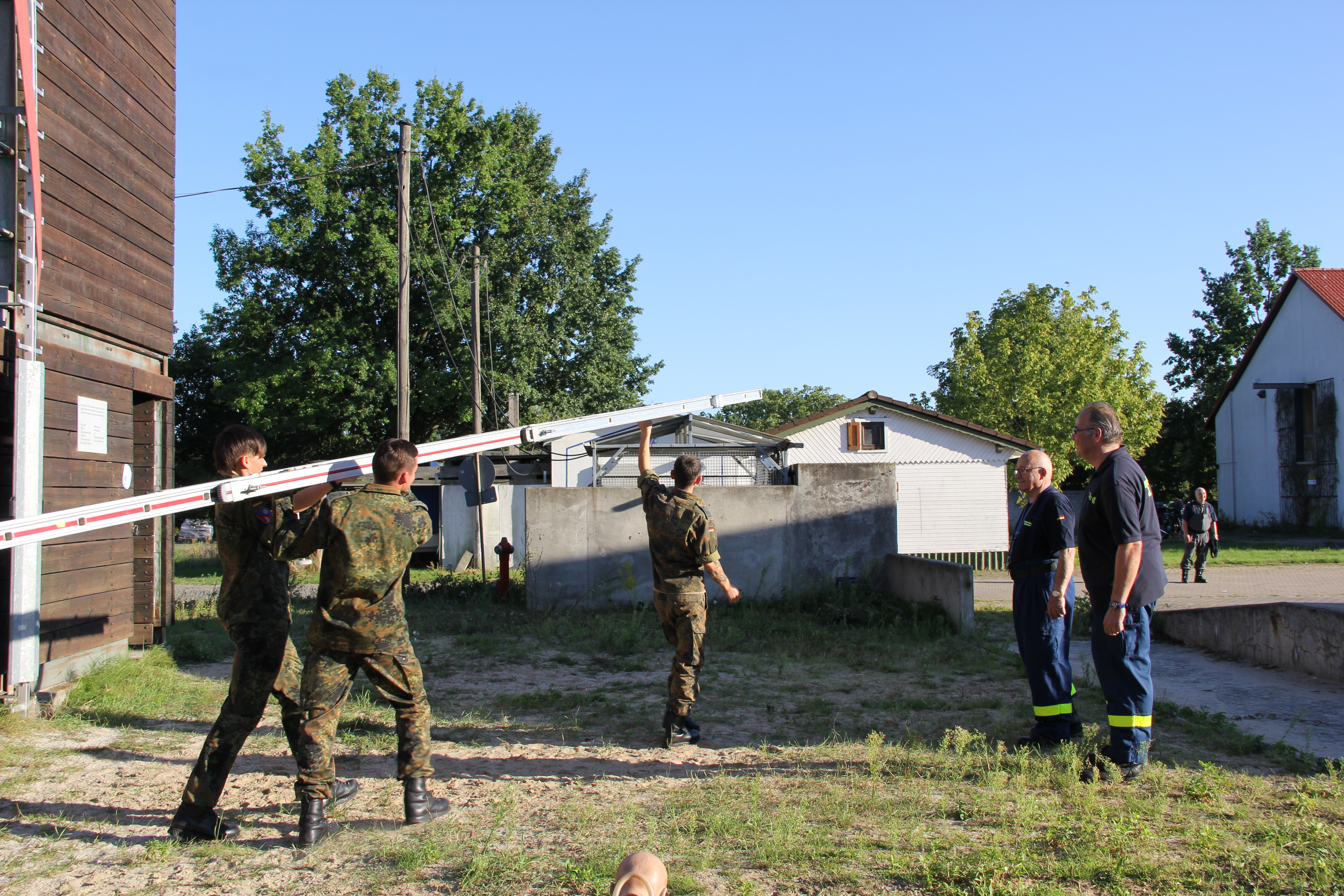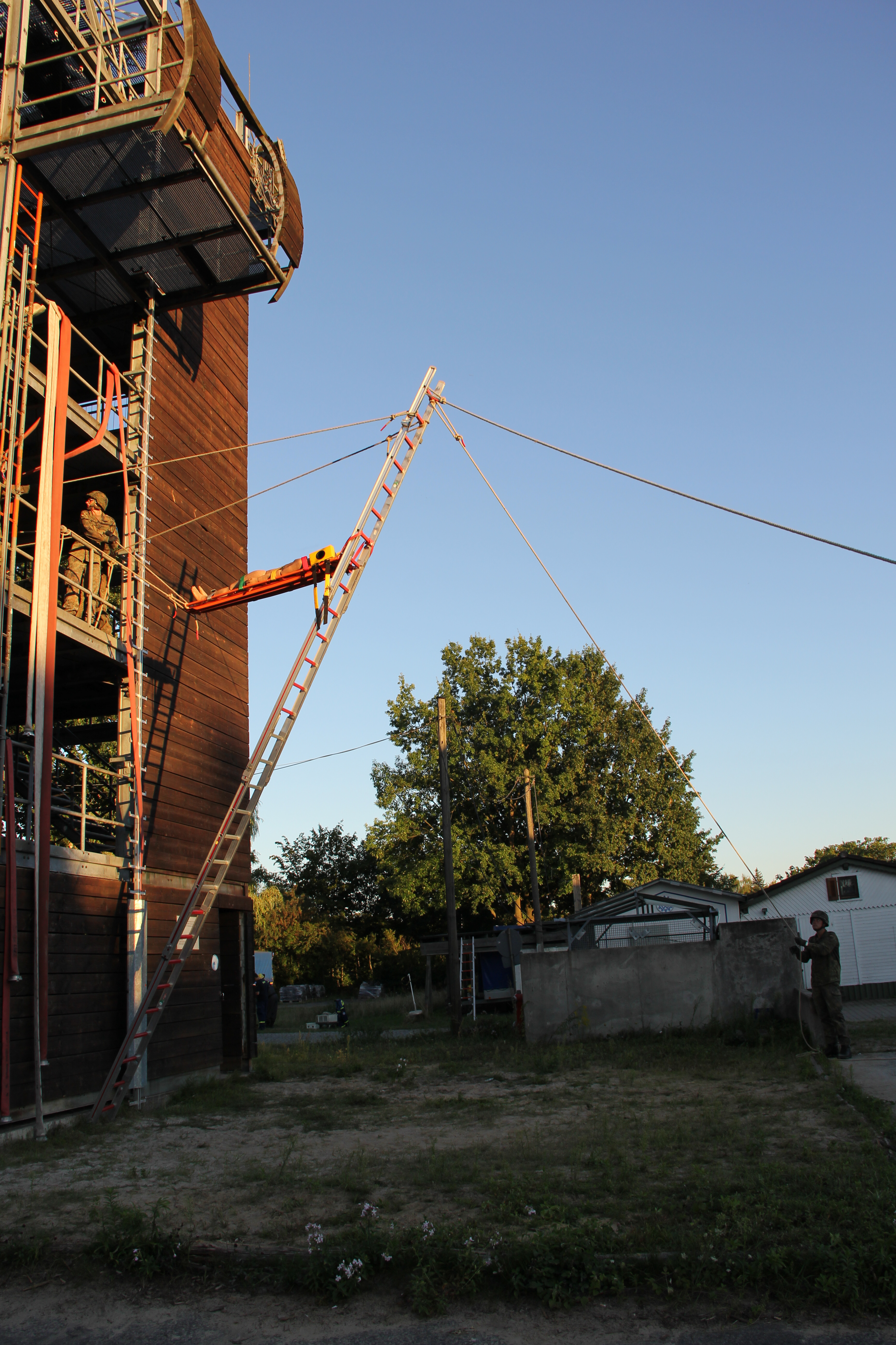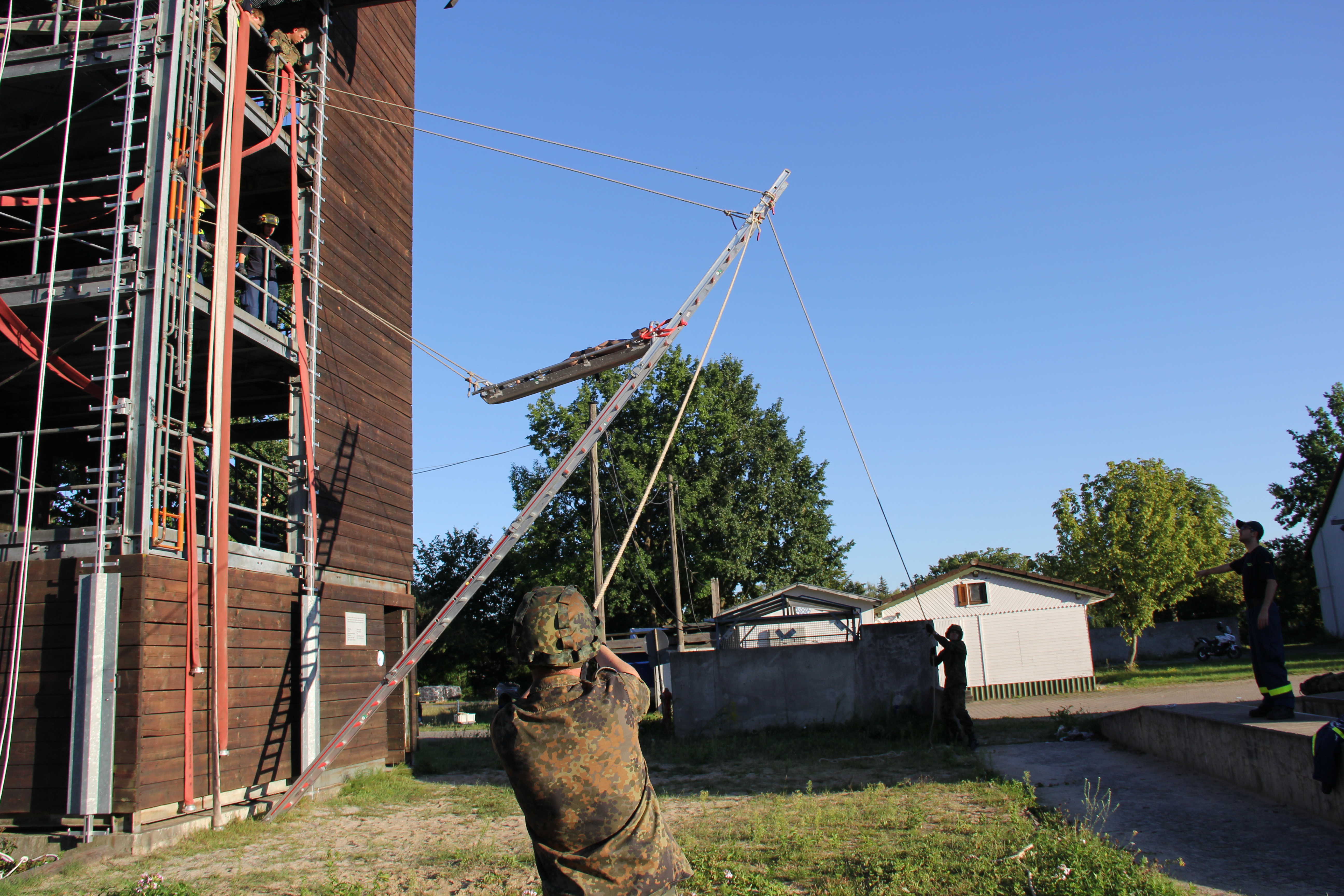 Am Turm zeigte unsere Höhenrettungsgruppe, dass es zwar Überwindung kostet, sich aus über zehn Metern abzuseilen. Wenn man es aber erst einmal geschafft hat, sich darauf einzulassen, macht es sogar Spaß. Viele Soldatinnen und Soldaten drehten als Beweis einige Extrarunden und übten sich so weiter im Umgang mit den Seilen.