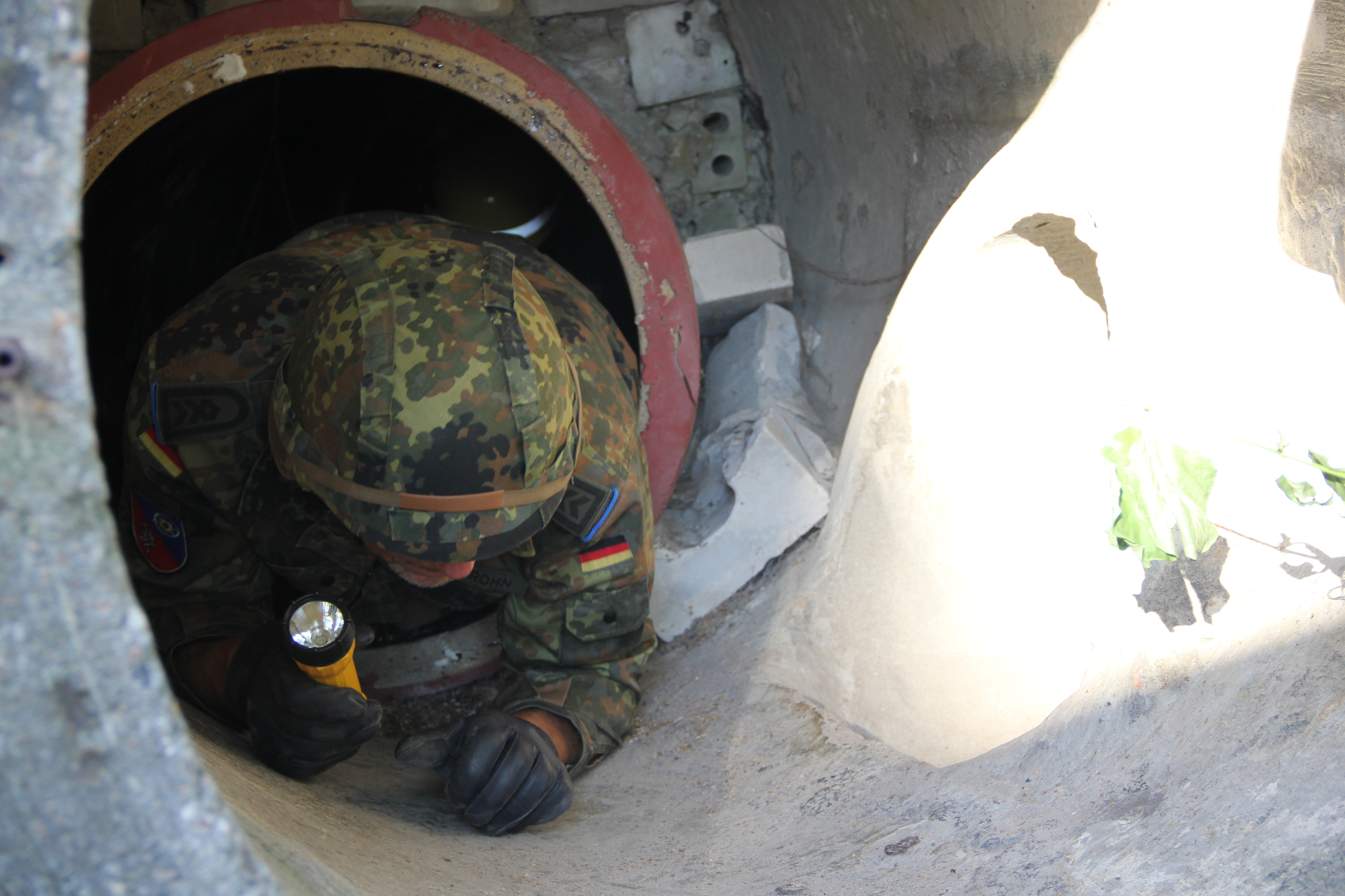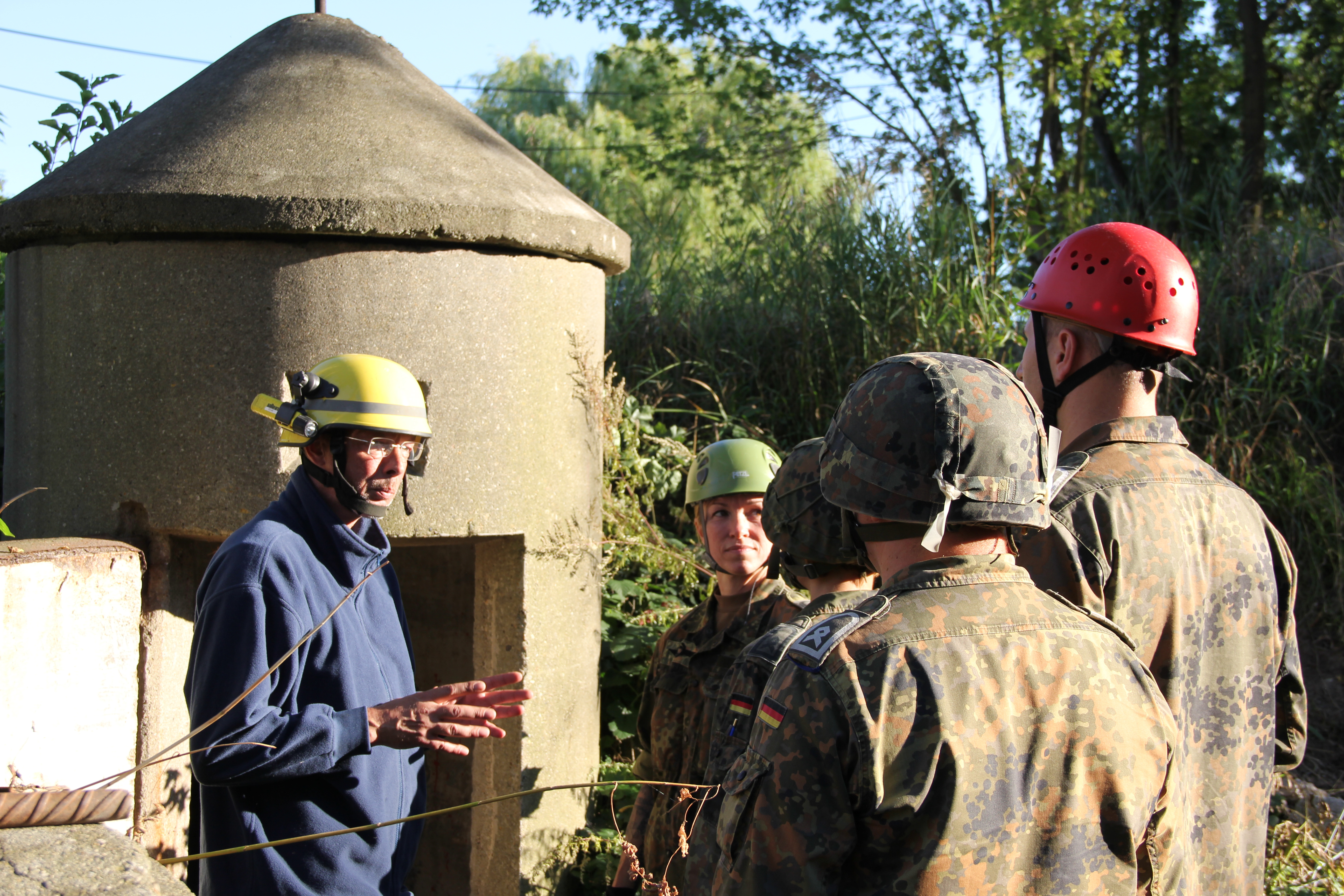 Beispielsweise zeigte ihnen eine unserer Bergungsgruppen, wie mithilfe von Leiterteilen, Leinen und einem Schleifkorb ein sogenannter Leiterhebel zur Rettung und Evakuierung von Personen aus Gebäuden gebaut werden kann. Andere Einsatzkräfte zeigten den Bundeswehrangehörigen in unserer Übungsspinne, wie es sich anfühlt, wenn man sich in Trümmern bewegt. Dabei wurden dann auch gleich wichtige Techniken zur Rettung aus beengten Verhältnissen vermittelt.