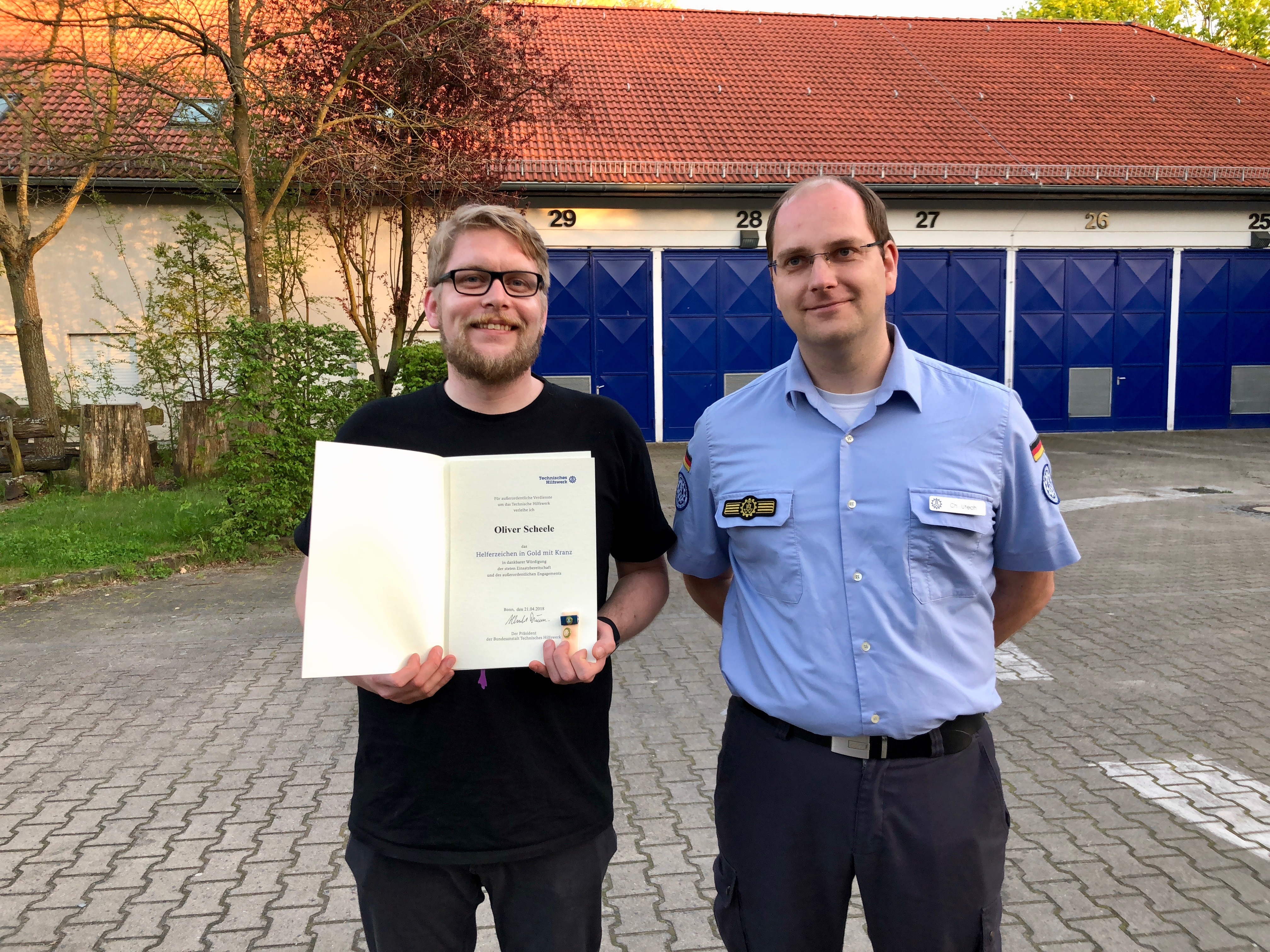 Oliver Scheele mit dem „Helferzeichen Gold mit Kranz“ geehrt! Er ist maßgeblich für die weit über die Grenzen des Ortsverbandes bekannte Öffentlichkeitsarbeit verantwortlich und hat in den vergangenen Jahren wegweisende Ideen und Konzepte im Bereich Social Media entwickelt und die Bereiche Webcontent, Facebook und Twitter für den Ortsverband und die Geschäftsstelle aufgebaut.