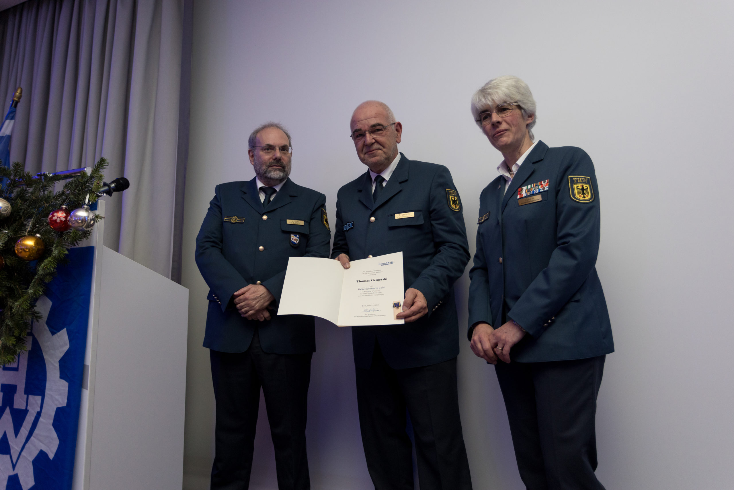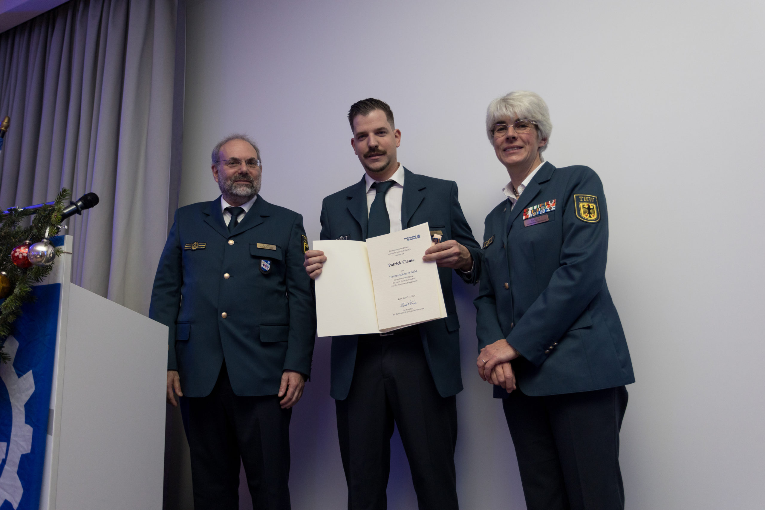 Für ihr vorbildliches Engagement wurden die Helfer Patrick Clauss, Thomas Gemerski und Dennis Schweitzer von unserem Leiter der Regionalstelle Herrn Jürgen Coym mit dem THW-Helferzeichen in Gold geehrt.