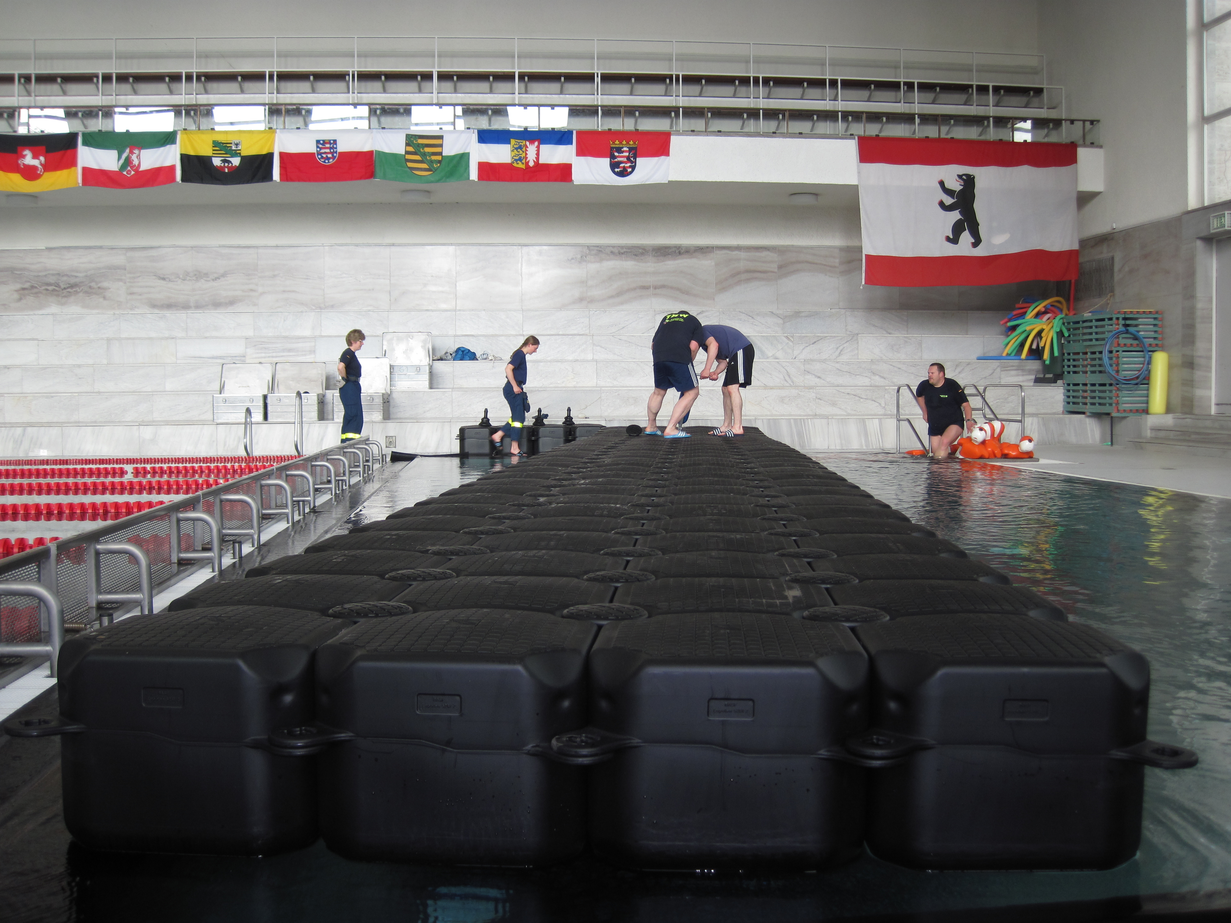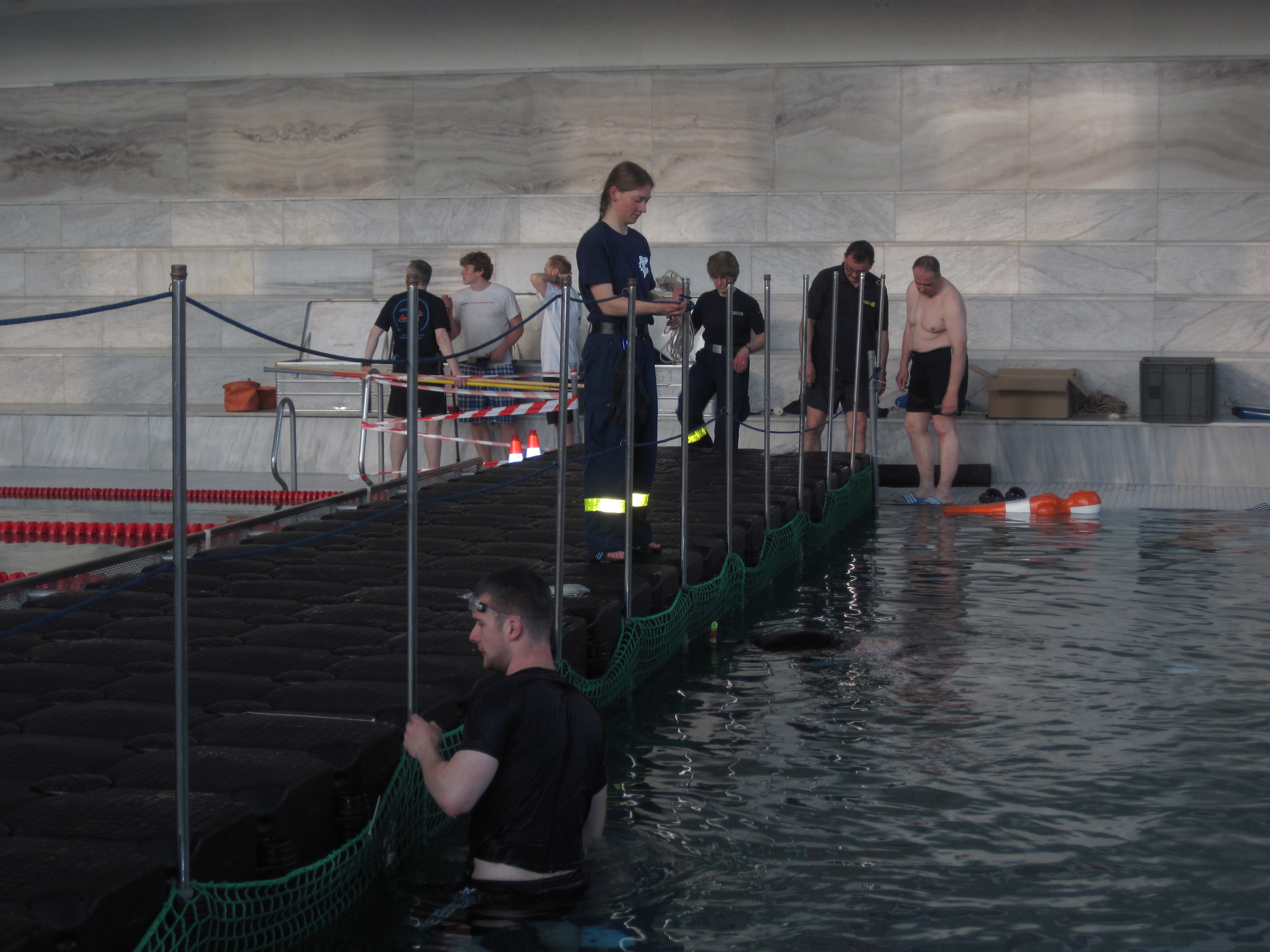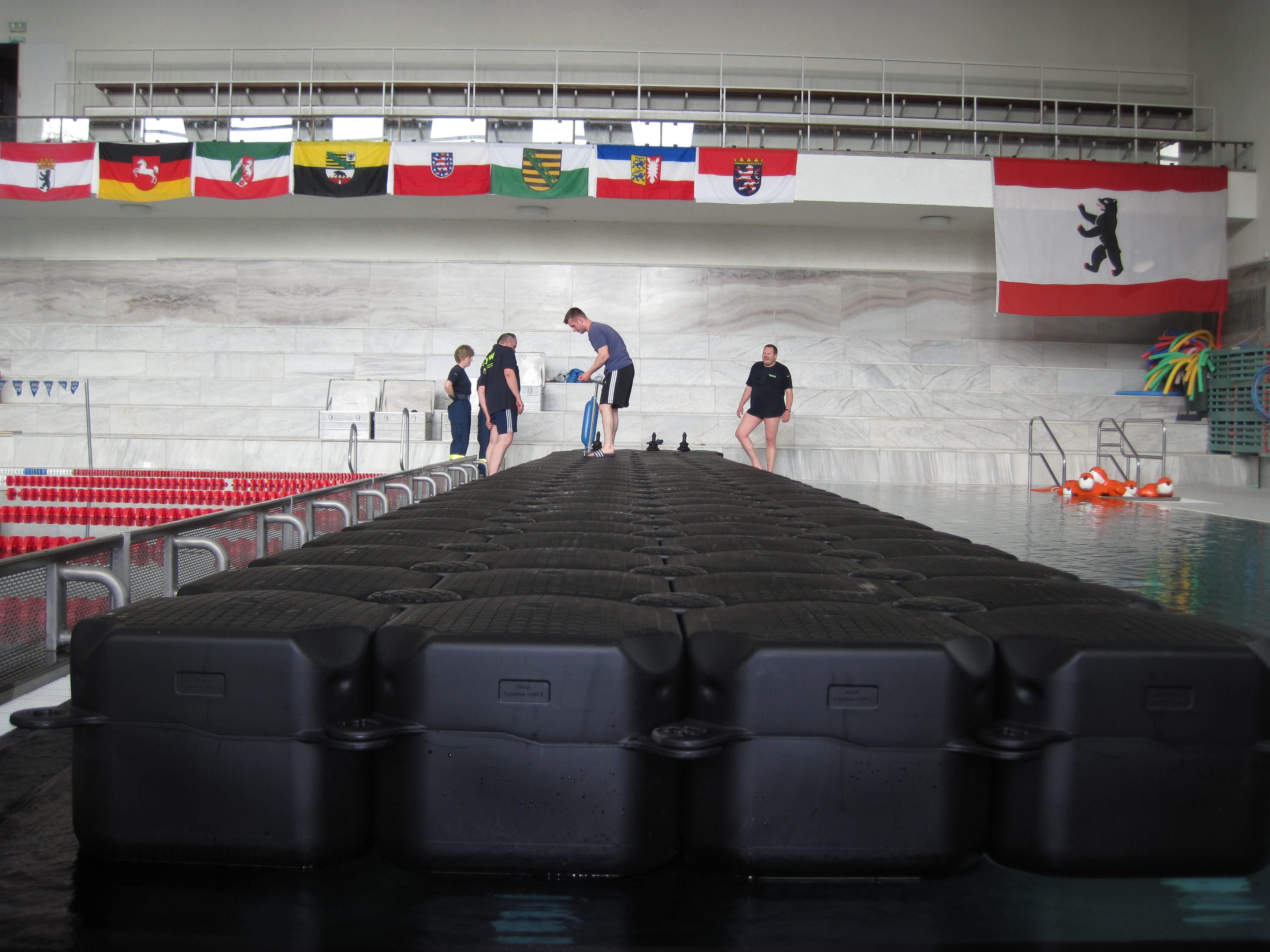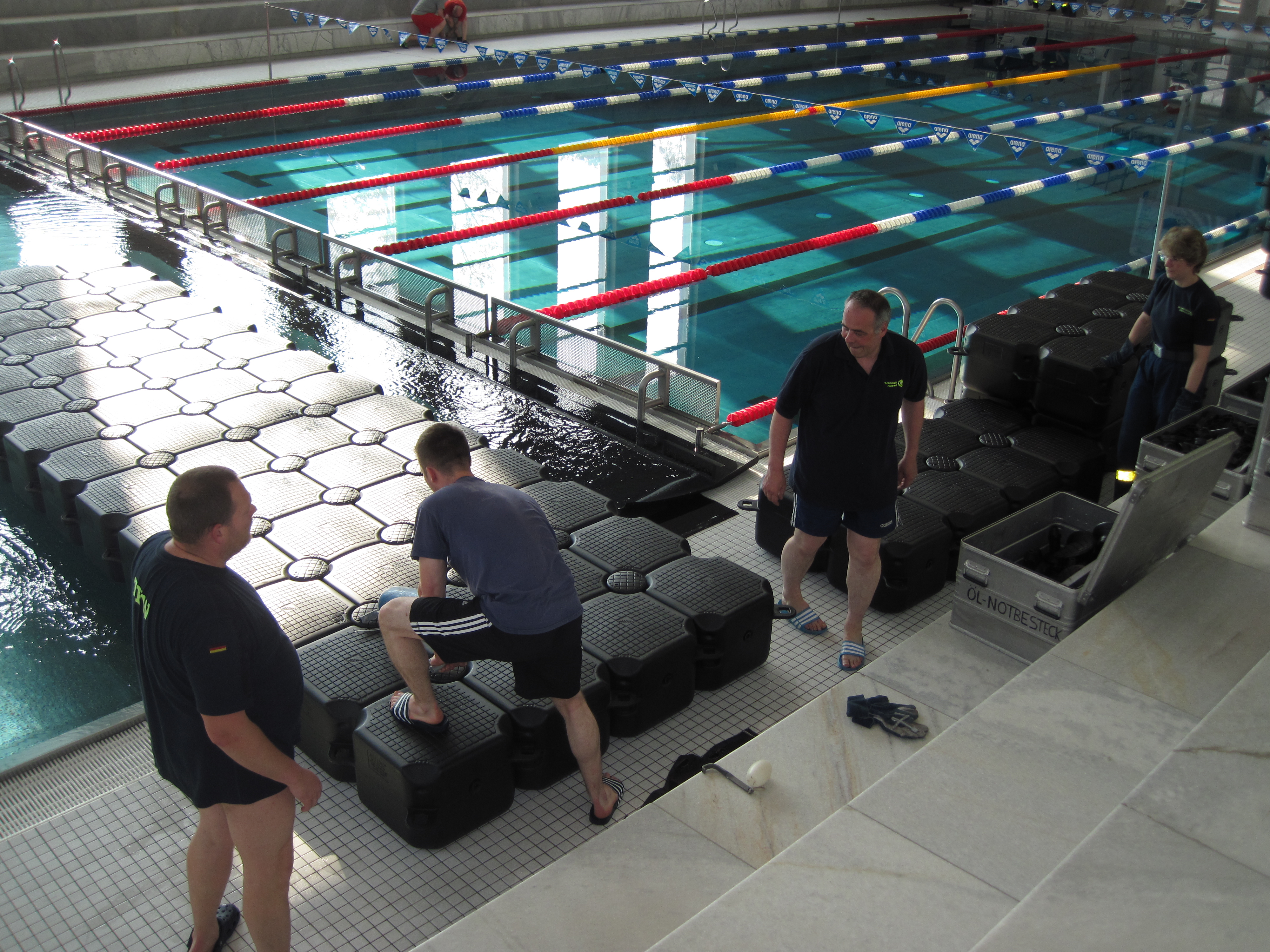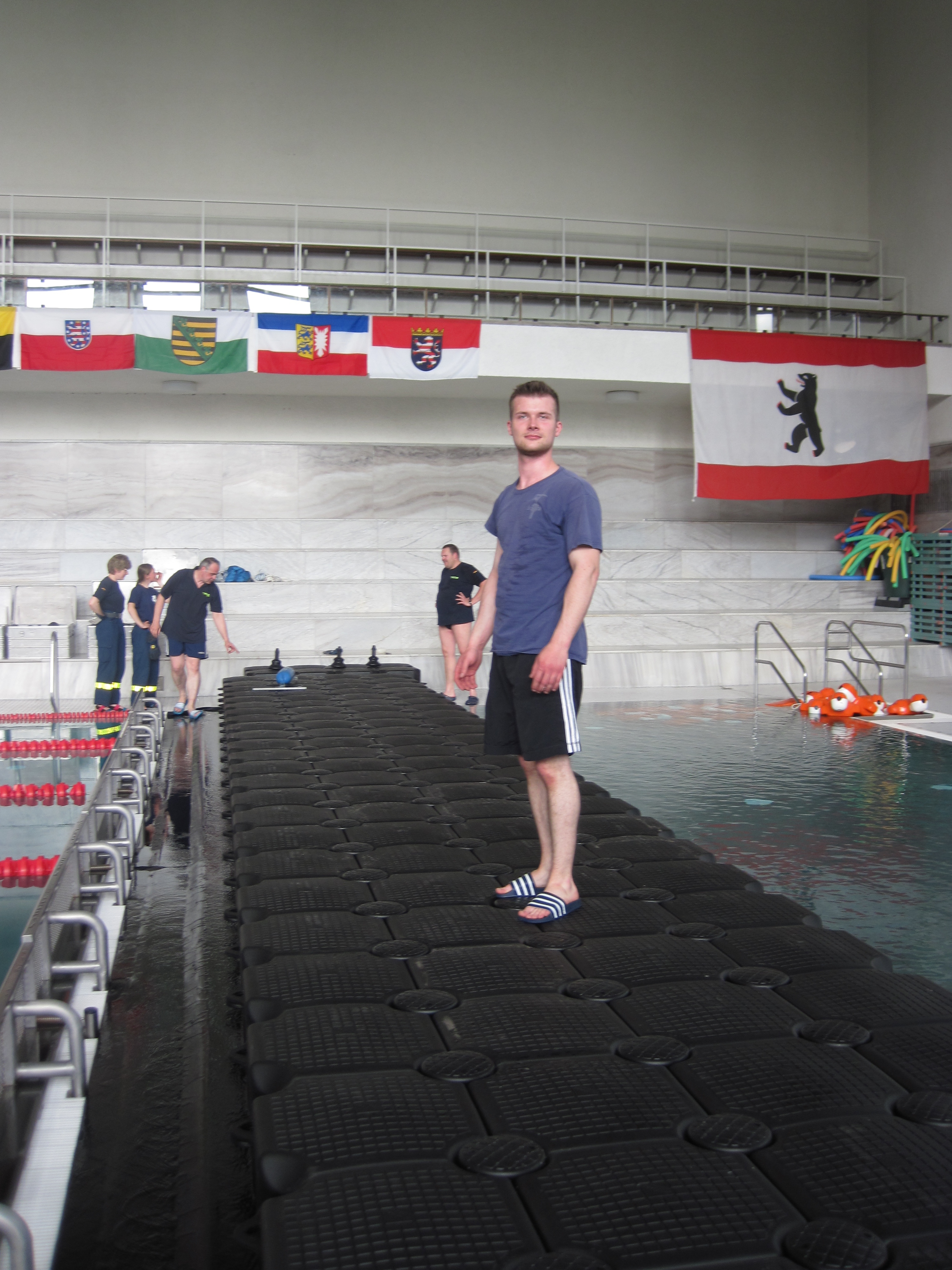 Der Ortsverband Berlin Charlottenburg – Wilmersdorf stellte Zelte und Transportkapazität zur Verfügung. Die Verbreiterung des Steges zwischen dem Schwimmer- und dem Nichtschwimmerbecken übernahmen die Jetfloat®-Spezialisten unseres Ortsverbandes. Aus den Schwimmelementen wurde im Becken ein Steg errichtet und mit Netzen unter Wasser gesichert. Die Plattform hatte eine Länge von 14,5 m und eine Breite von 2m.