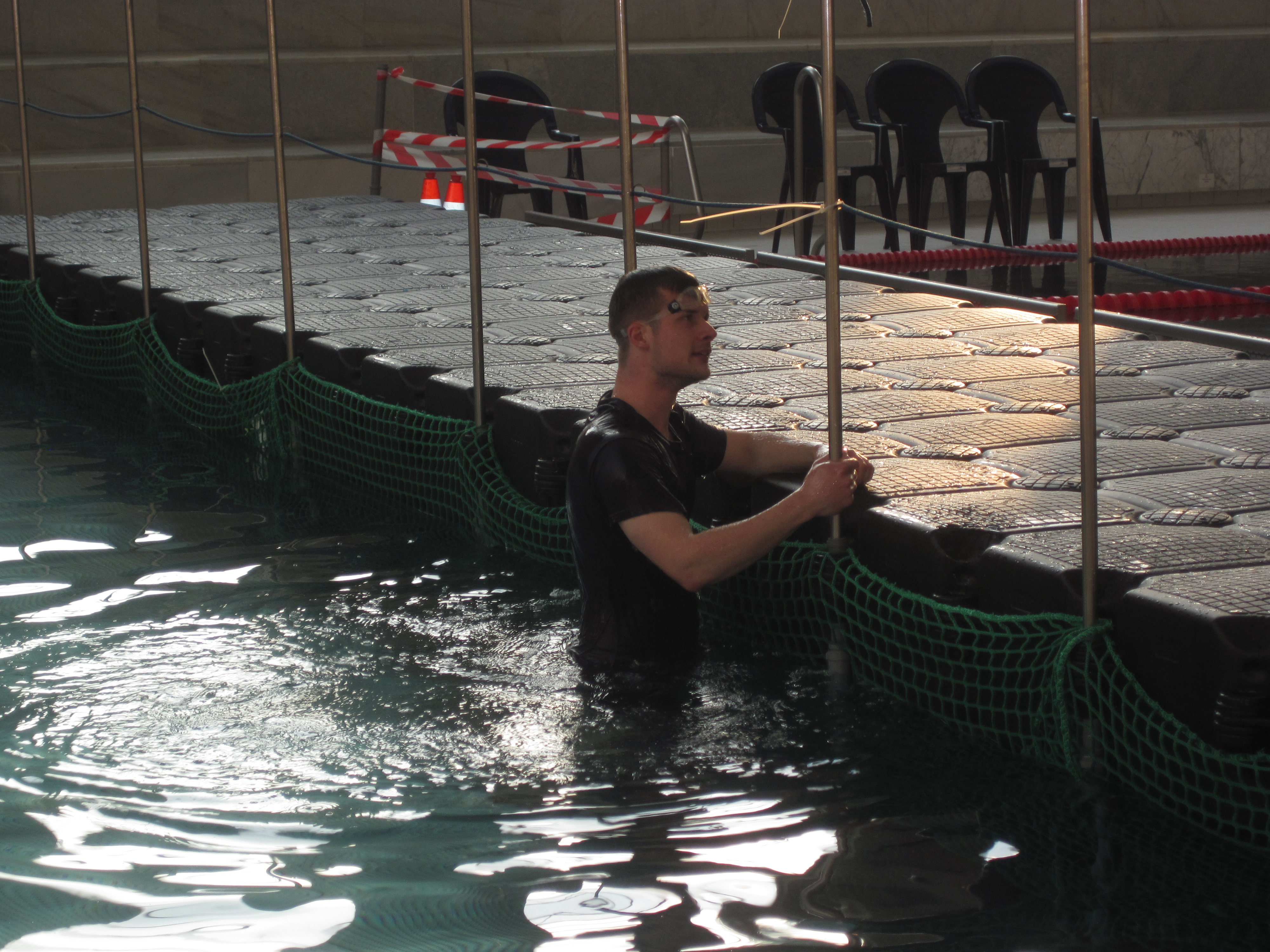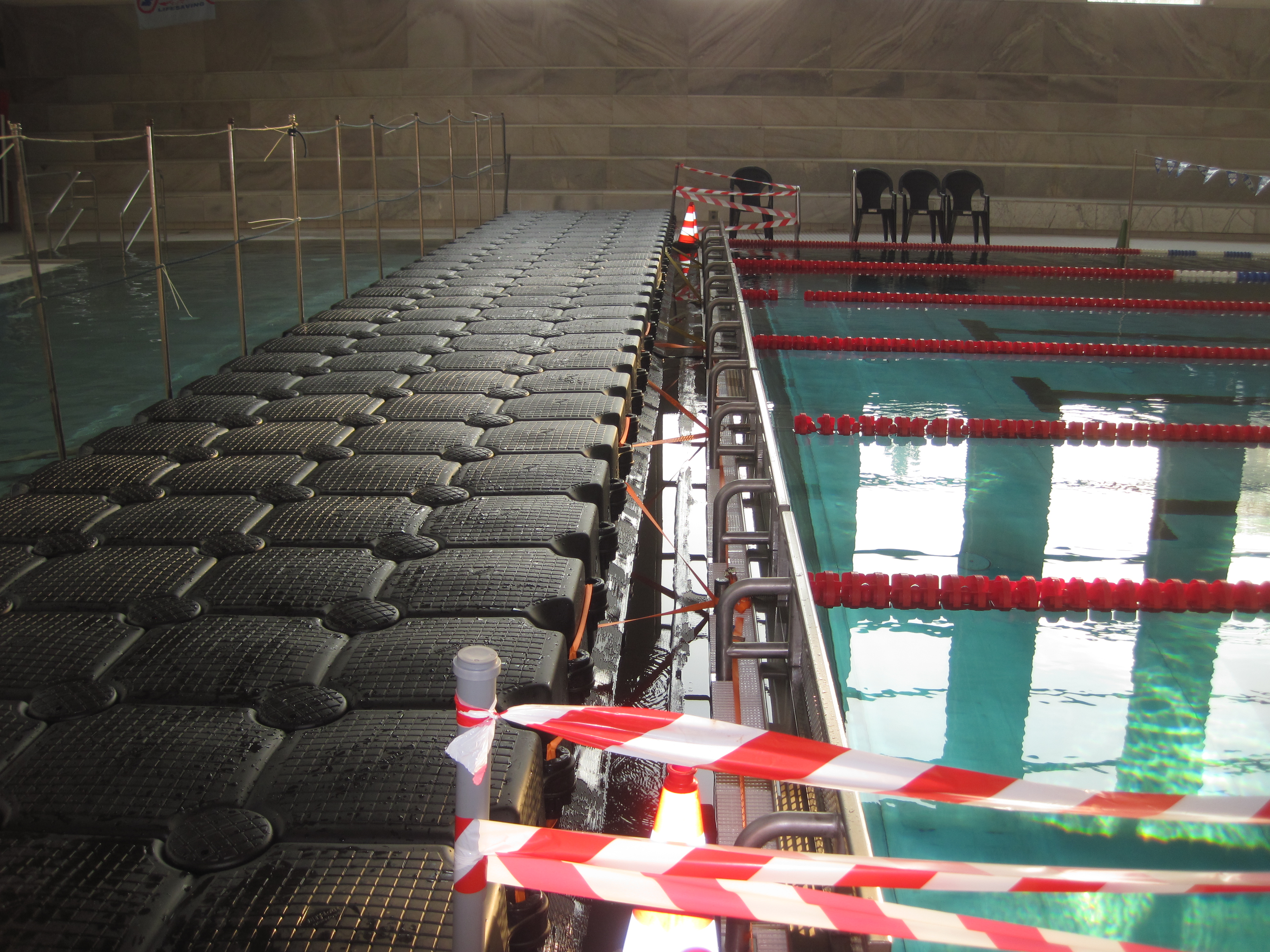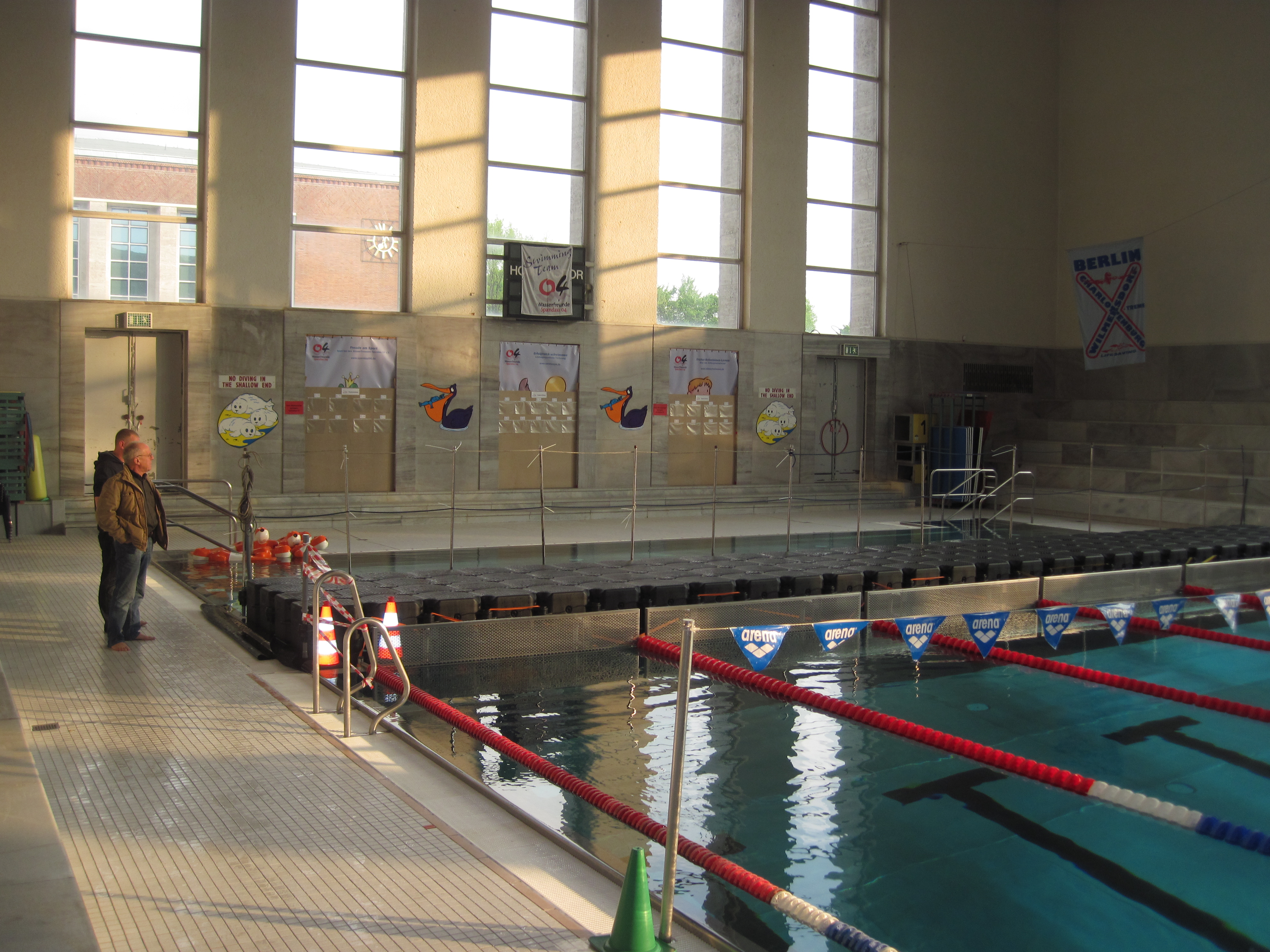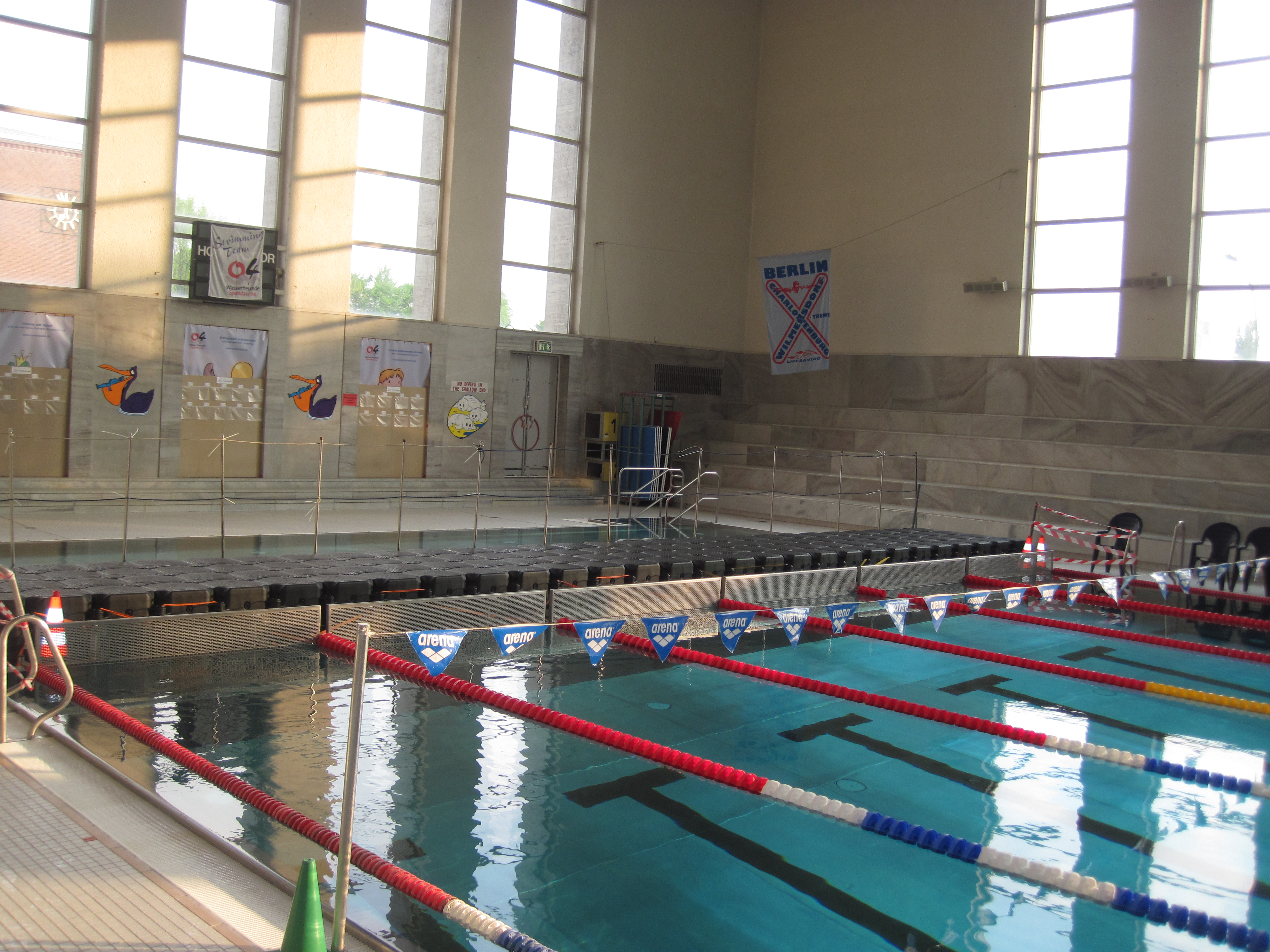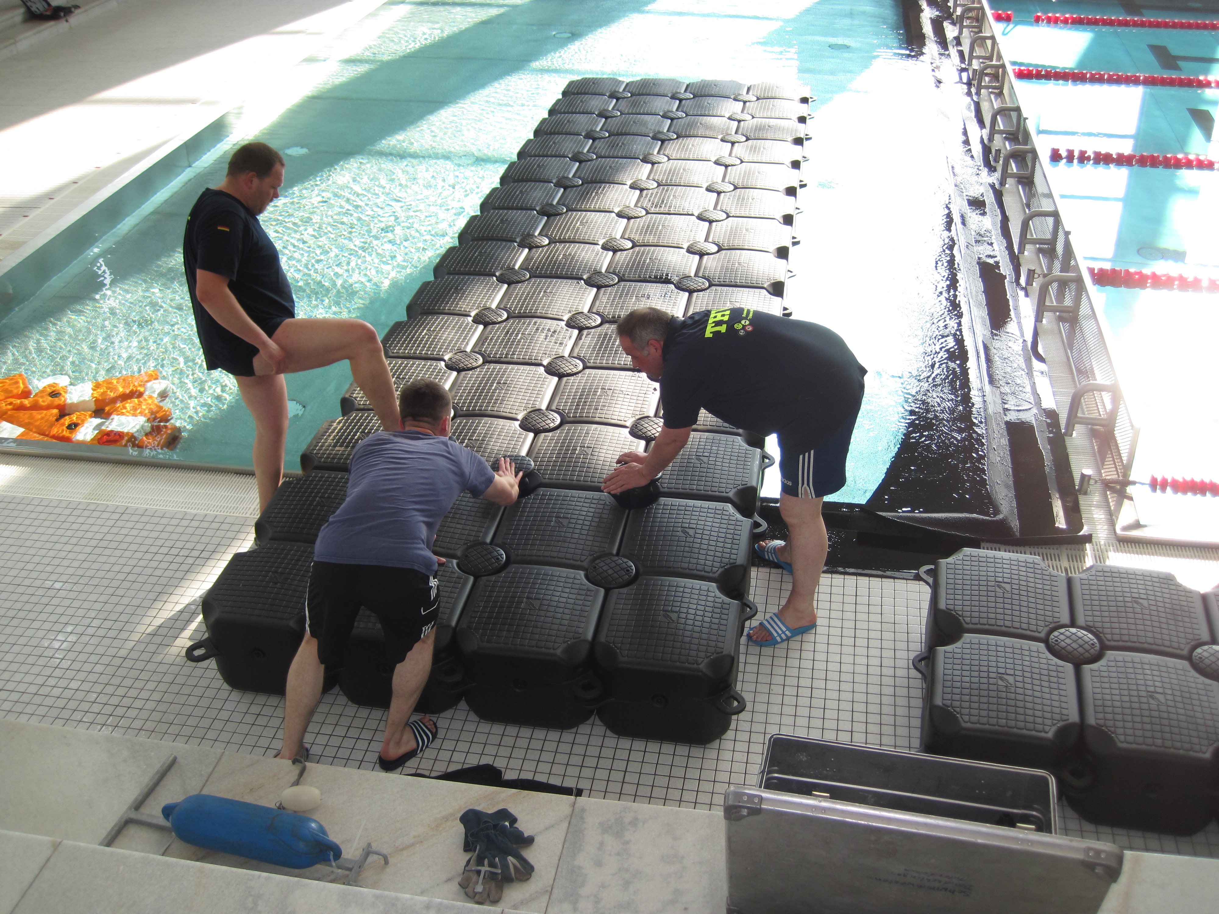 Der Ortsverband Berlin Charlottenburg – Wilmersdorf stellte Zelte und Transportkapazität zur Verfügung. Die Verbreiterung des Steges zwischen dem Schwimmer- und dem Nichtschwimmerbecken übernahmen die Jetfloat®-Spezialisten unseres Ortsverbandes. Aus den Schwimmelementen wurde im Becken ein Steg errichtet und mit Netzen unter Wasser gesichert. Die Plattform hatte eine Länge von 14,5 m und eine Breite von 2m.