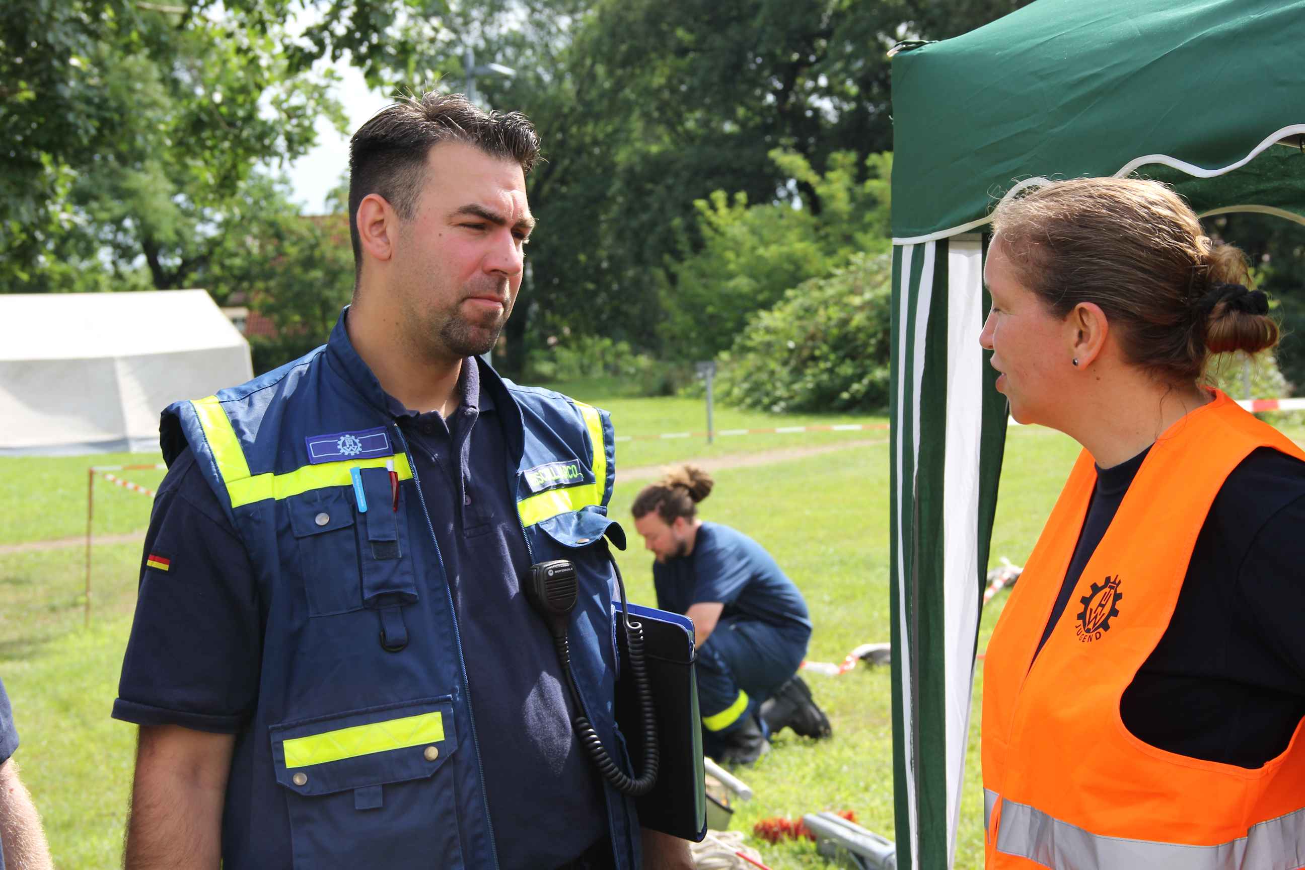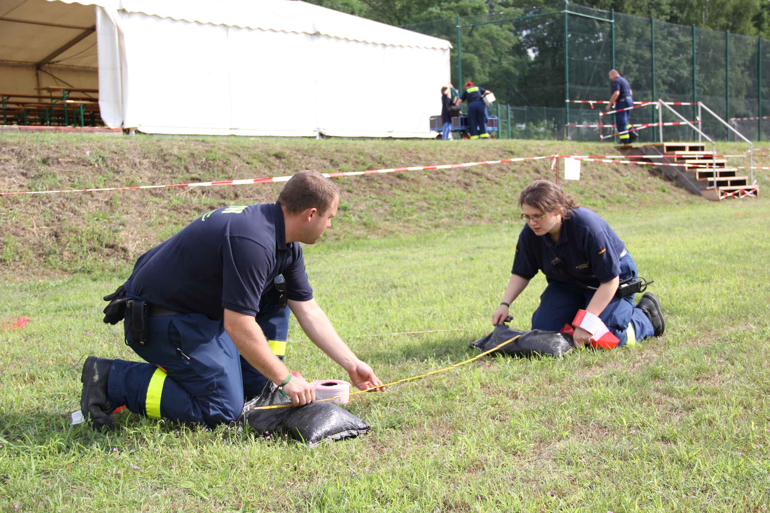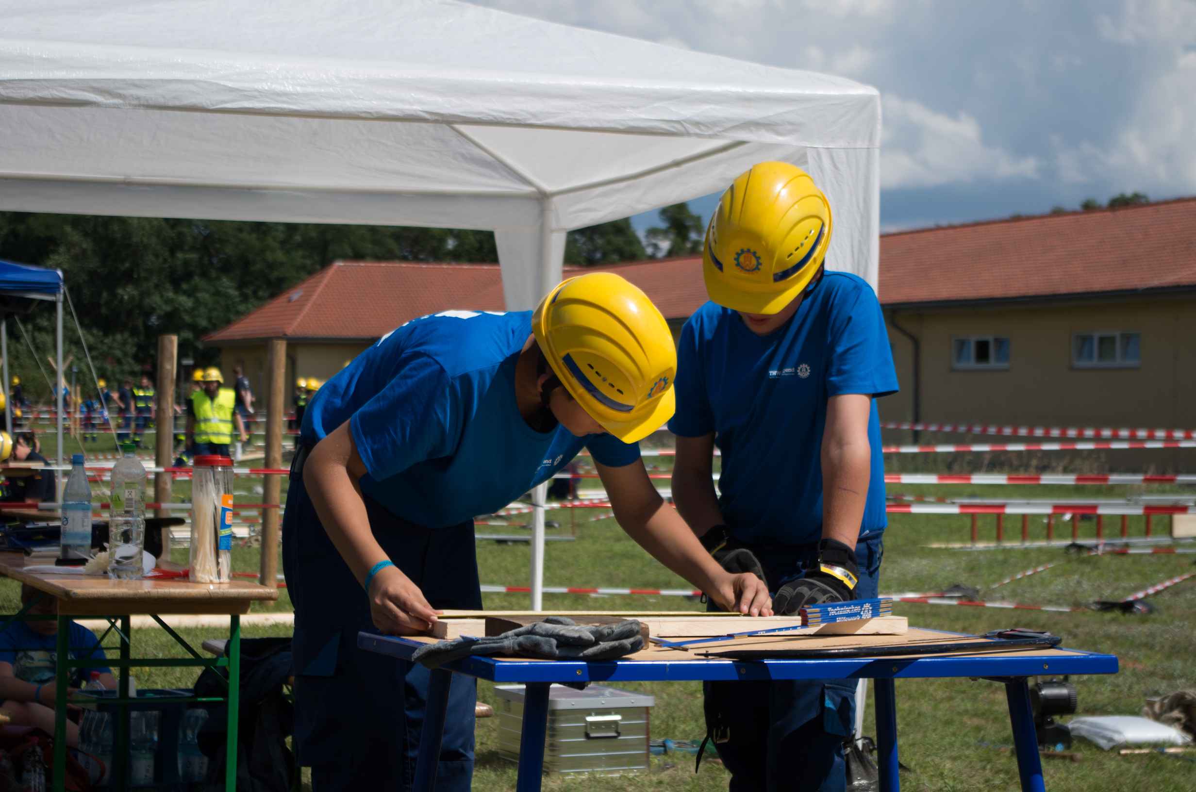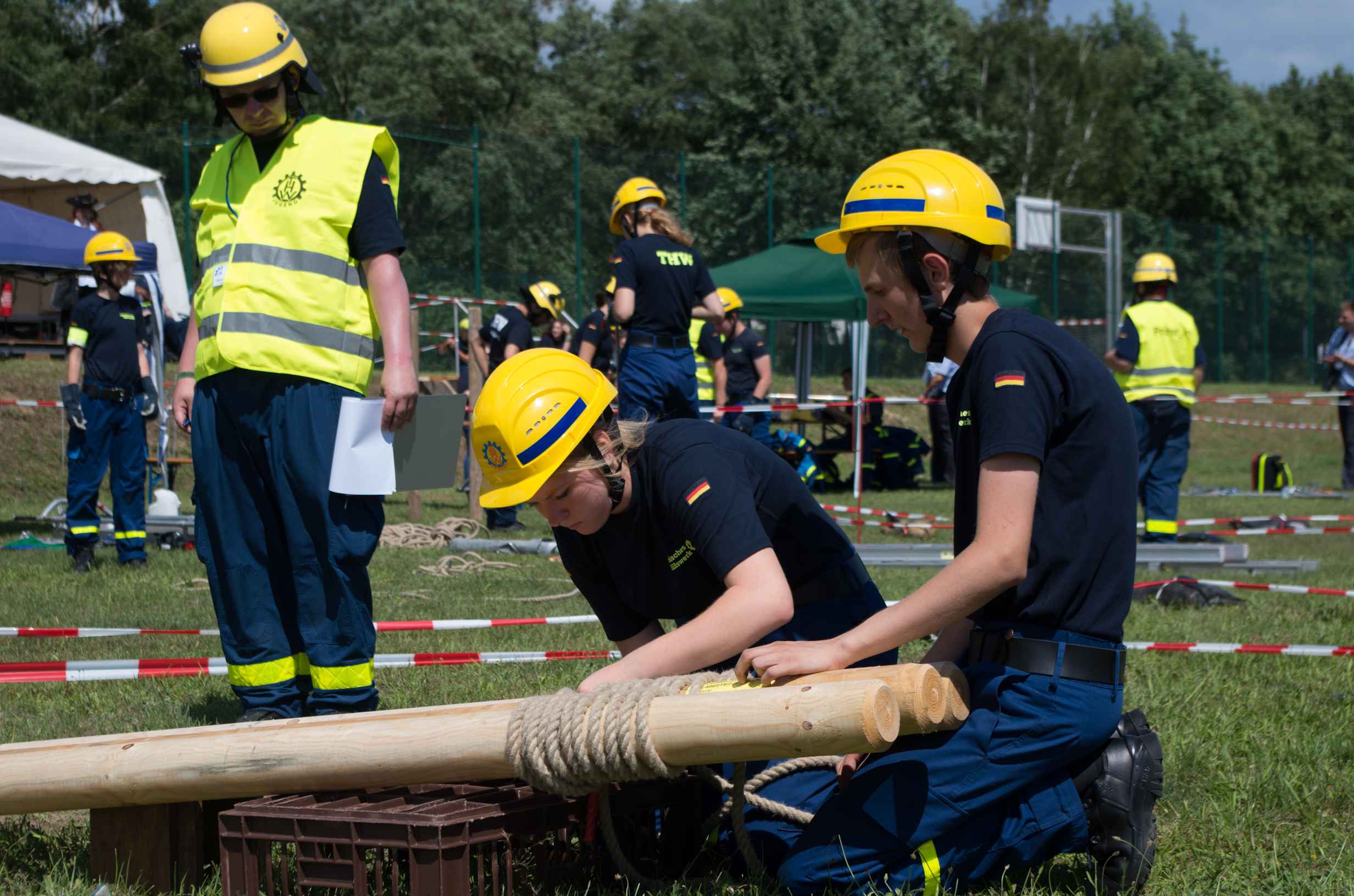 Damit für die Jugendlichen der Spaß im Vordergrund stehen kann, kümmern sich die THW-Ortsverbände aus der Region im Auftrag der Landesjugend während der gesamten Woche darum, dass rund um das Zeltlager alles läuft. Deshalb war die erste Bergungsgruppe unsere zweiten Technischen Zuges am Freitag und Samstag gerne mit von der Partie, um beim Landeswettkampf zu unterstützen. Im praktischen Teil dieses spielerischen Wettbewerbs mussten die Jugendlichen aus verschiedenen Materialien vom Gerätekraftwagen (GKW) I ein Schiff bauen, mit dem sie dann unter Einsatz ihres gesamten Geschicks einen auf dem Rasen abgesteckten, imaginären Fluss entlangsegeln sollten. Das Abstecken der nötigen Wettkampfbahnen übernahmen dabei Helferinnen und Helfer aus Tempelhof-Schöneberg und unserem Ortsverband. Außerdem konnten wir denjenigen Gruppen, denen es noch an dem ein oder anderen Baumaterial fehlte, mit der Ausrüstung unseres GKW I zur Seite stehen.