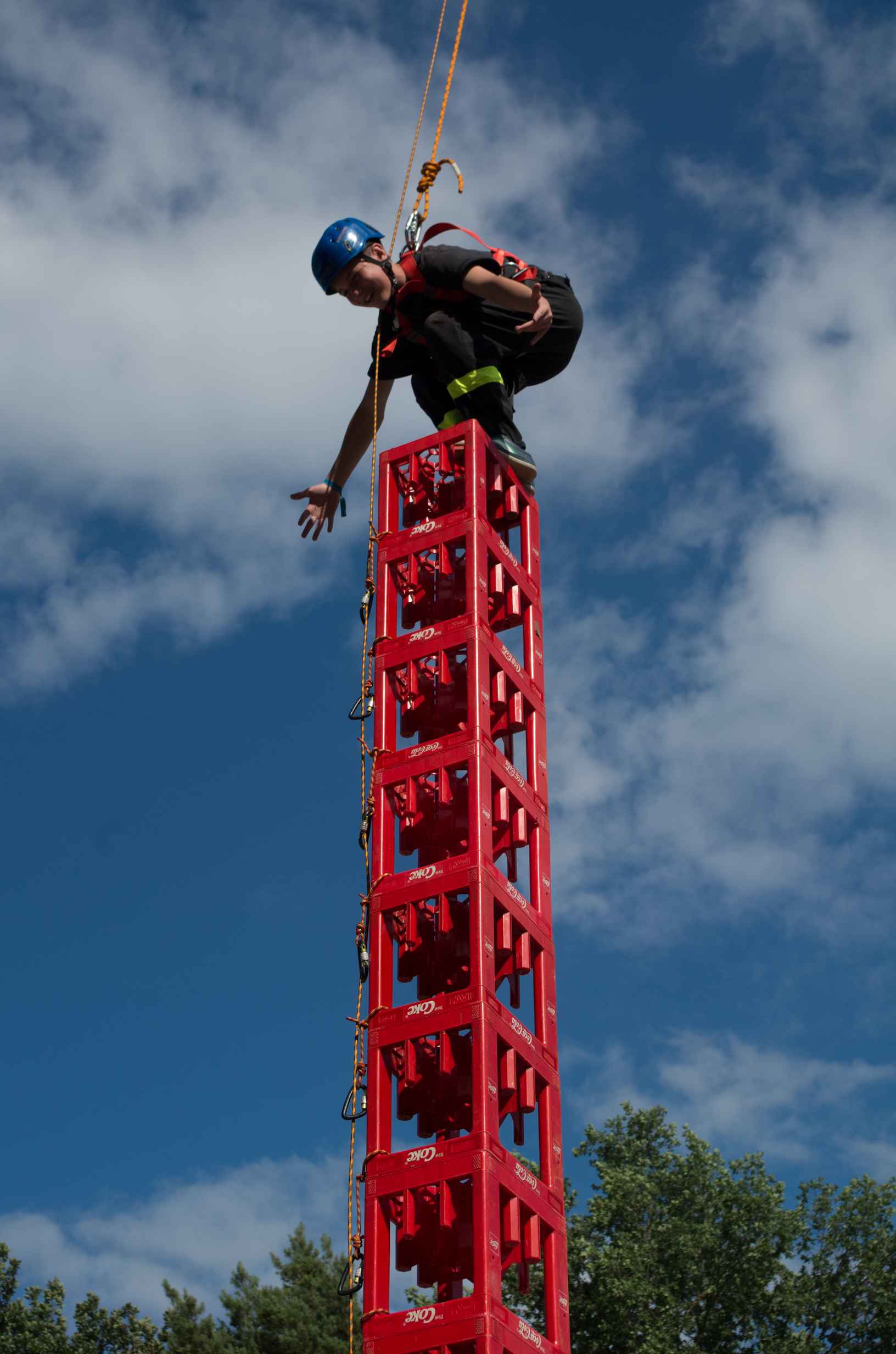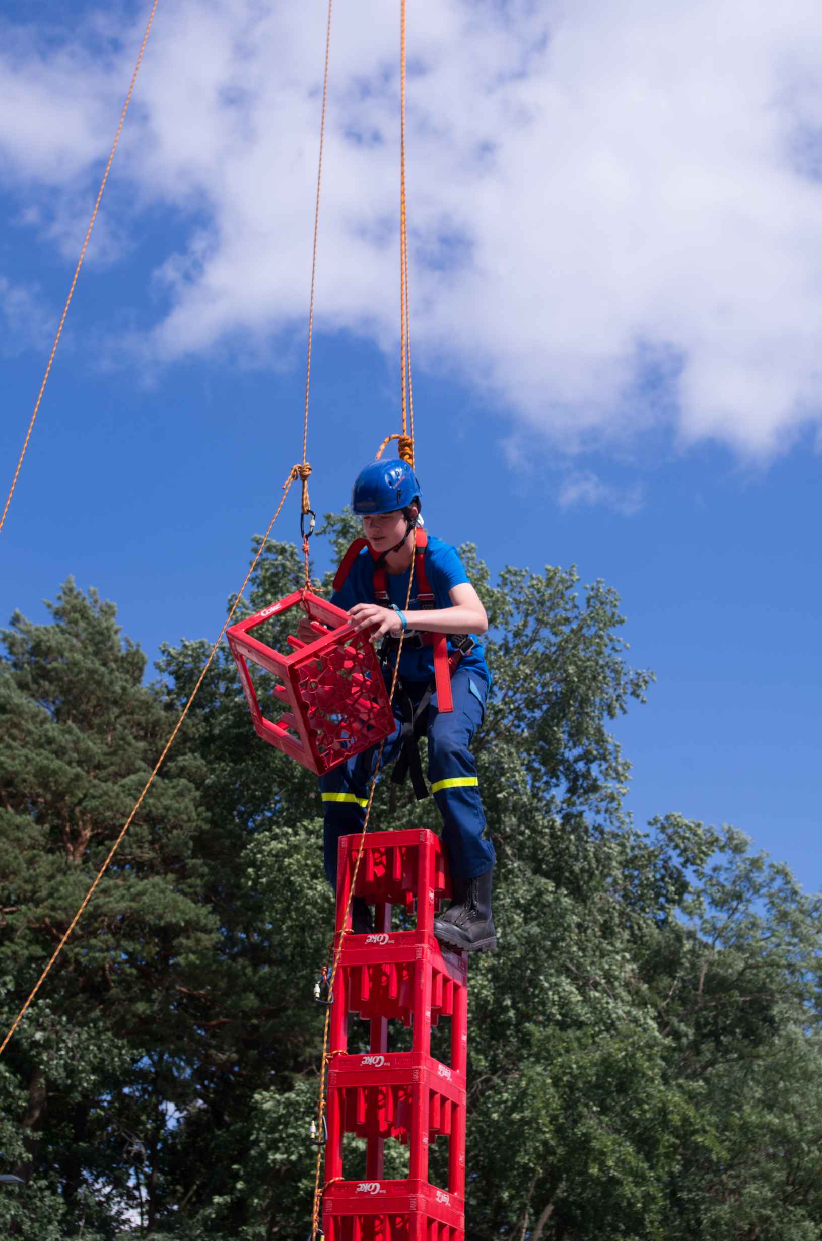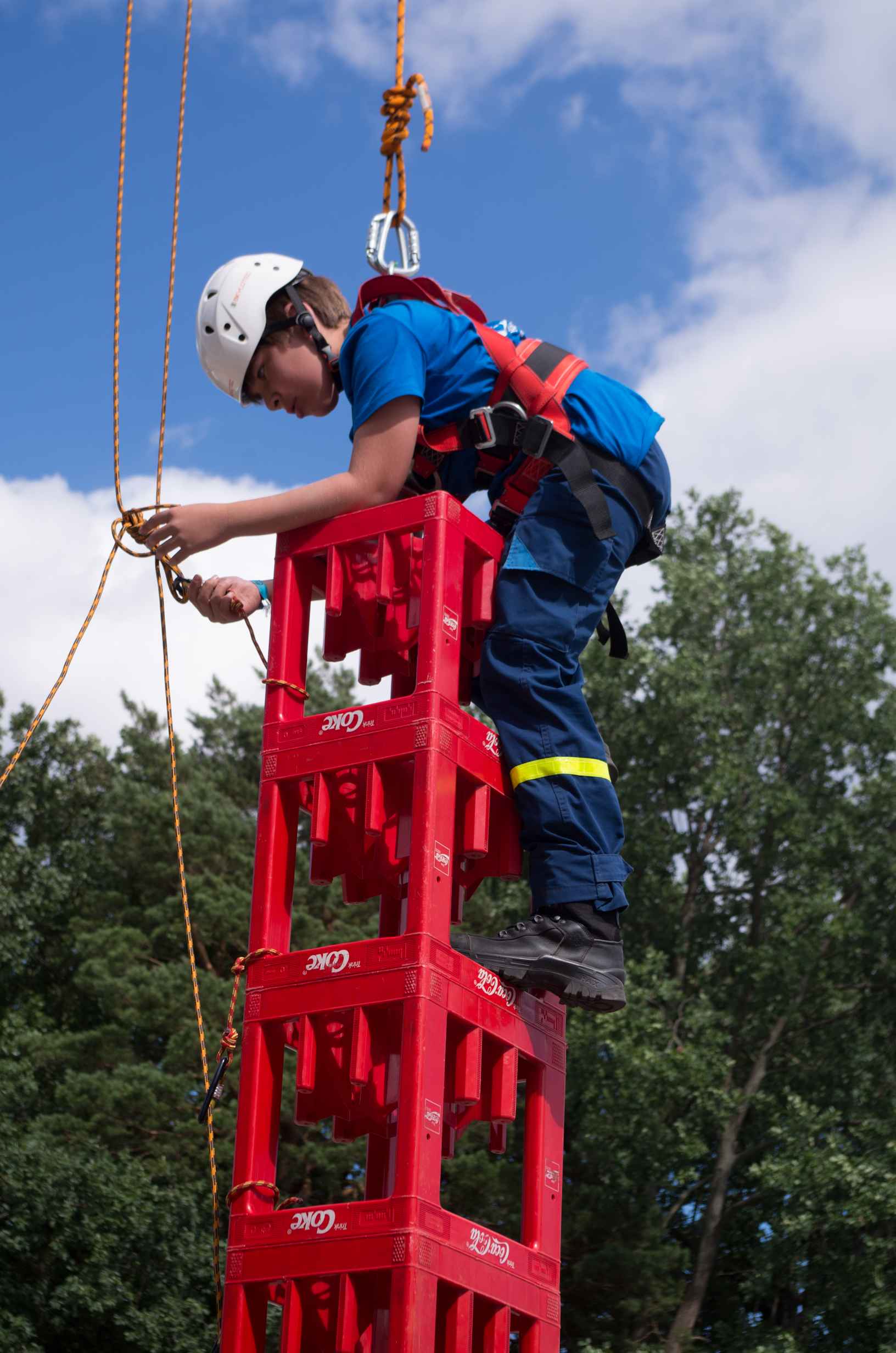 Als besonderes Highlight konnten wir, gemeinsam mit dem Ortsverband Charlottenburg-Wilmersdorf, den Mädchen und Jungen im Camp am Sonntag Kistenstapeln anbieten. An einem Sicherungsseil hängend, galt es für sie einen Turm aus Getränkekisten zu bauen. Die Schwierigkeit: Mit jeder weiteren Kiste mussten sie in noch luftigeren Höhen arbeiten. Neben Schwindelfreiheit war dabei besondere Geschicklichkeit gefragt.