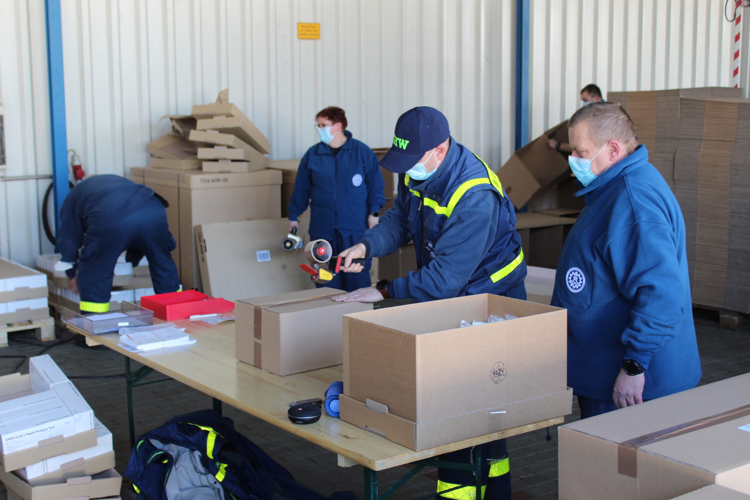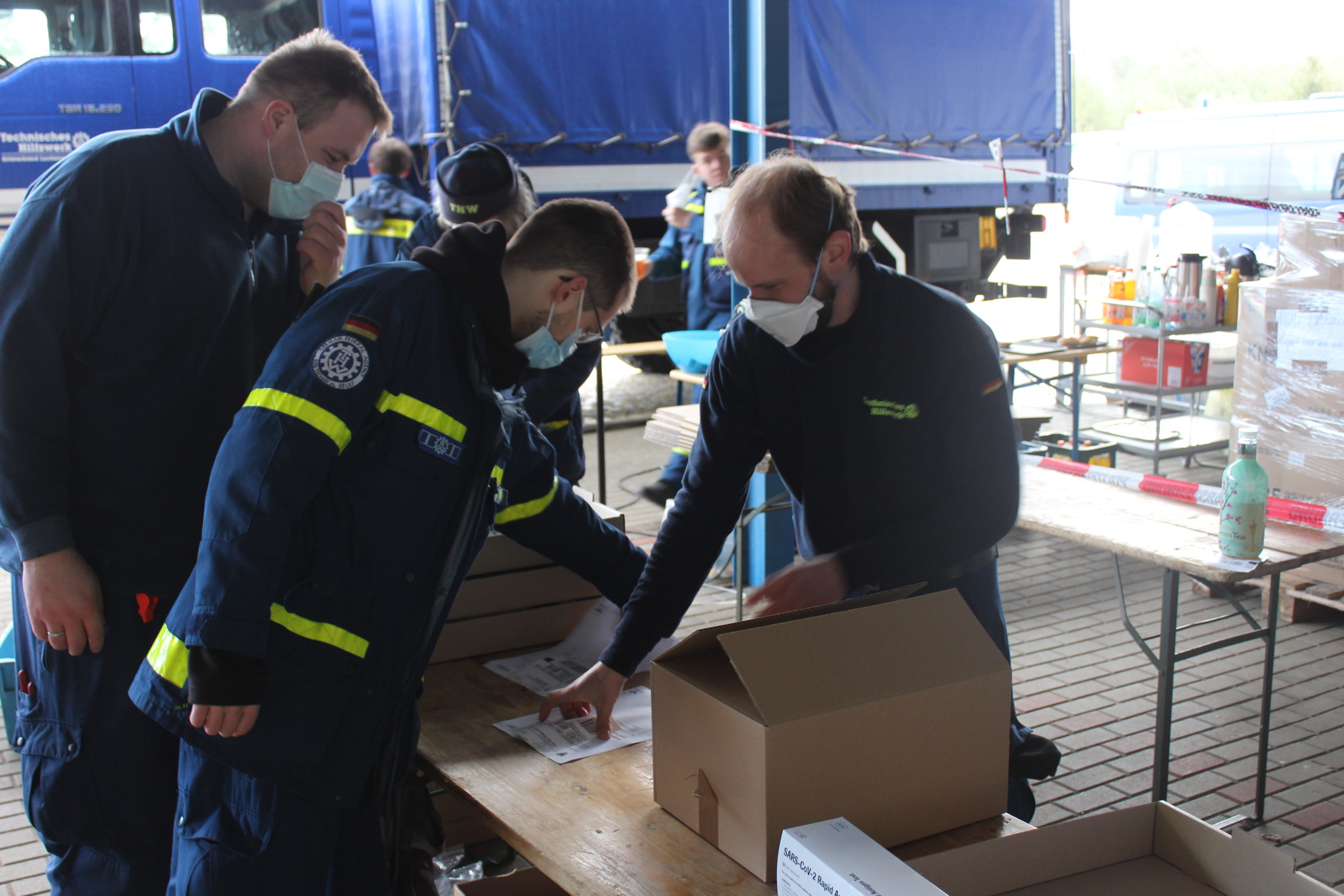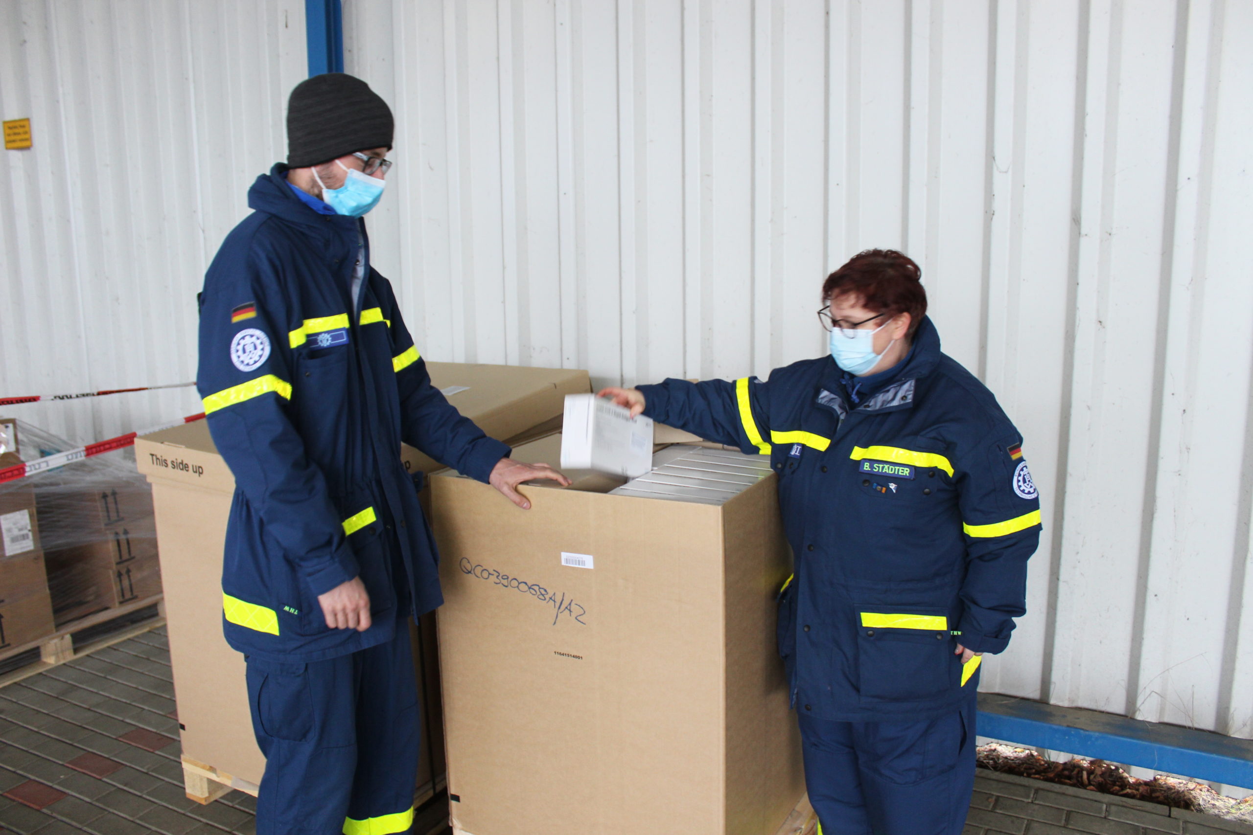 Am 11. und 12.02.2021 packten 35 THW-Helferinnen und THW-Helfer diese wichtigen Utensilien für Brandenburger Schulen im Zentrallager des Zentraldienstes der Polizei Brandenburg zusammen und übergaben sie an private Lieferdienste.
