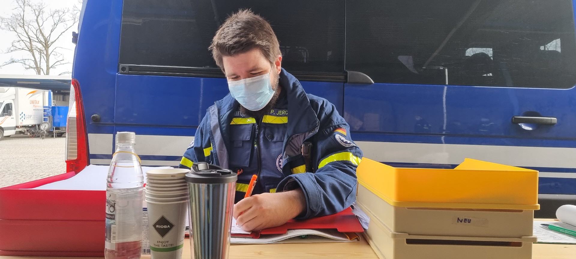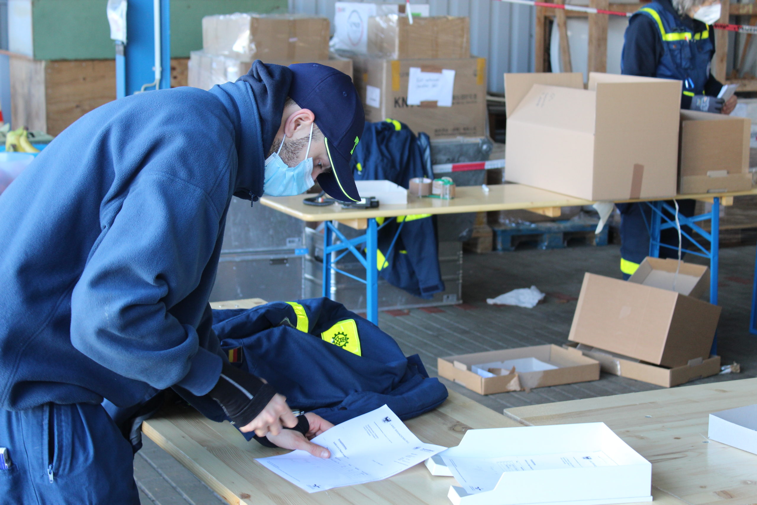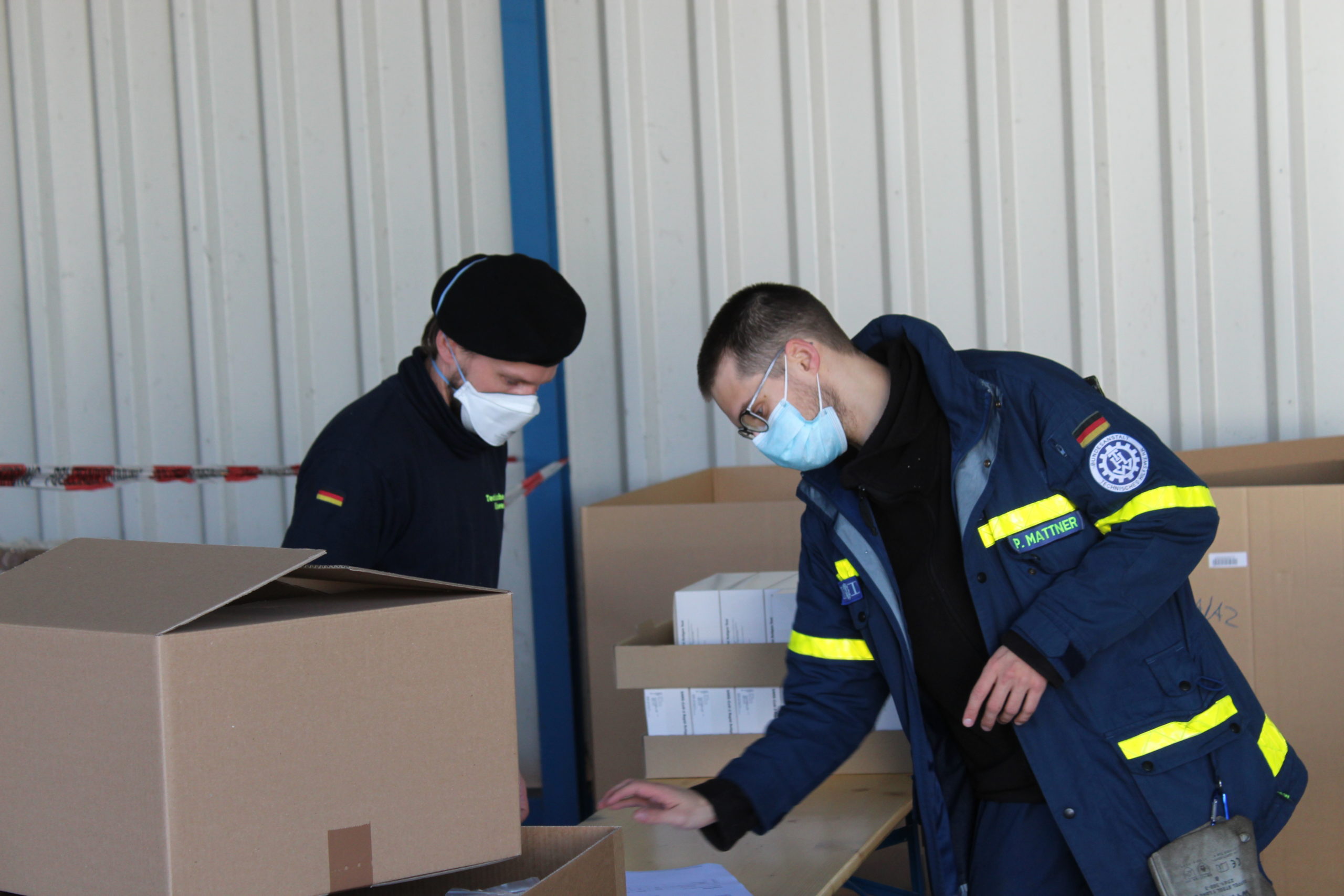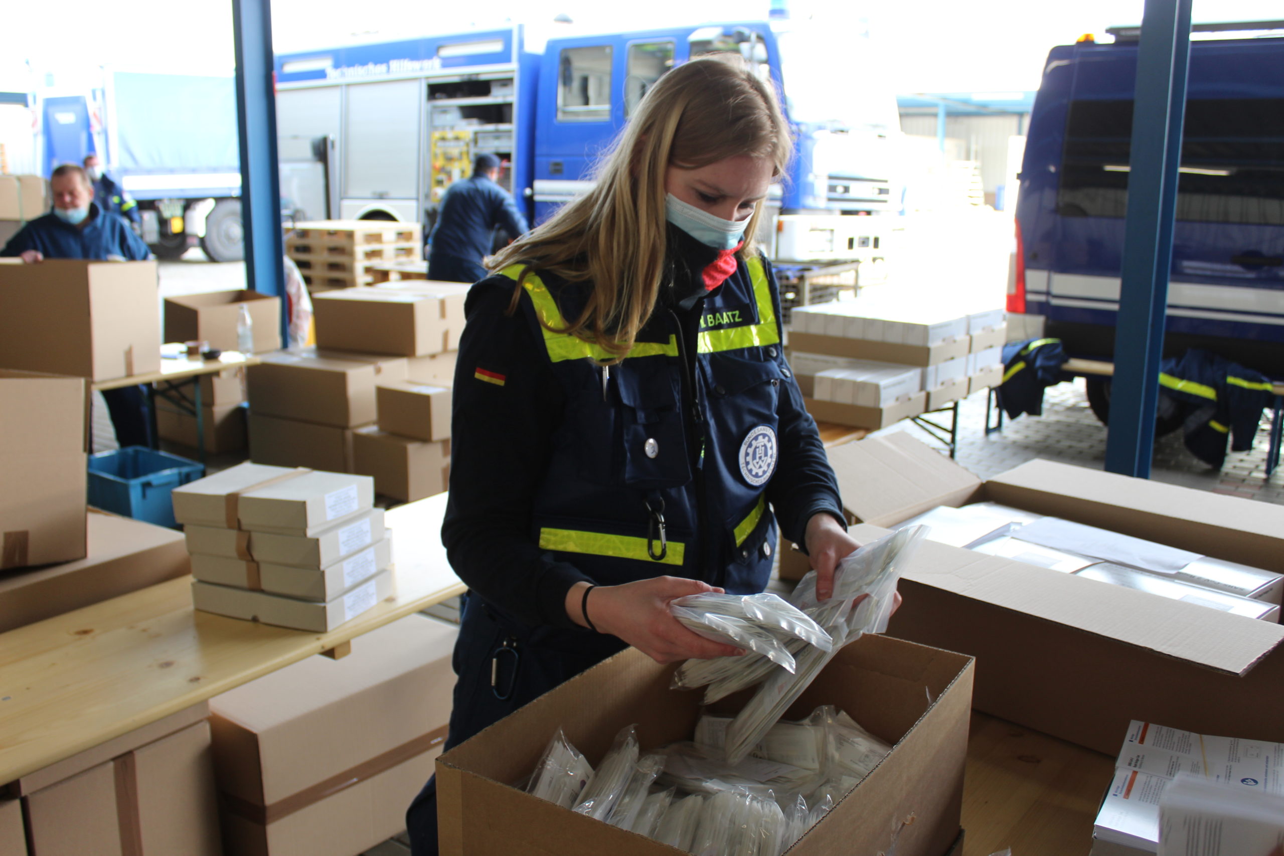 Am 11. und 12.02.2021 packten 35 THW-Helferinnen und THW-Helfer diese wichtigen Utensilien für Brandenburger Schulen im Zentrallager des Zentraldienstes der Polizei Brandenburg zusammen und übergaben sie an private Lieferdienste.