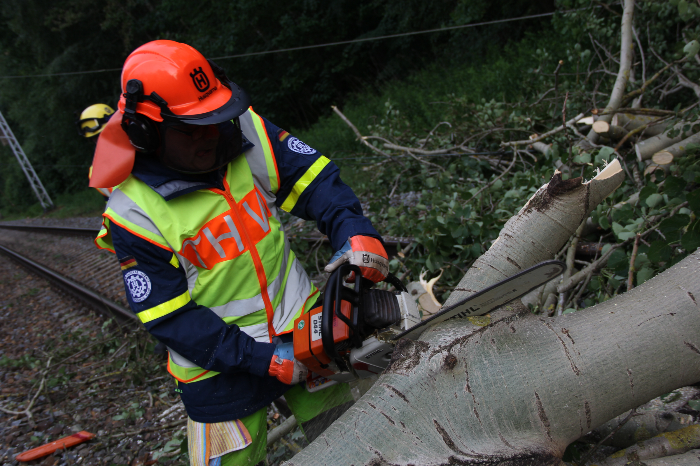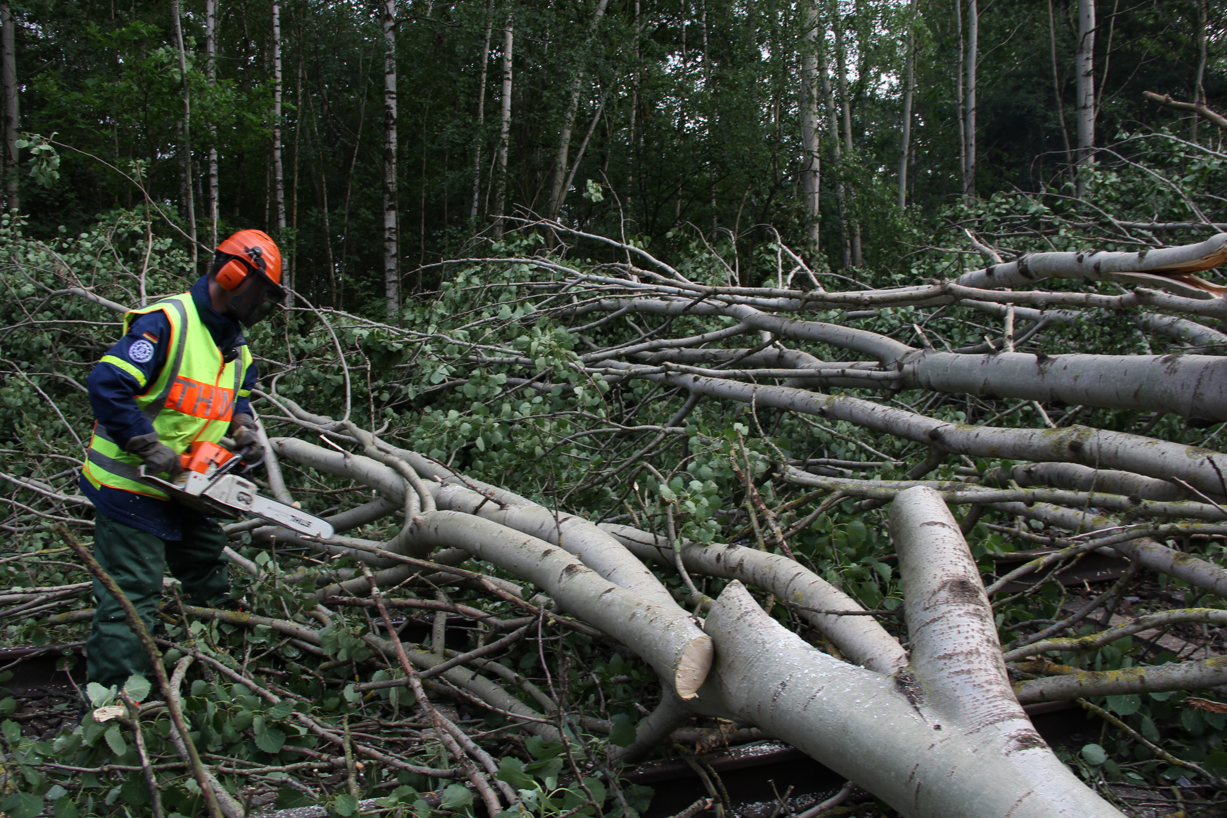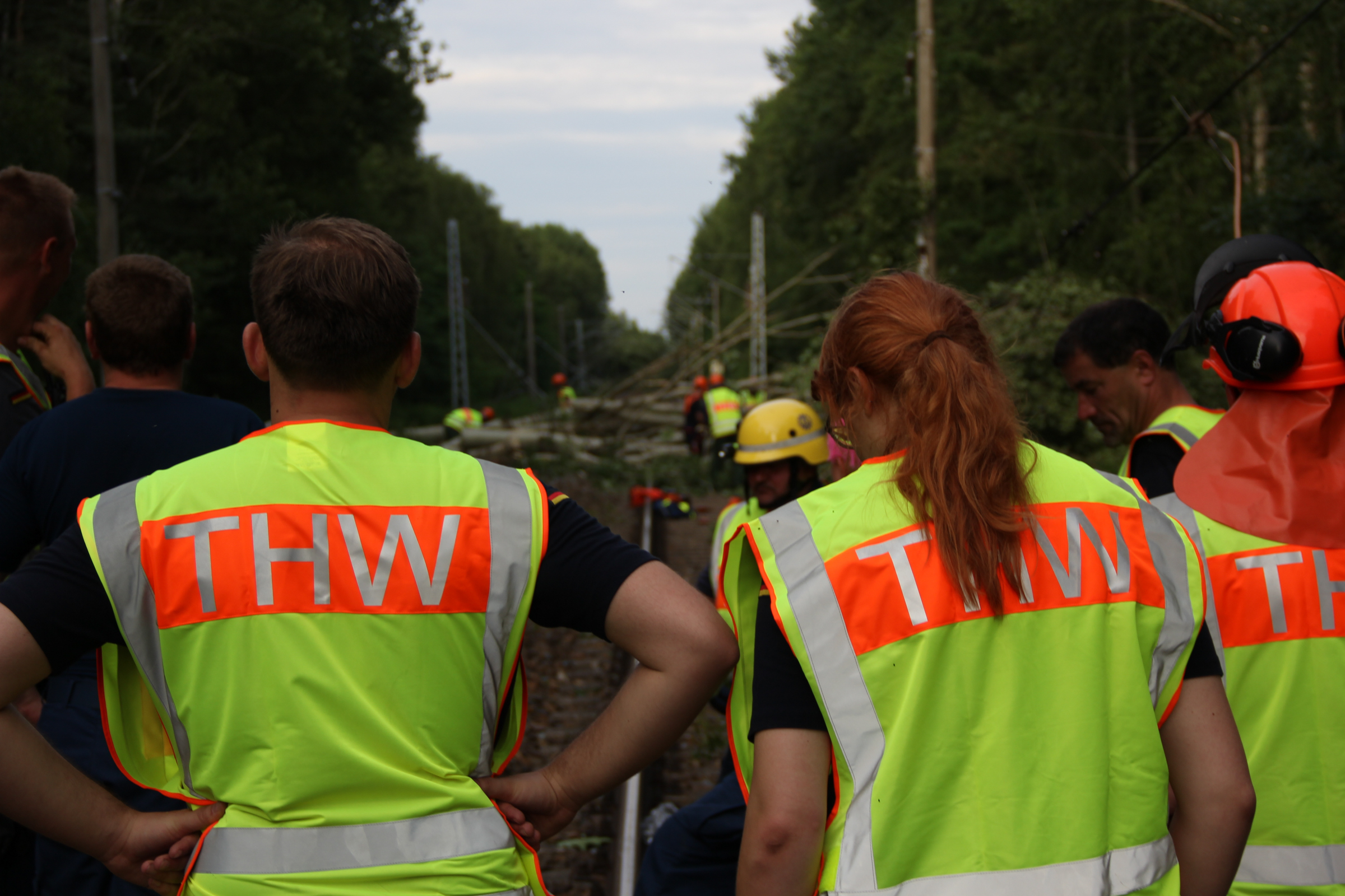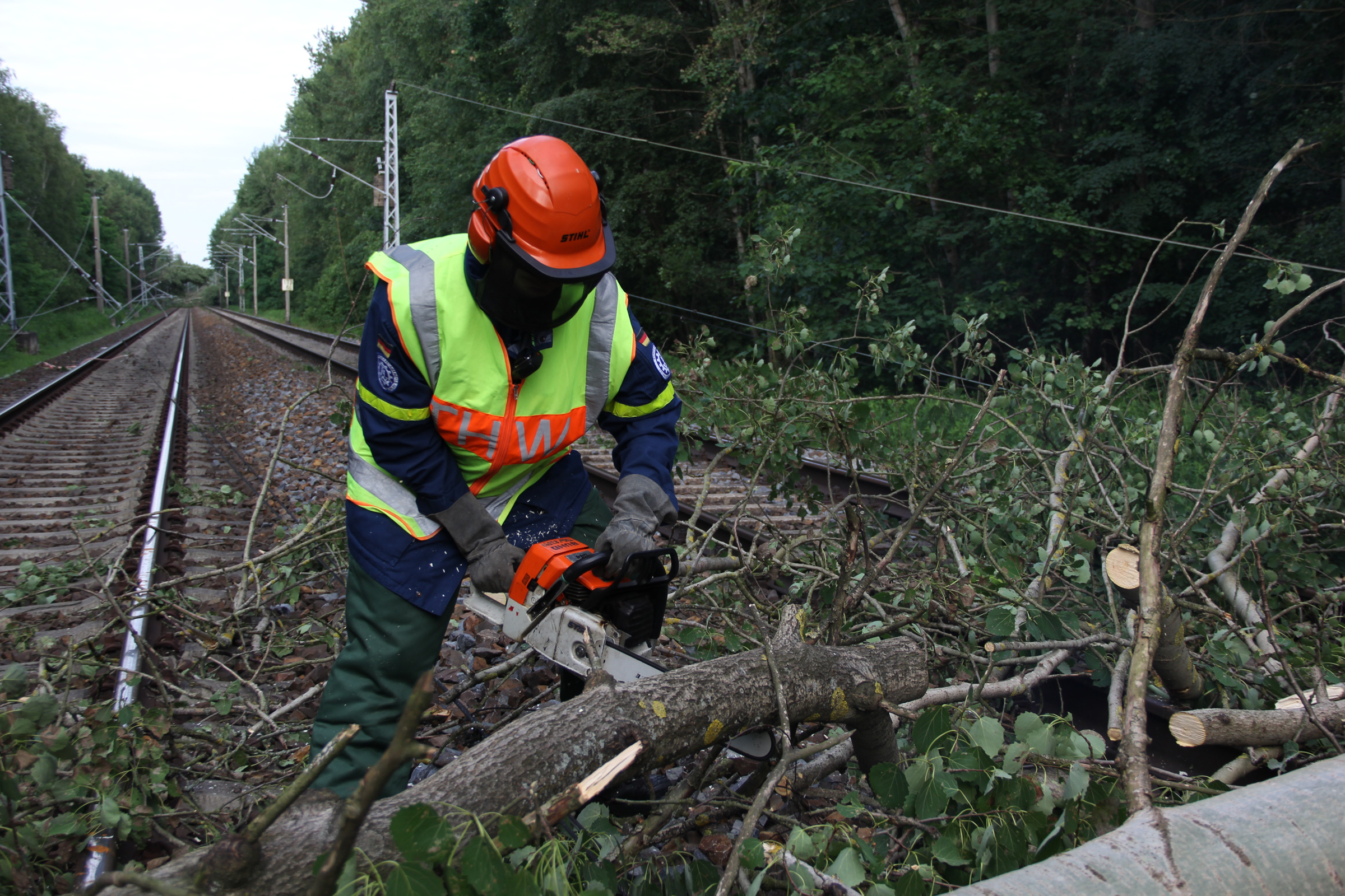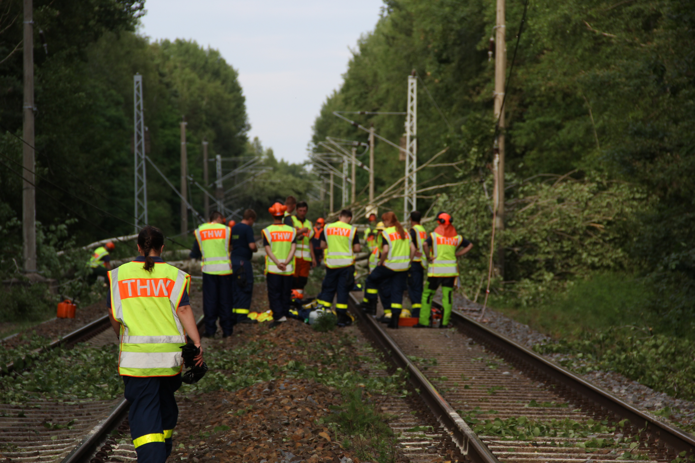 Ab Freitagmorgen waren deshalb fünf Ortsverbände, darunter auch unserer, aus den Geschäftsführerbereichen Frankfurt/Oder und Potsdam gemeinsam mit dem Notfallmanagement der Deutschen Bahn im Einsatz. Während 27 Helferinnen und Helfer die Bäume mit Kettensägen zerlegten und aus dem Gleisbereich schafften, reparierte parallel ein Spezialzug der Bahn die Oberleitungen. Da Bäume auf einer Strecke von rund drei Kilometern beseitigt werden mussten, dauerte der Einsatz bis in die späte Nacht.