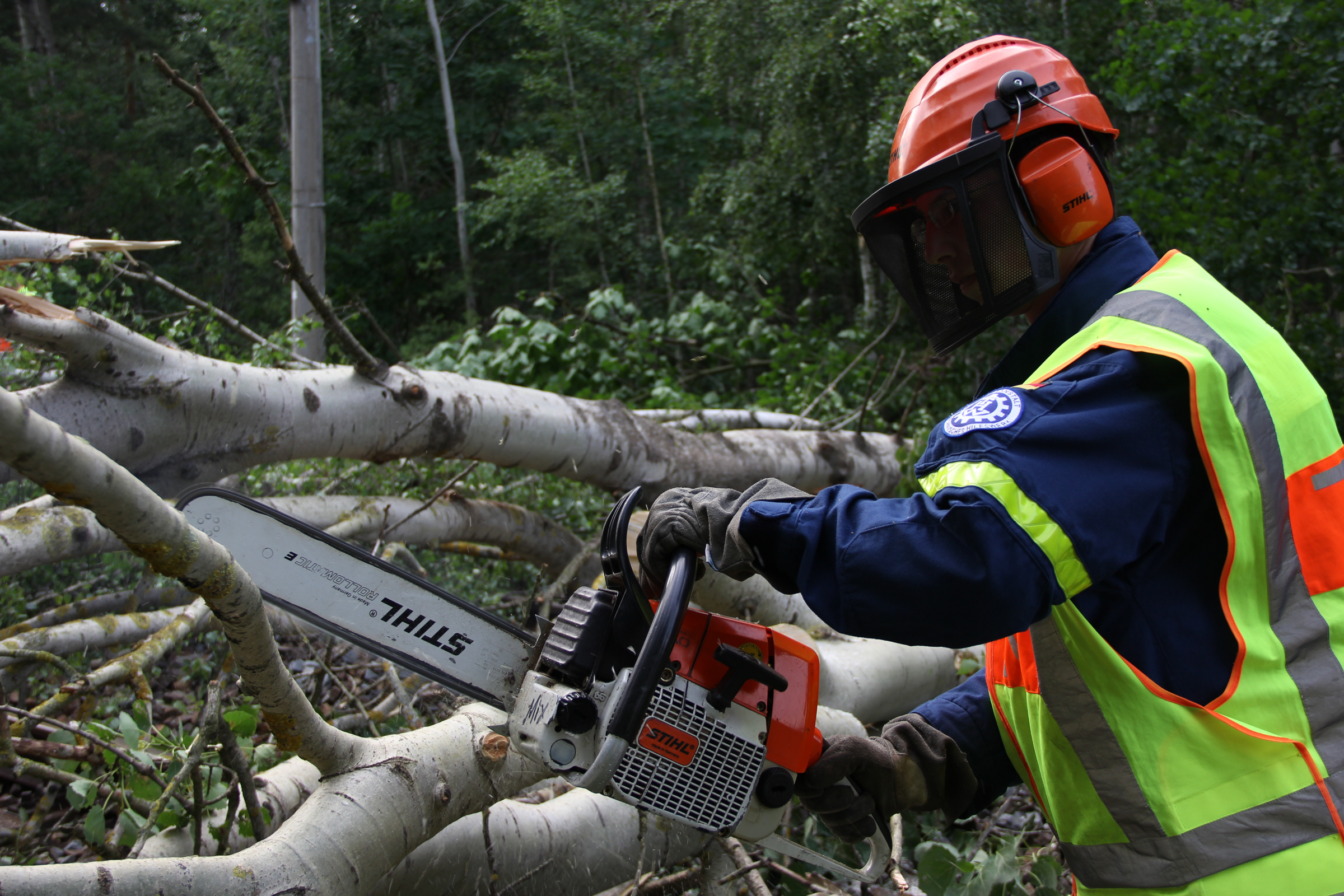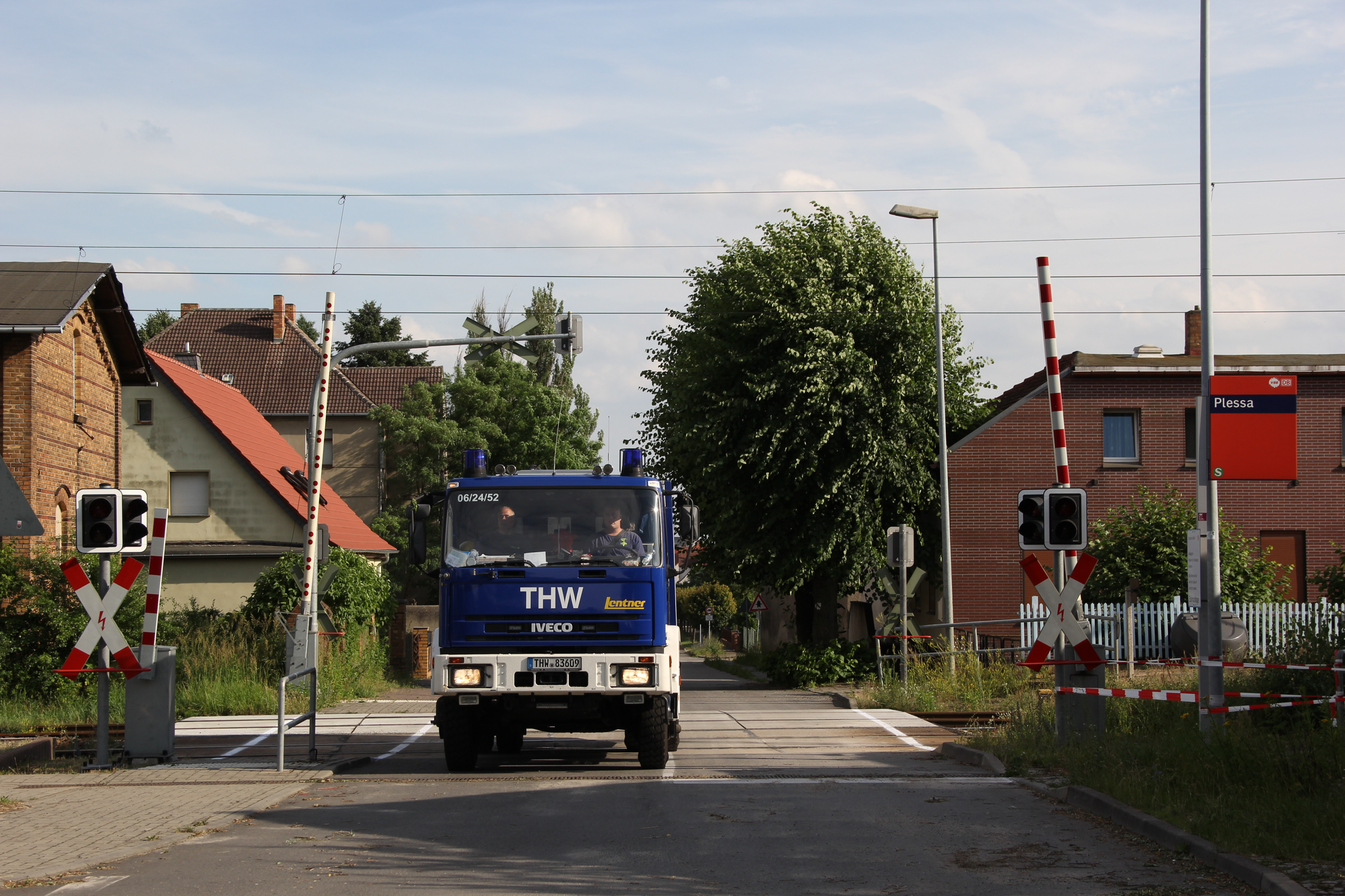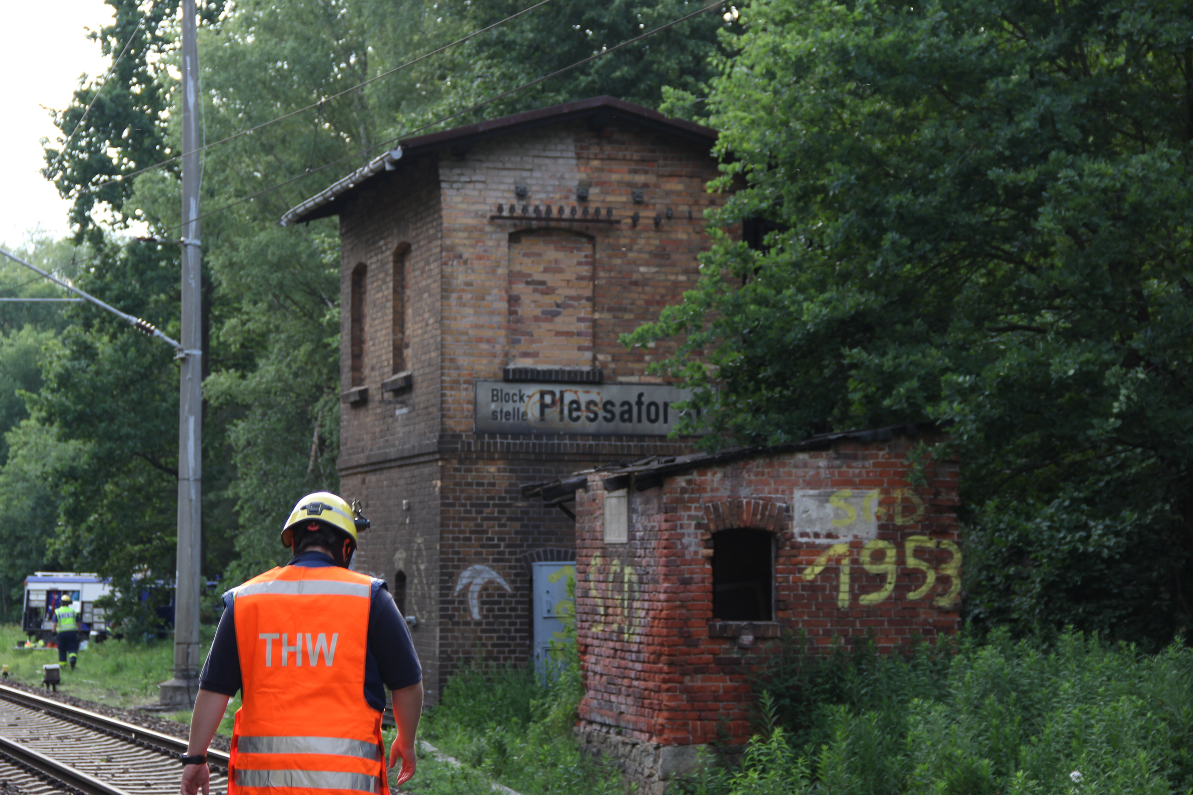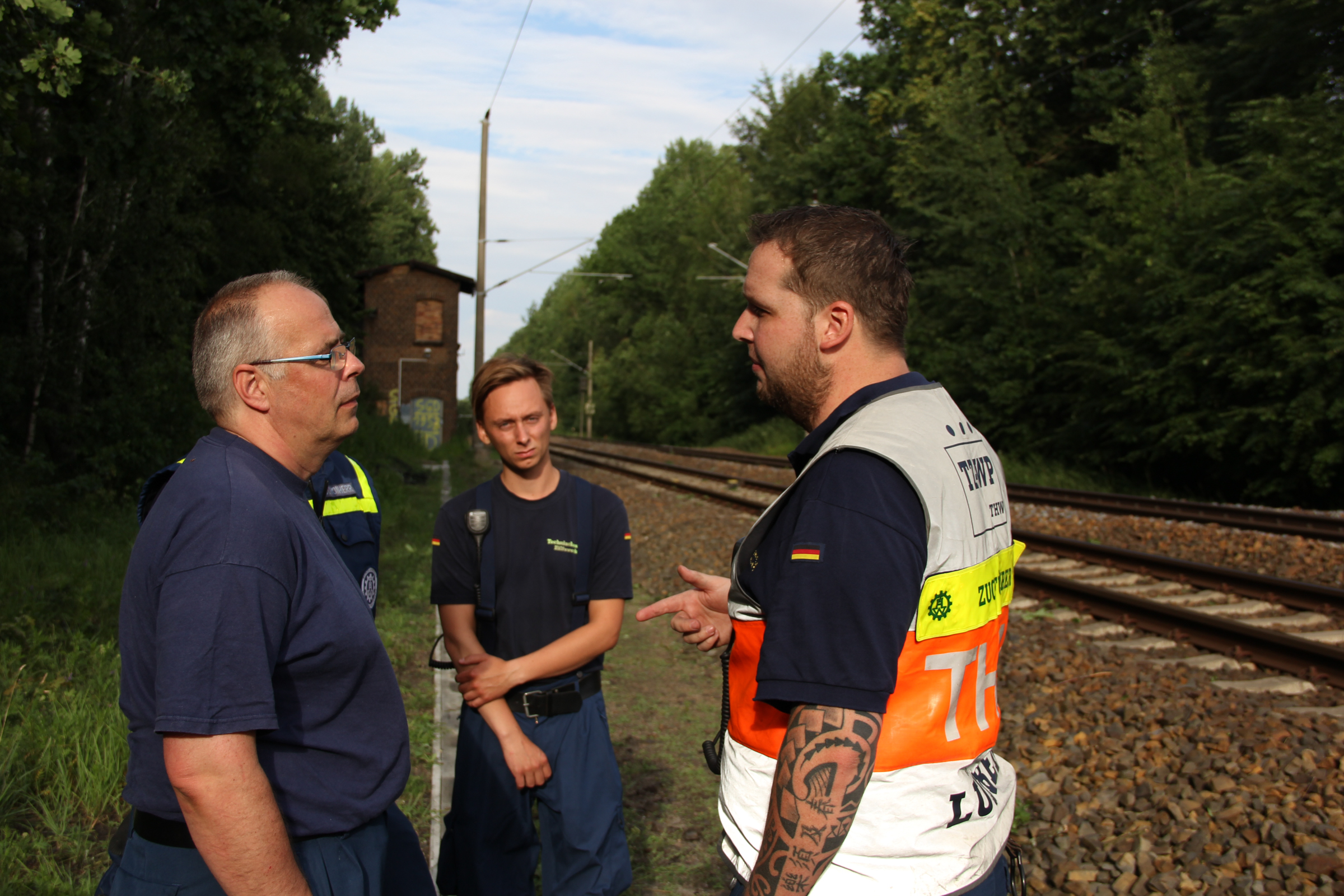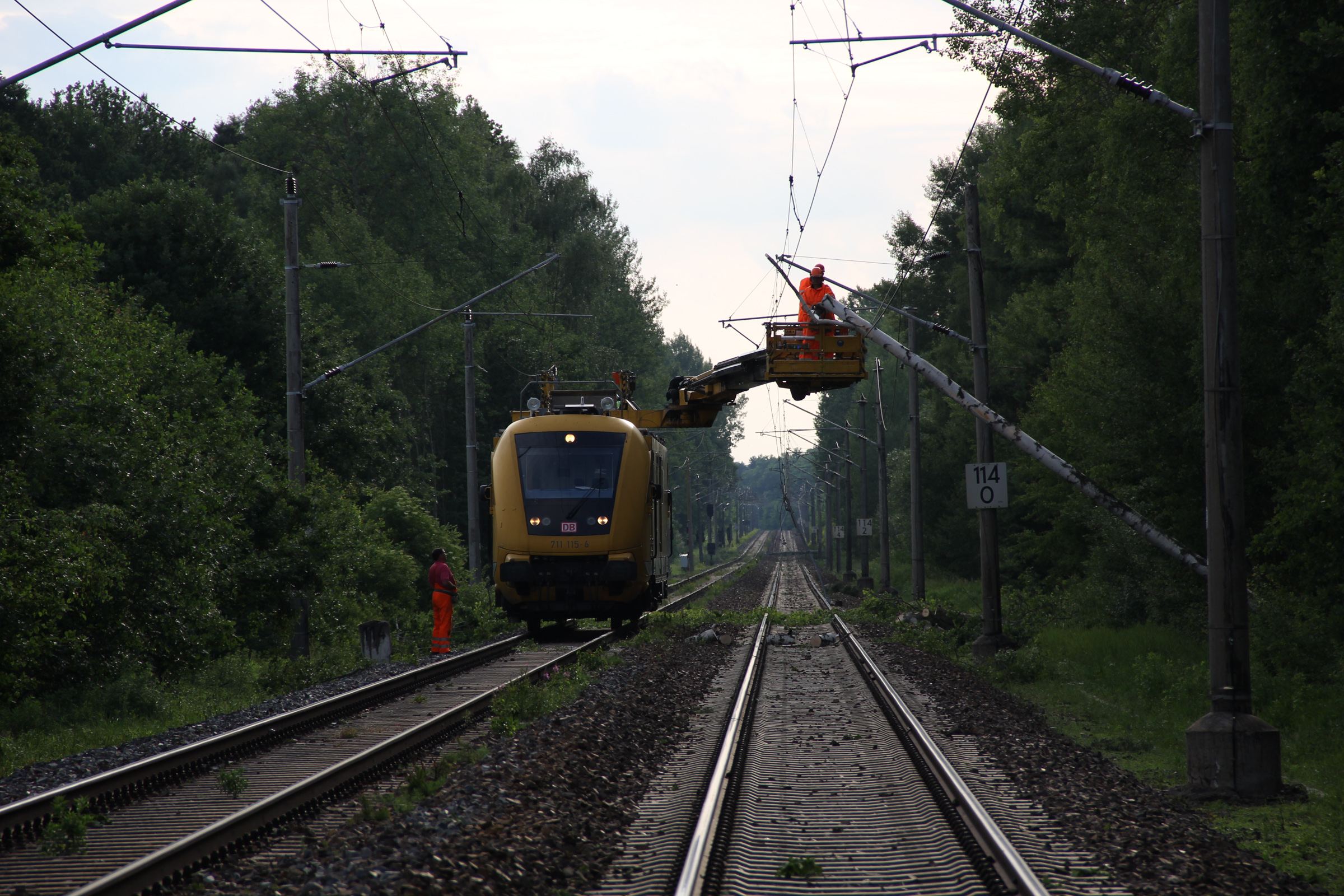 Ab Freitagmorgen waren deshalb fünf Ortsverbände, darunter auch unserer, aus den Geschäftsführerbereichen Frankfurt/Oder und Potsdam gemeinsam mit dem Notfallmanagement der Deutschen Bahn im Einsatz. Während 27 Helferinnen und Helfer die Bäume mit Kettensägen zerlegten und aus dem Gleisbereich schafften, reparierte parallel ein Spezialzug der Bahn die Oberleitungen. Da Bäume auf einer Strecke von rund drei Kilometern beseitigt werden mussten, dauerte der Einsatz bis in die späte Nacht.