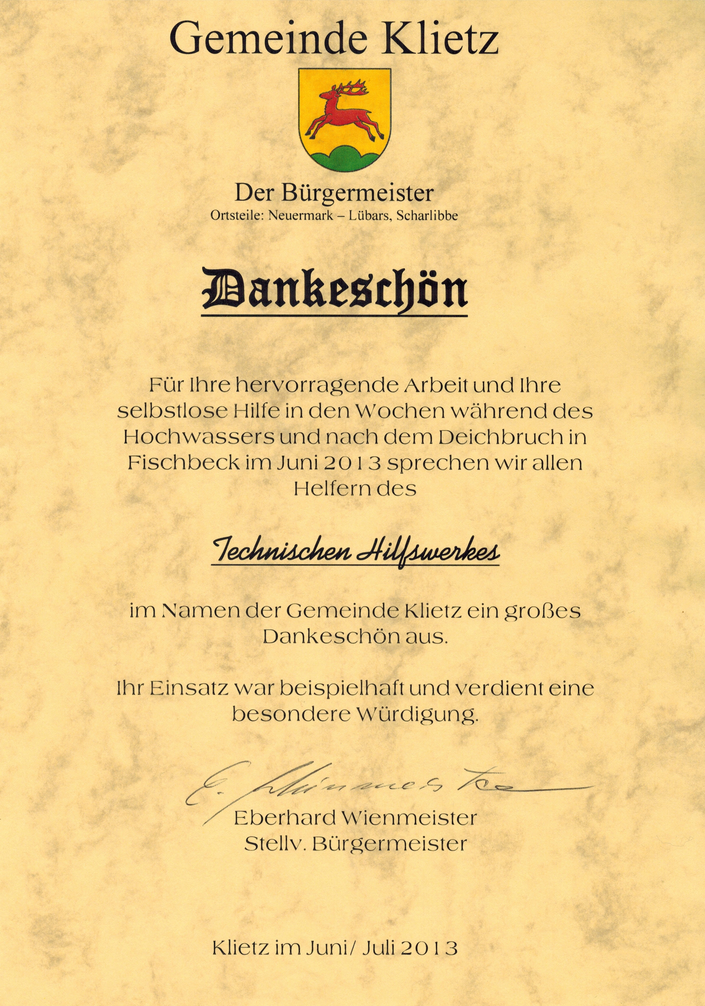 In dieser Region halfen Einsatzkräfte unseres Ortsverbandes über eine Woche bei der Abwehr der Wassermassen. Mit Hochleistungspumpen schützten sie Menschen und Schweine. Sie halfen, beträchtlichen Schaden von den Orten abzuwenden. Dafür bedankten sich Einwohner und Gemeinde nun mit einem Fest zu Ehren aller Helfer. Neben Kräften aus Steglitz-Zehlendorf waren auch die Ortsverbände Neuruppin, Wittenberge, der örtlichen Feuerwehren, der Bundesforstverwaltung und der Bundeswehr zu dem Fest gekommen.