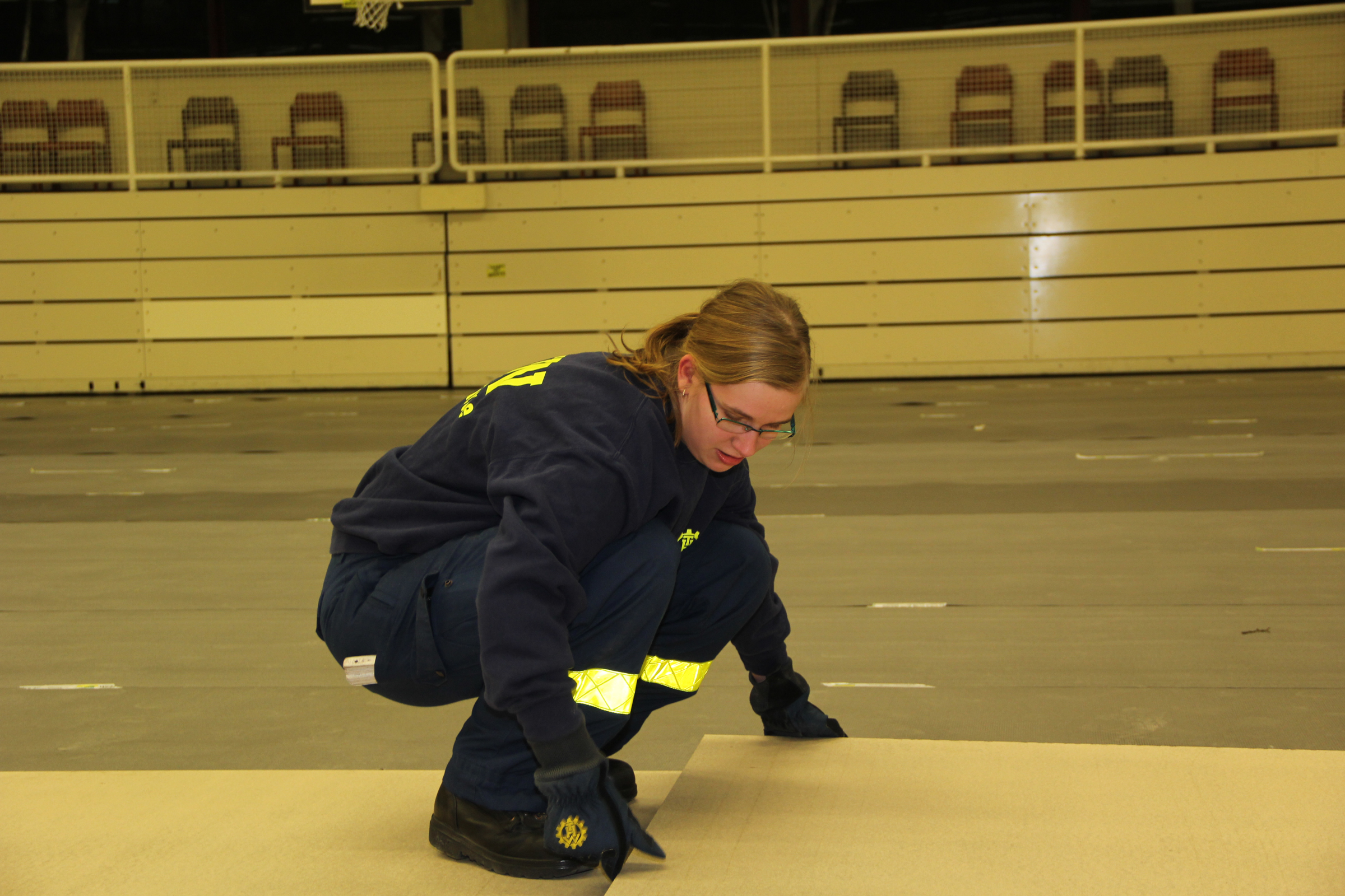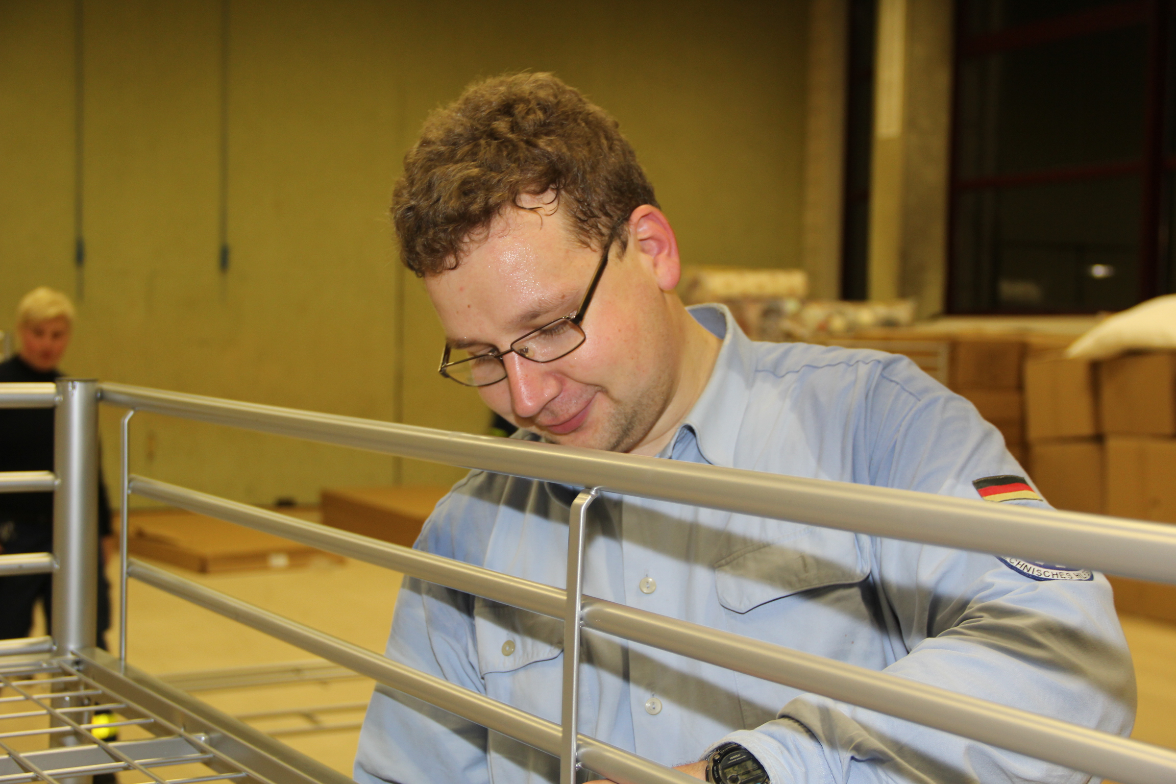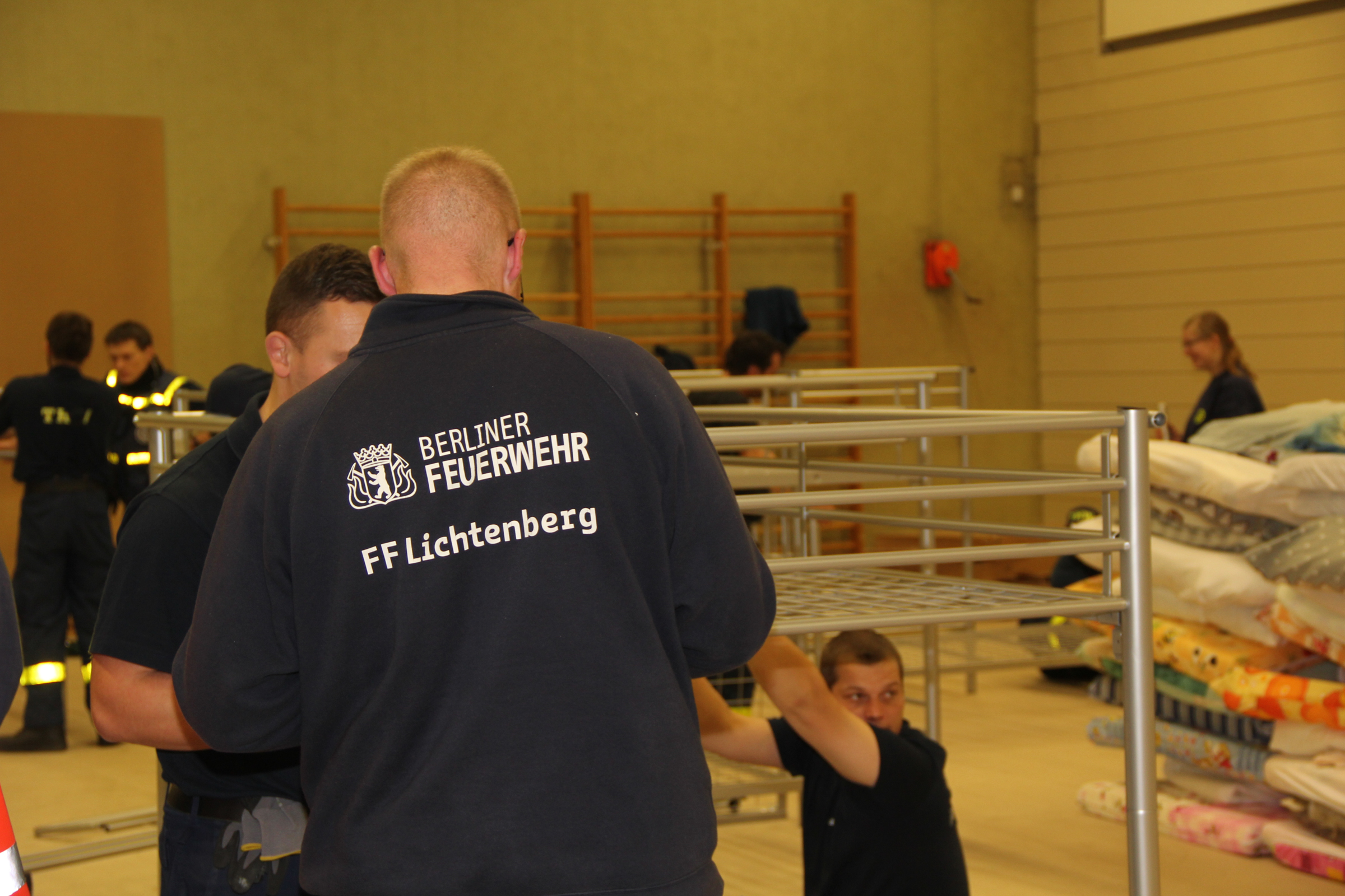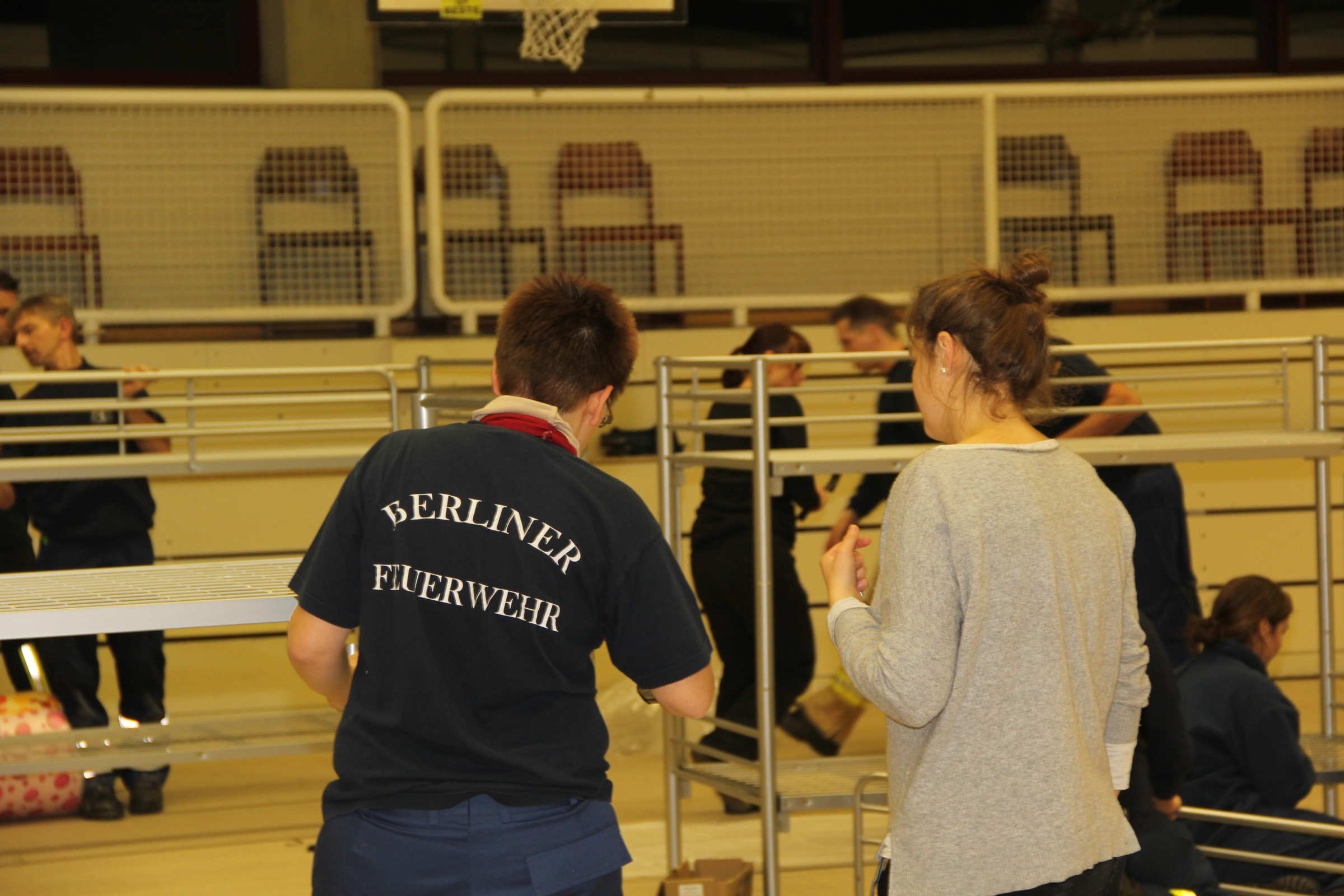 Berlin Moabit. Unter Führung der Berliner Feuerwehr verlegten rund 60 ehrenamtliche THW-Helferinnen und THW-Helfer gemeinsam mit rund 30 ehrenamtlichen und hauptberuflichen Feuerwehrleuten einen Boden aus Schutzdämmung und Holzplatten. Damit wird vermieden, dass der sensible Spezialbelag der Halle Schaden nimmt. Während die Arbeiten in den letzten Ecken noch liefen, schraubten die Beteiligten an anderer Stelle die ersten Metallbetten zusammen und stellten sie auf.