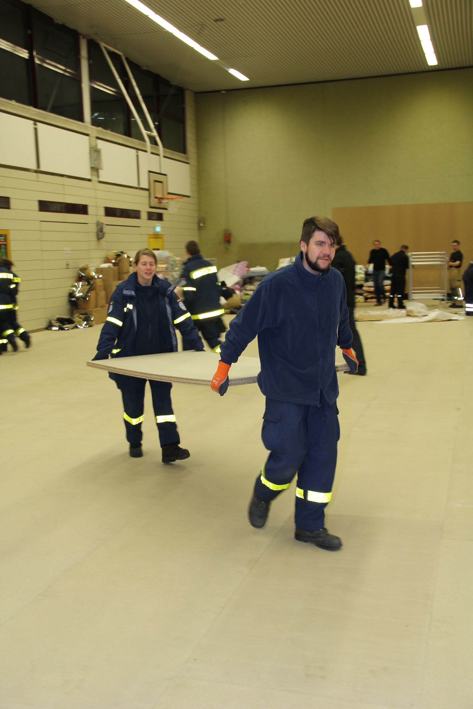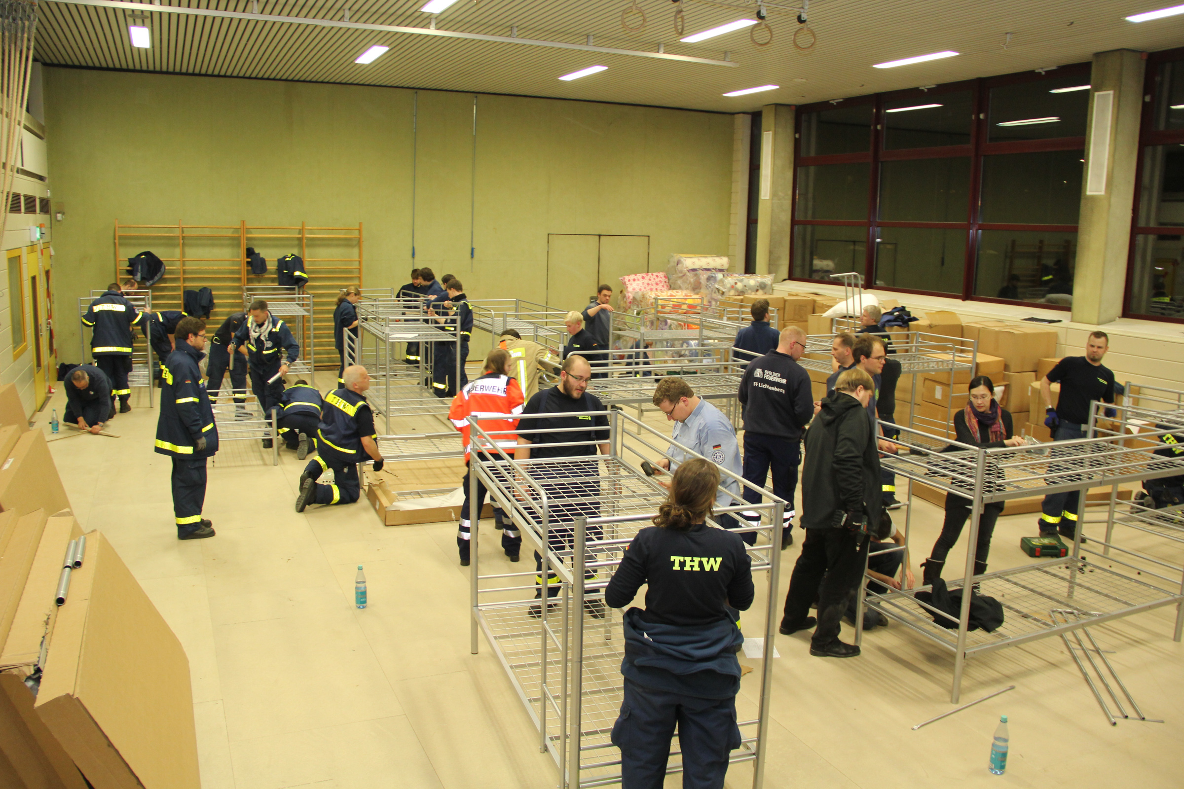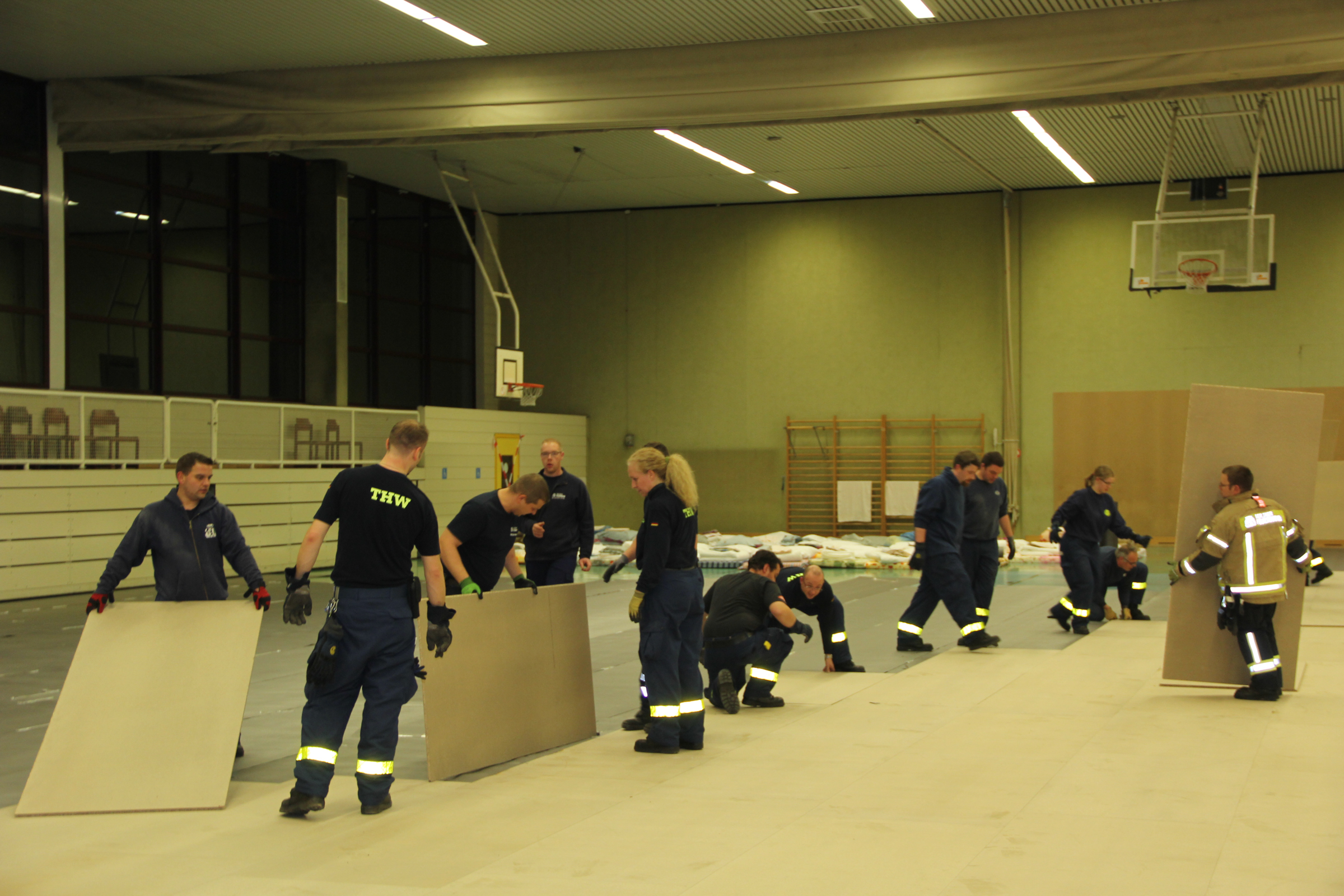 Effektiv und zügig funktionierte die Zusammenarbeit zwischen den Kräften von Freiwilliger Feuerwehr, der Berufsfeuerwehr und vom THW. Damit konnten sie die Aufgabe trotz der besonderen Eile sorgfältig erledigen. Als die Bewohnerinnen und Bewohner gegen 22:30 Uhr in die neue Notunterkunft einzogen, fanden sie gemachte Betten und, dank des Deutschen Roten Kreuzes, ein warmes Essen vor.