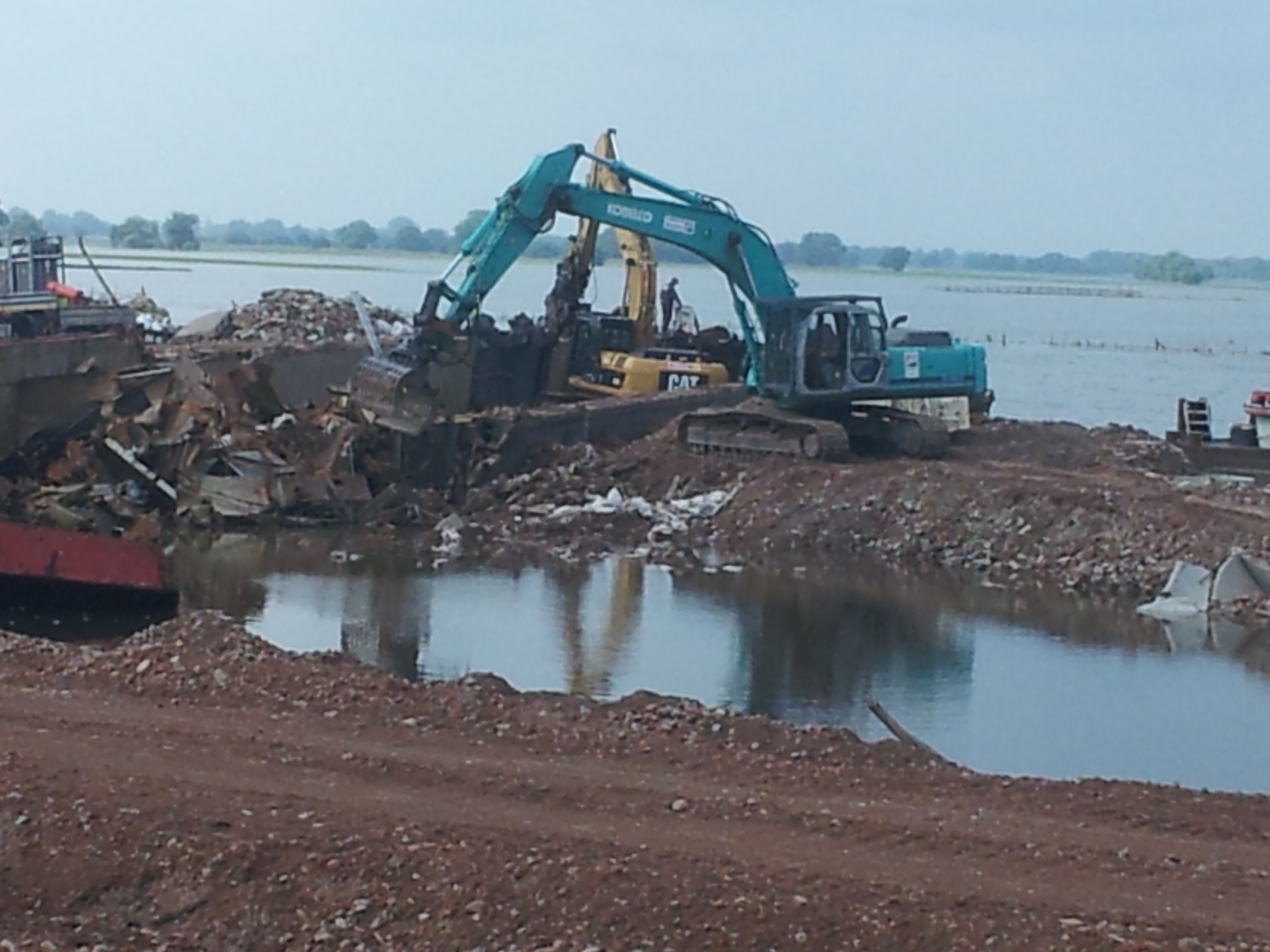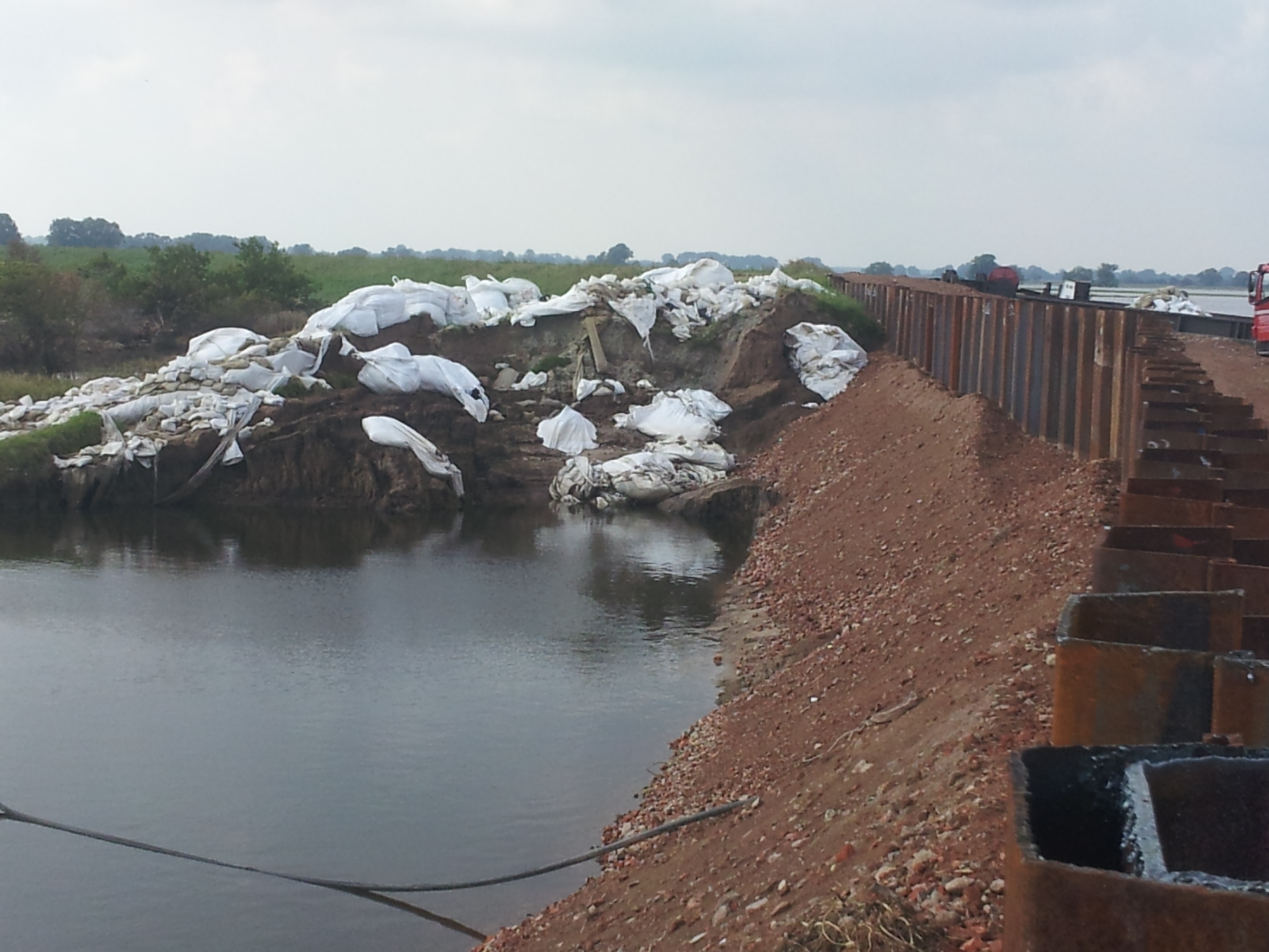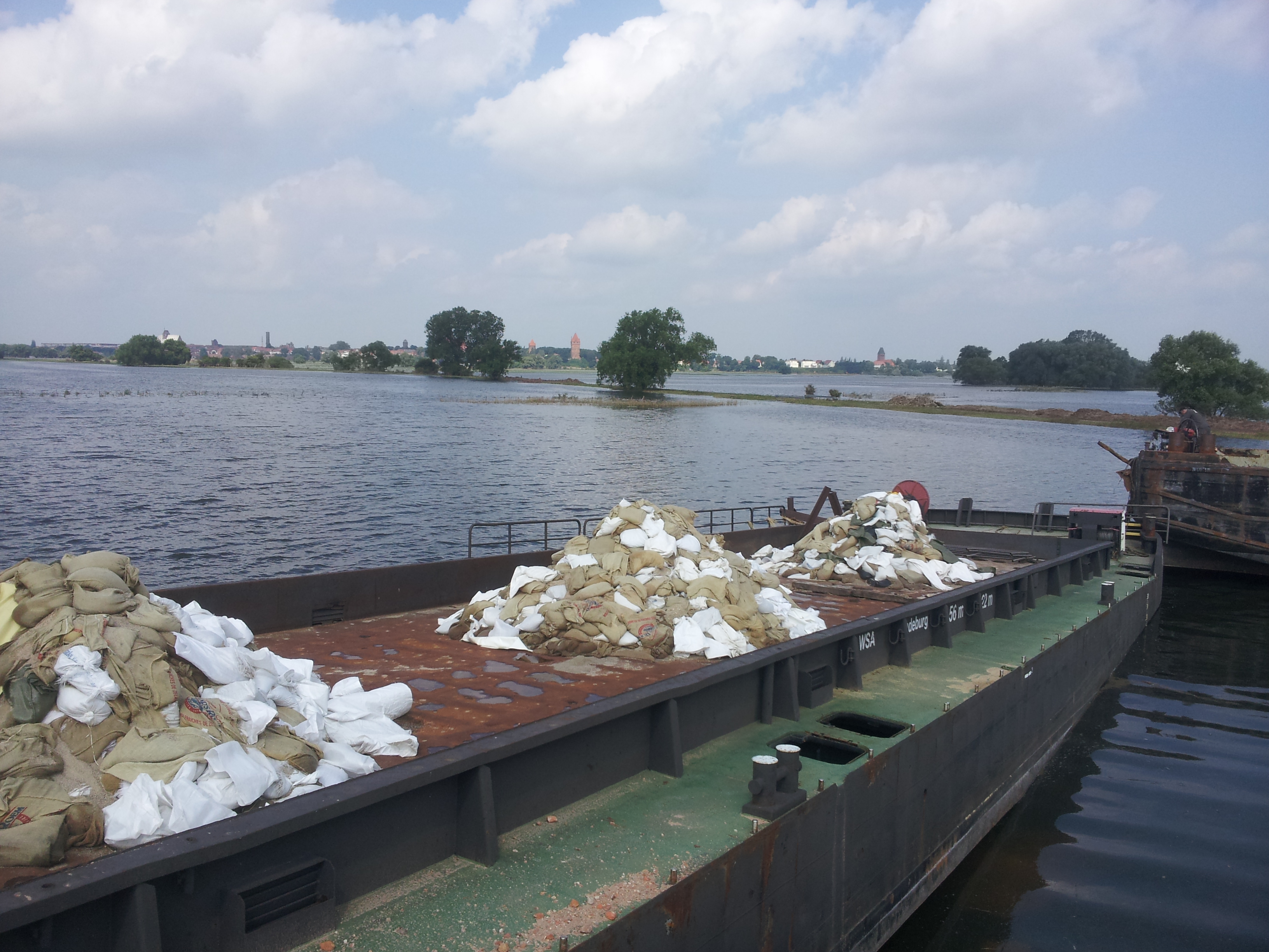 Besonders dramatische Szenen spielten sich in Fischbeck (Sachsen-Anhalt) ab. Kurz bevor am 09.06.13 gegen Mitternacht der Deich brach, waren unsere Einsatzkräfte an der Feuerwache in Fischbeck eingetroffen und von dort direkt zum Deich geschickt worden – wohin sie aber nicht mehr gelangen sollten. Sie mussten, wie die anderen Helfer auch, sofort umdrehen und vor den einströmenden Wassermassen fliehen. Das Wasser überflutete eine Fläche von rund 10 auf 20 Kilometern, also ca. 200 Quadratkilometern. Auch jetzt fließt es noch immer nur langsam ab, daher ist unsere Fachgruppe Wasserschaden/Pumpen weiter im Einsatz und stellt unter anderem die Abwasserentsorgung in Klietz sicher. Dort steht die Kanalisation nach wie vor unter Wasser. Außerdem ist unsere 2. Bergungsgruppe damit beschäftigt, lebenswichtiges Futter zu Schweinemastanlagen zu transportieren und so die eingeschlossenen Tiere zu versorgen.