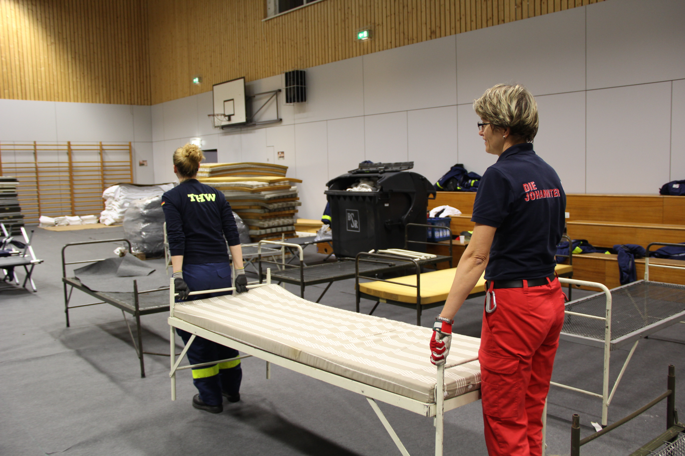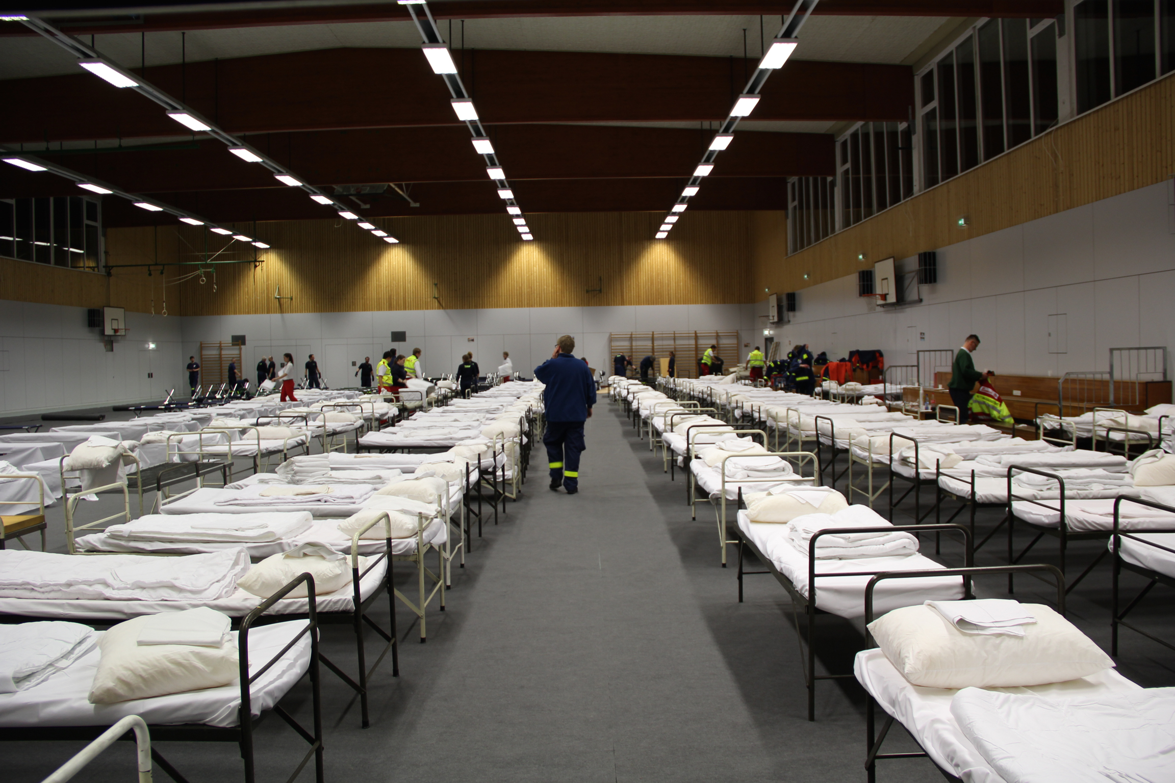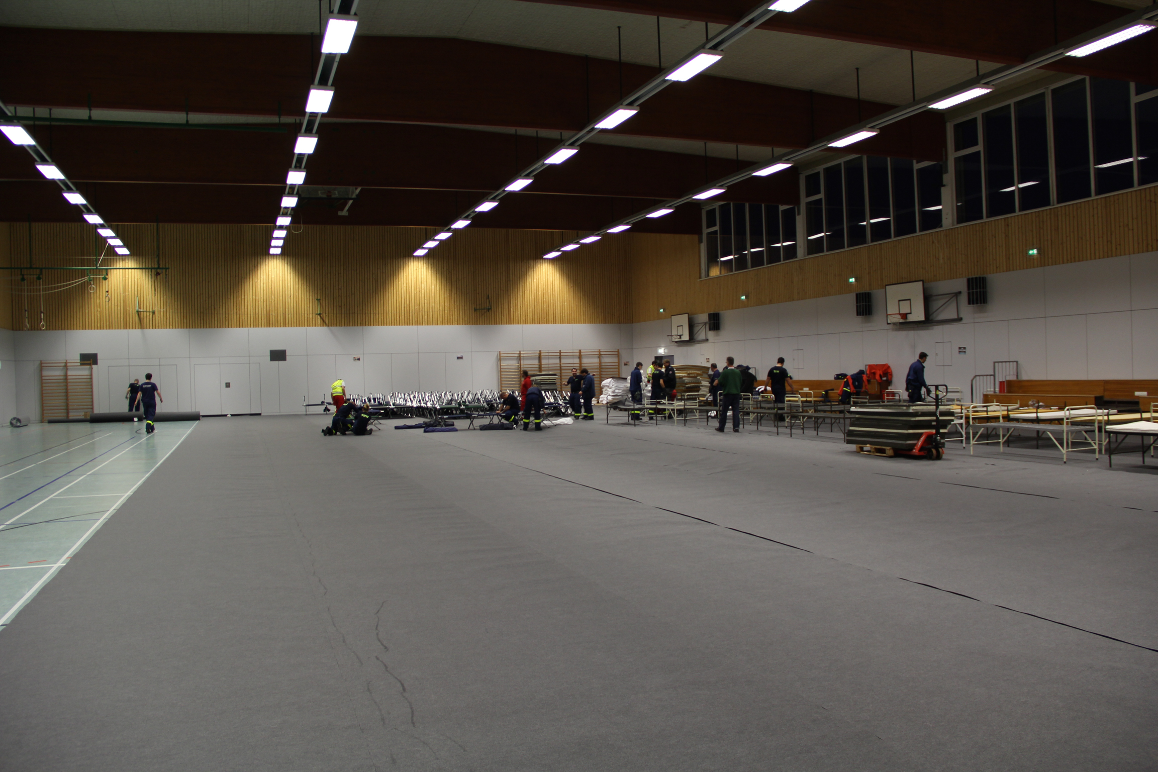 Die Feldbetten wurden extra aus Langenhagen bei Hannover bestellt, für das Auslegen des Schutzbelages auf dem empfindlichen Hallenboden brauchten die Johanniter allerdings unsere tatkräftige Unterstützung. Denn alleine kann eine einzelne Organisation eine solche Herkulesaufgabe nicht in dieser kurzen Zeit bewältigen.