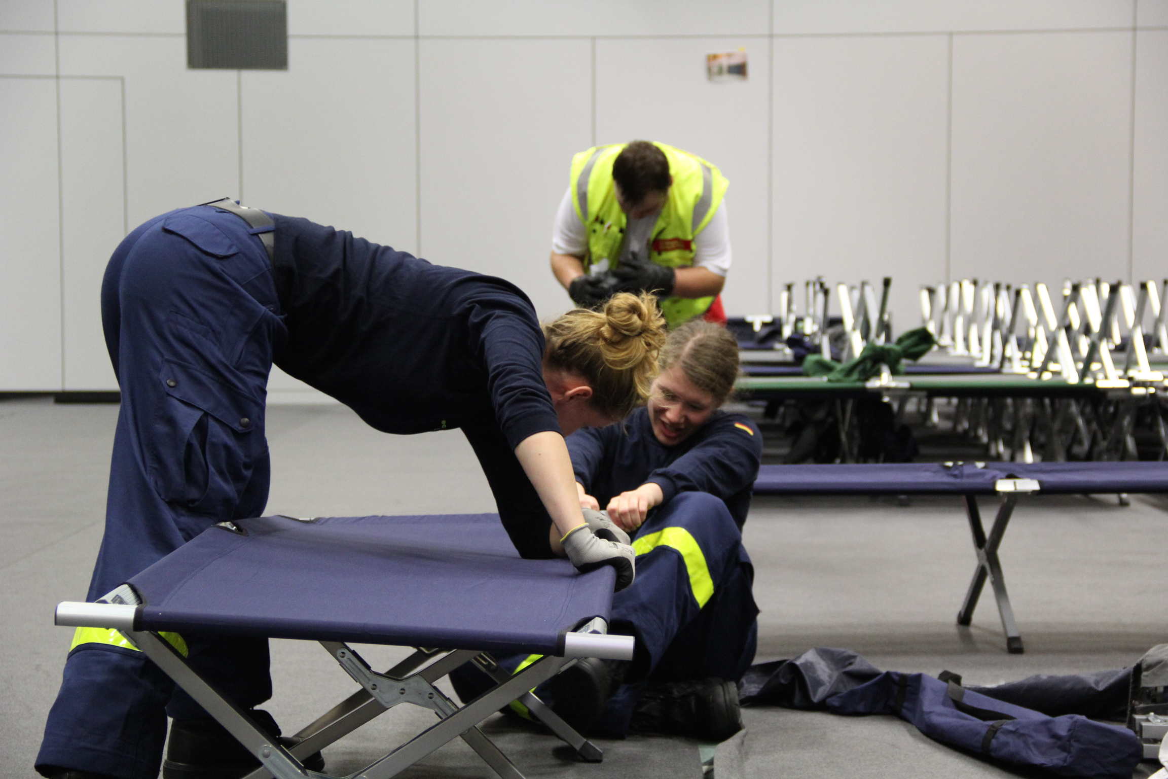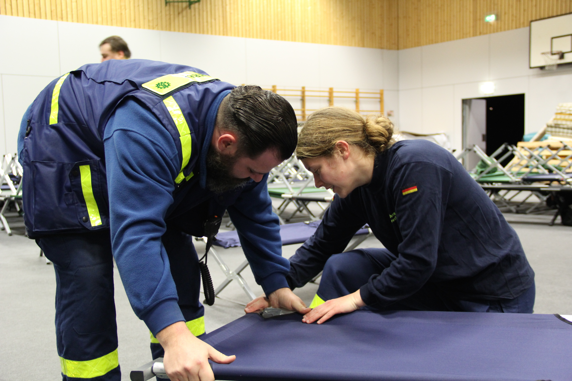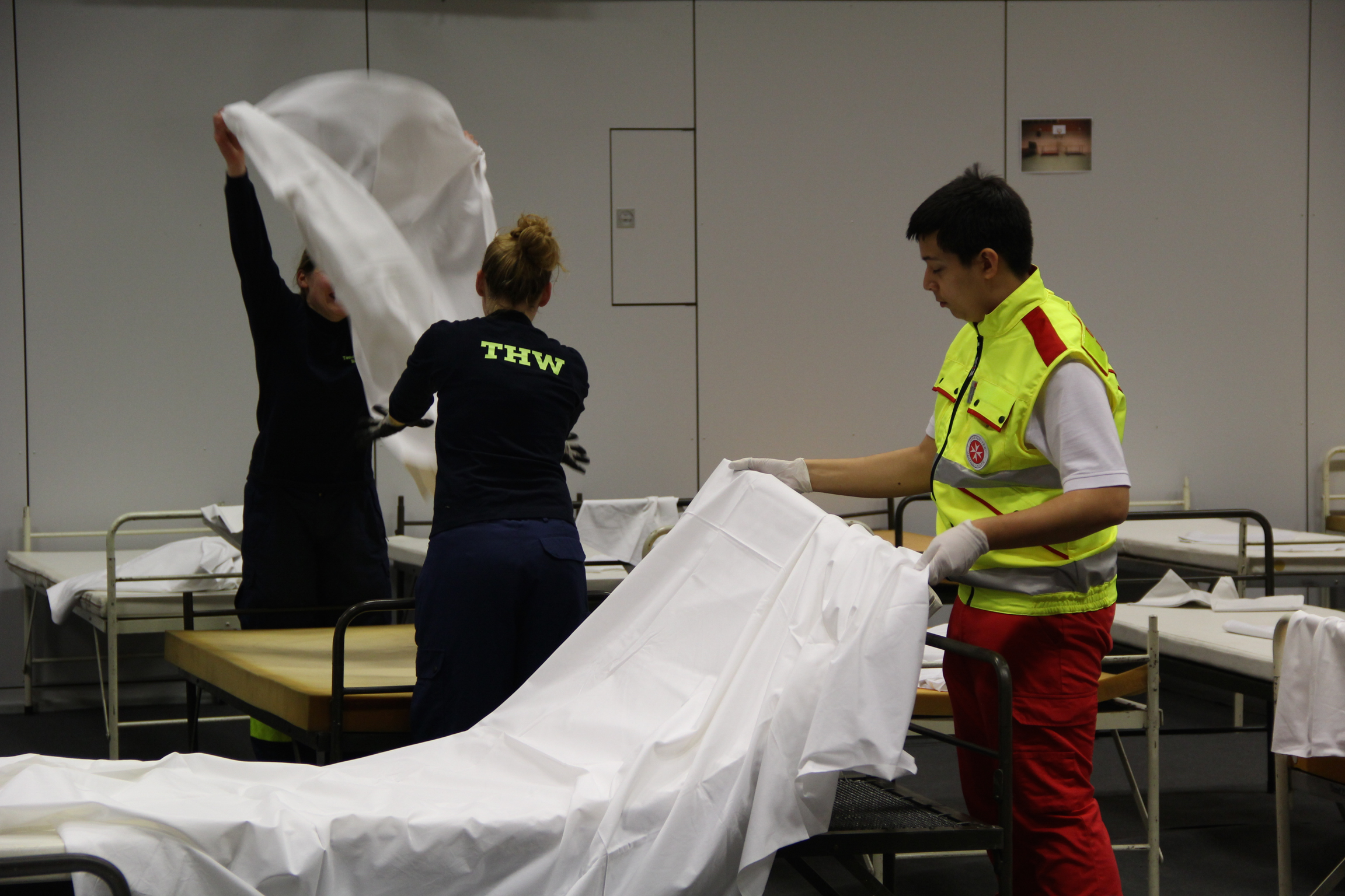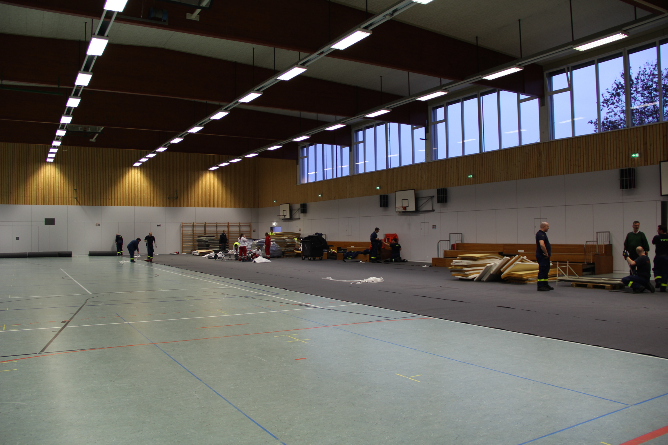 Die Feldbetten wurden extra aus Langenhagen bei Hannover bestellt, für das Auslegen des Schutzbelages auf dem empfindlichen Hallenboden brauchten die Johanniter allerdings unsere tatkräftige Unterstützung. Denn alleine kann eine einzelne Organisation eine solche Herkulesaufgabe nicht in dieser kurzen Zeit bewältigen.
