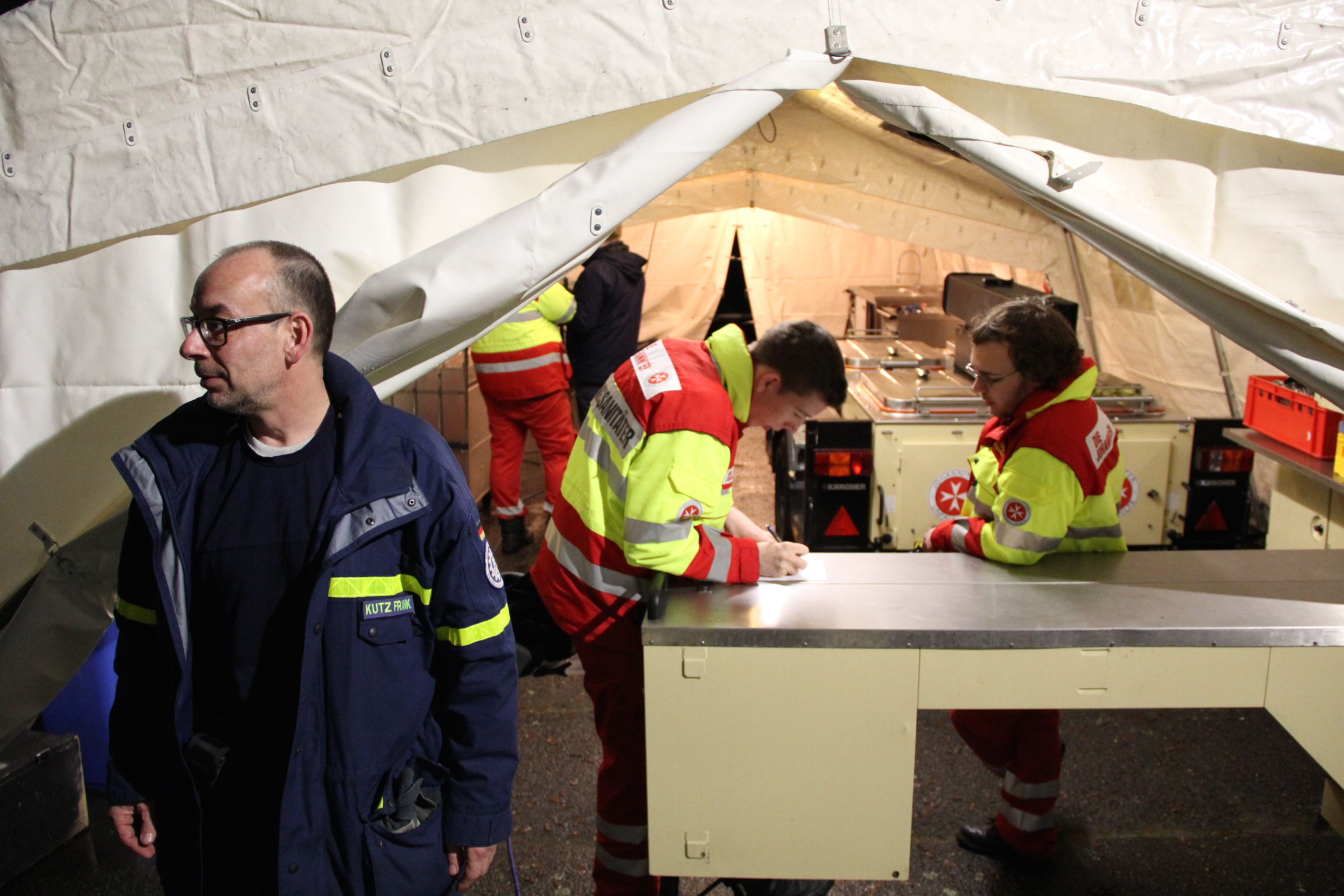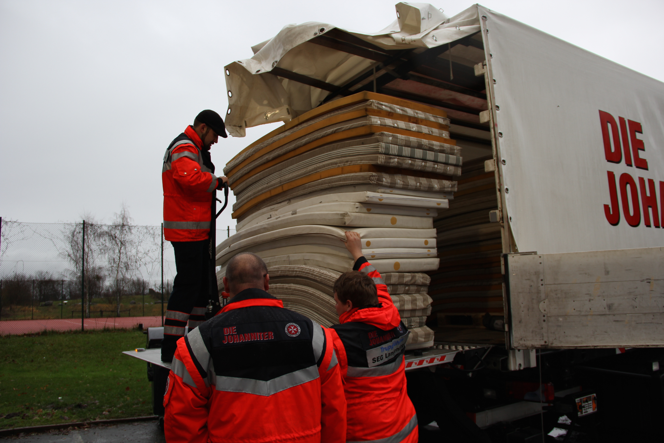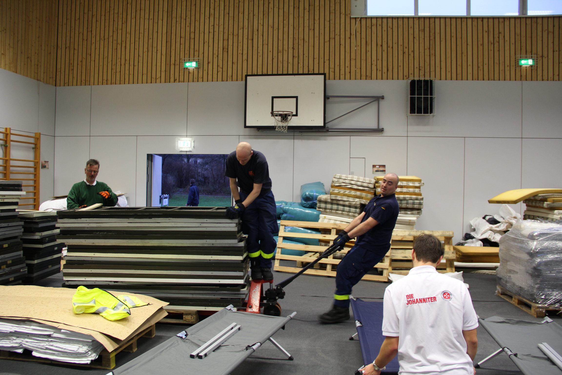 Insgesamt 28 Einsatzkräfte unseres Ortsverbandes übernahmen für die Johanniter dann nicht nur das Auslegen des Fußbodens, sondern unterstützten sie auch beim Aufstellen und Beziehen der 200 Betten, stellten Licht für den Eingangsbereich und Strom für die Behelfsküche zur Verfügung. So konnten die Johanniter sich auf die eigenen Aufgaben konzentrieren, vor allem die komplizierte Logistik, die eine solche Notunterkunft mit sich bringt. So mussten ausreichend Sanitäranlagen über einen Privatanbieter organisiert, ein Empfang für die Bewohner eingerichtet und die Feldküche in Betrieb genommen werden.