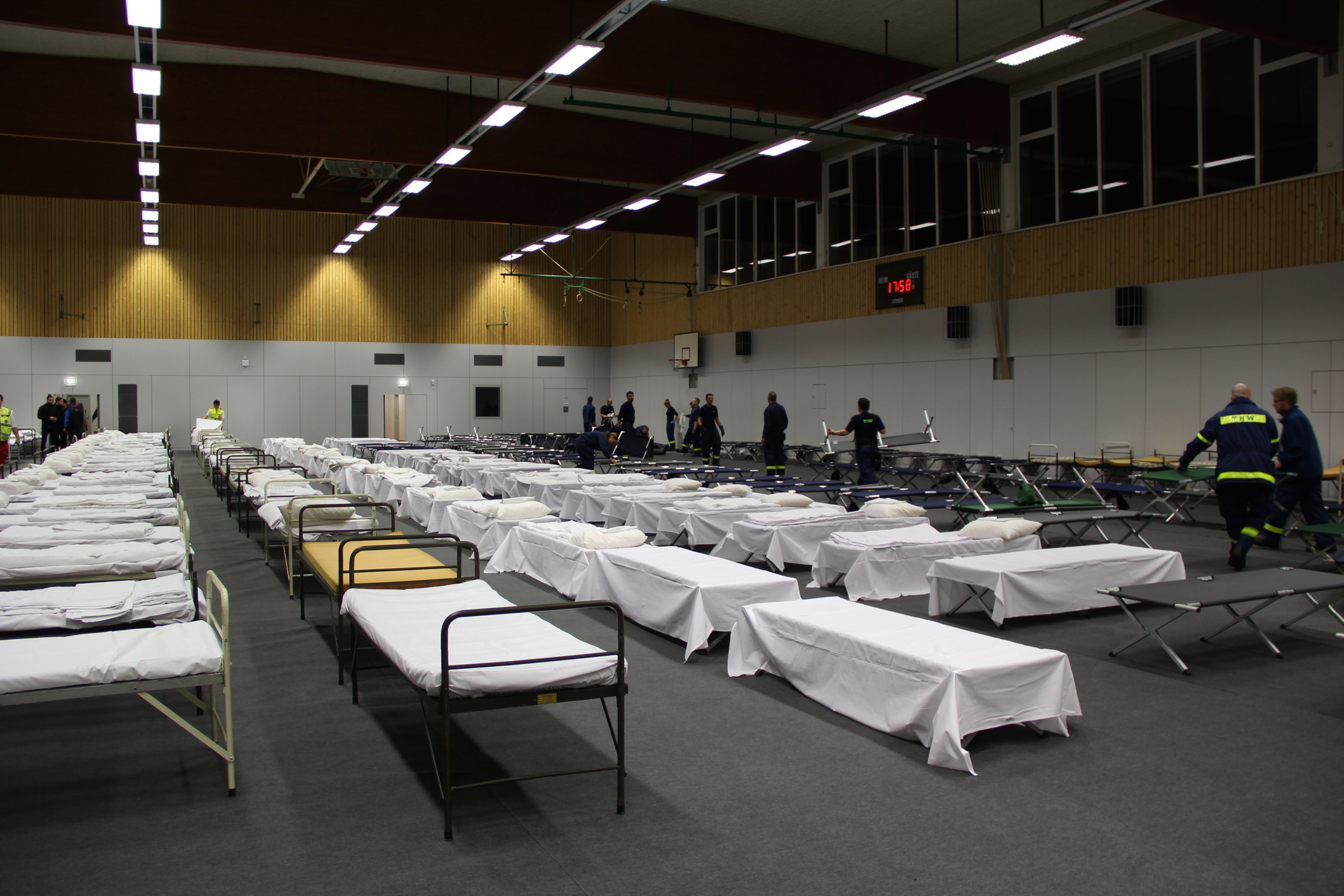 Am Ende stand ein Rekordergebnis: Eine Turnhalle wurde in kürzester Zeit zu einer kompletten Notunterkunft. Im Übrigen war auch die Hilfsbereitschaft der neuen Nachbarn der Menschen aus dem Bürgerkriegsland Syrien und anderen Staaten enorm. Noch während der Aufbauarbeiten erschienen Erwachsene und Kinder aus den umliegenden Häusern, um Spenden abzugeben.