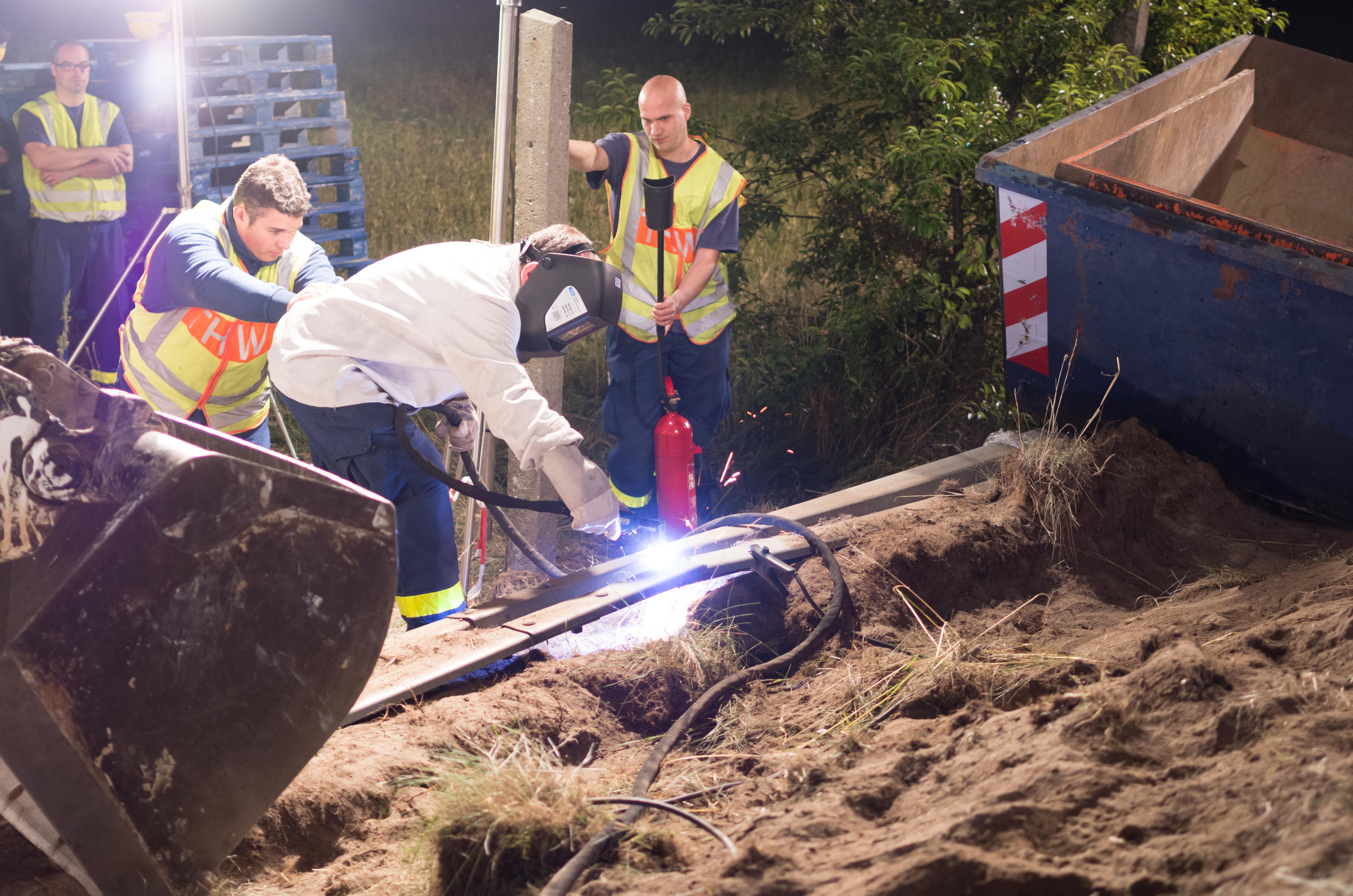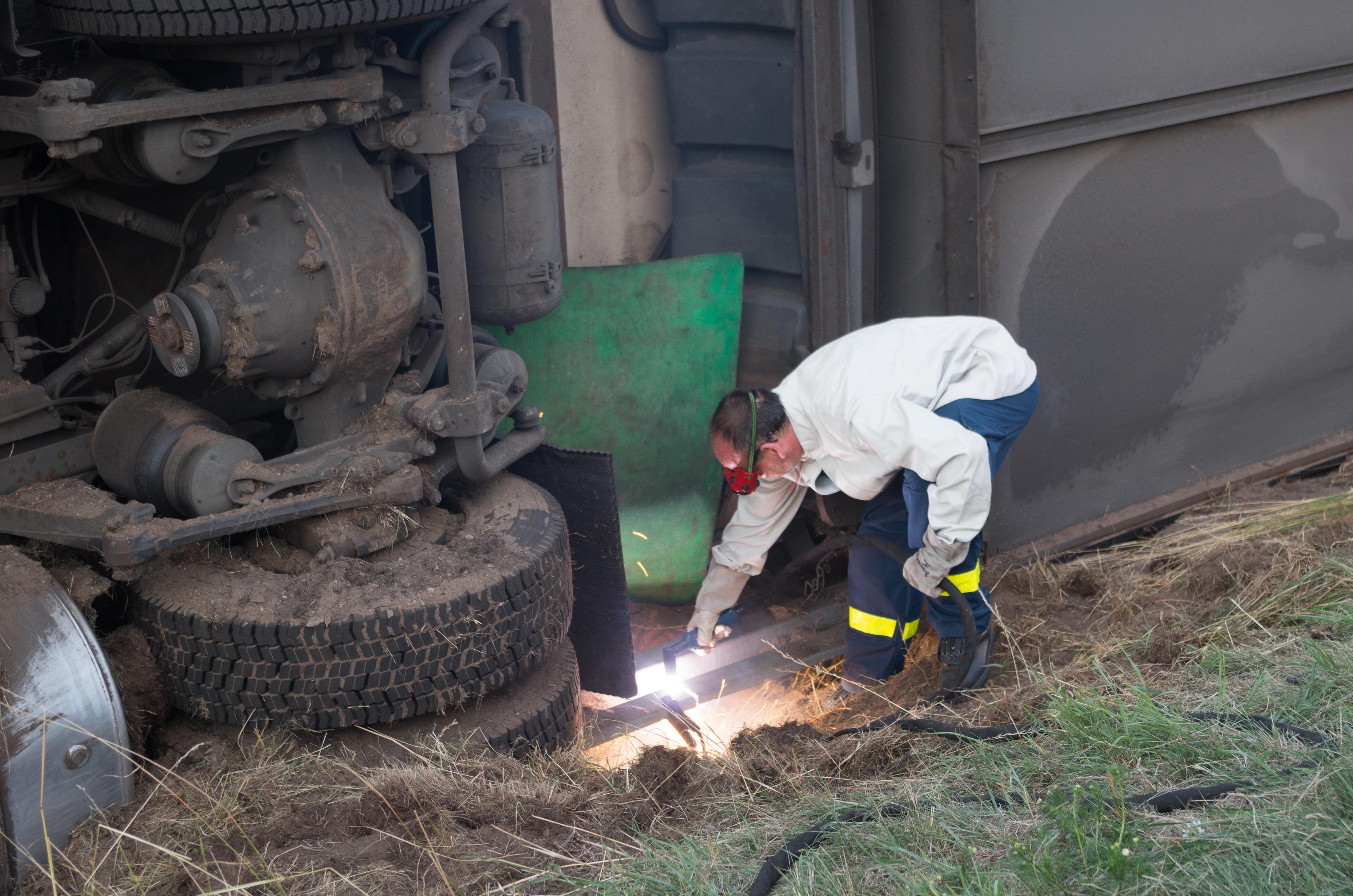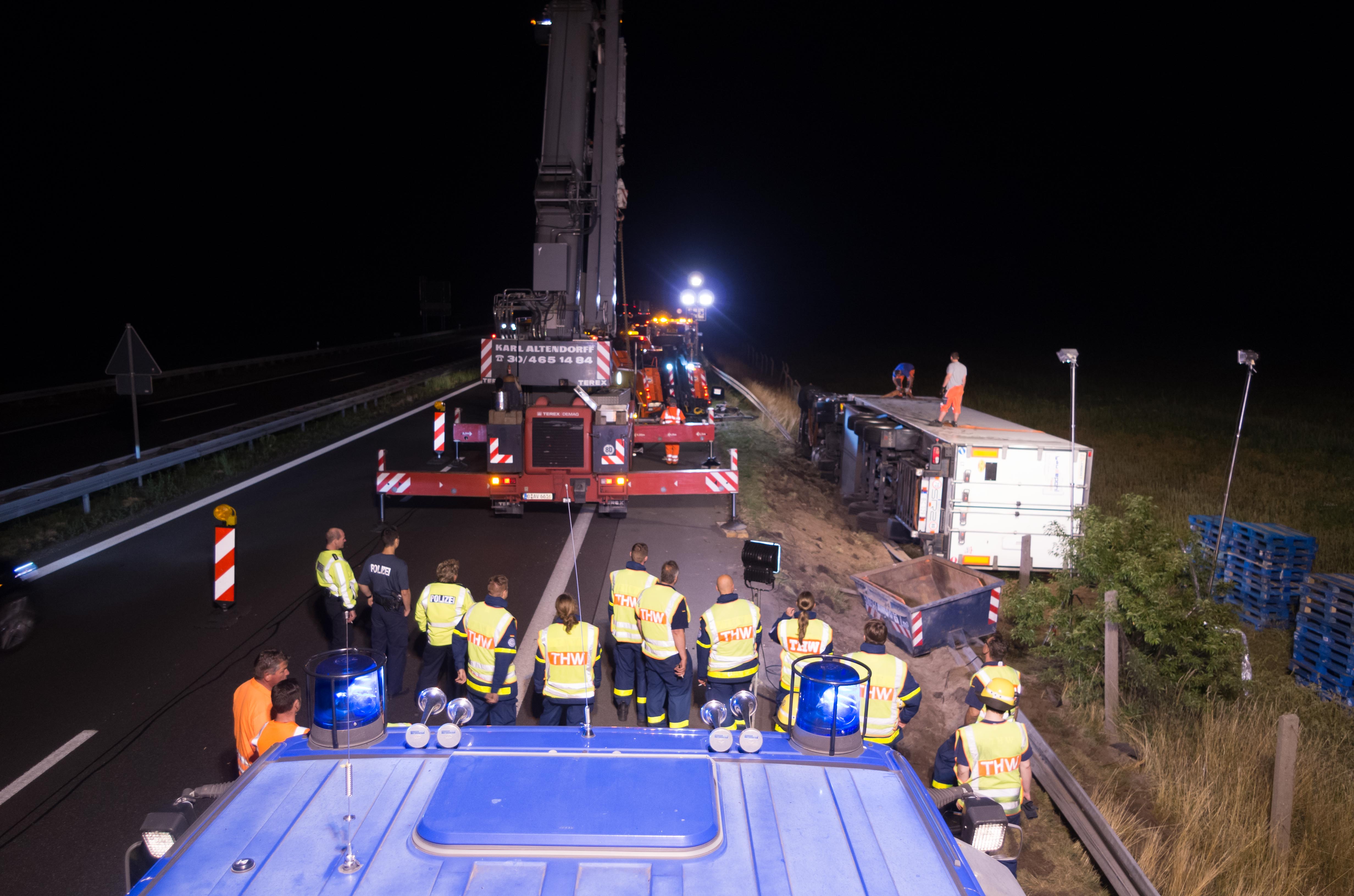 Die Autobahnpolizei des Landes Brandenburg hatte uns um Unterstützung gebeten. Bevor nämlich der LKW von einem Spezialunternehmen wieder auf die Straße gehoben werden konnte, musste zunächst die kalte Fracht entladen und entsorgt werden. Außerdem hatte das Fahrzeug bei dem Unfall die Leitplanke stark beschädigt, weswegen diese von unseren Helferinnen und Helfern teilweise zerlegt und beiseite geräumt werden musste.