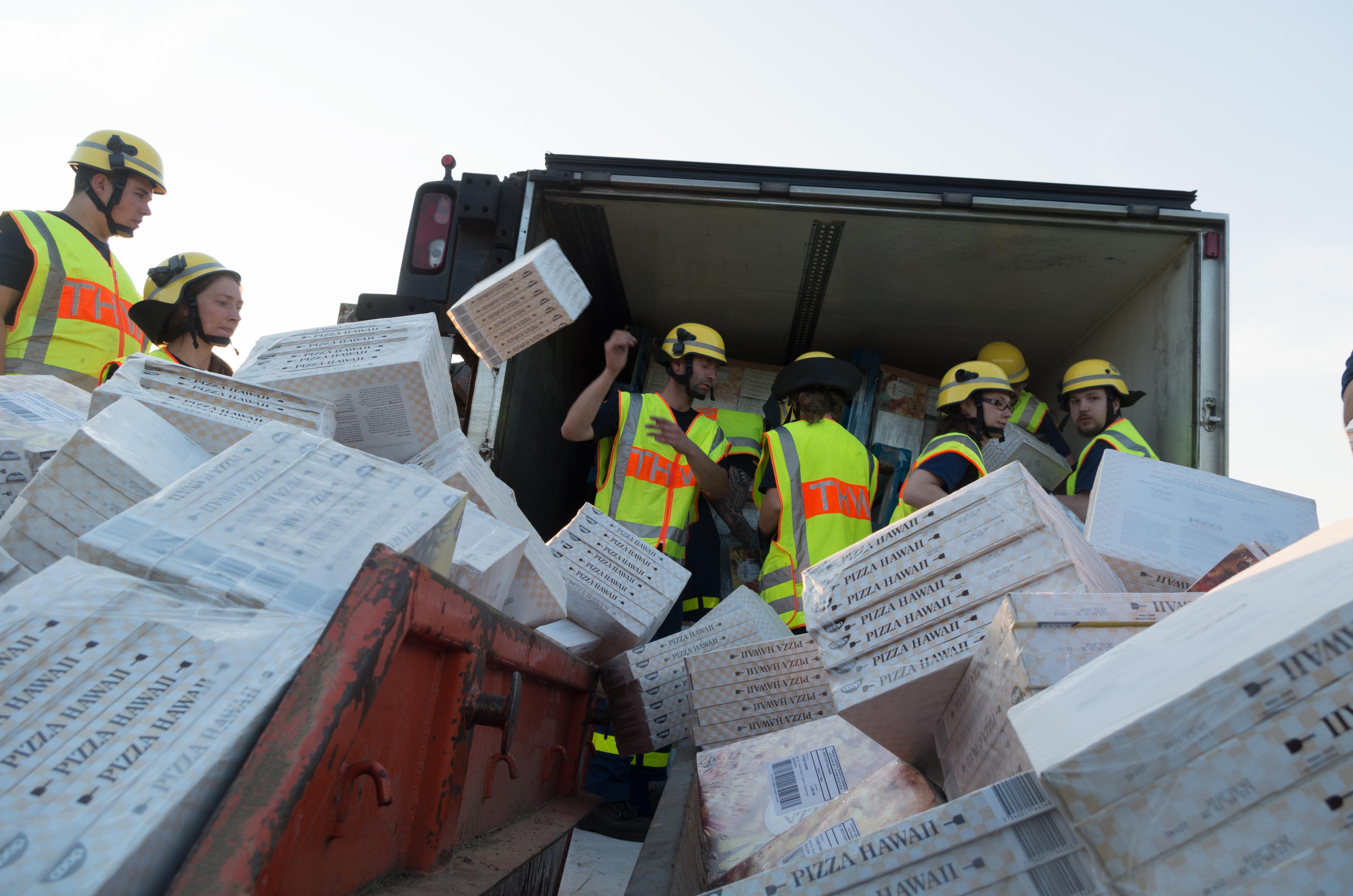15 Tonnen Tiefkühlpizza im Straßengraben. Dieser, nicht ganz alltägliche, Anblick bot sich unseren Einsatzkräften am Samstag, als sie zur Bergung eines LKW an die Autobahn A24 nordwestlich von Berlin gerufen wurden. Das Fahrzeug war, nach dem Platzen eines Reifens, von der Fahrbahn abgekommen und auf der Seite an einem kleinen Abhang zum Liegen gekommen.