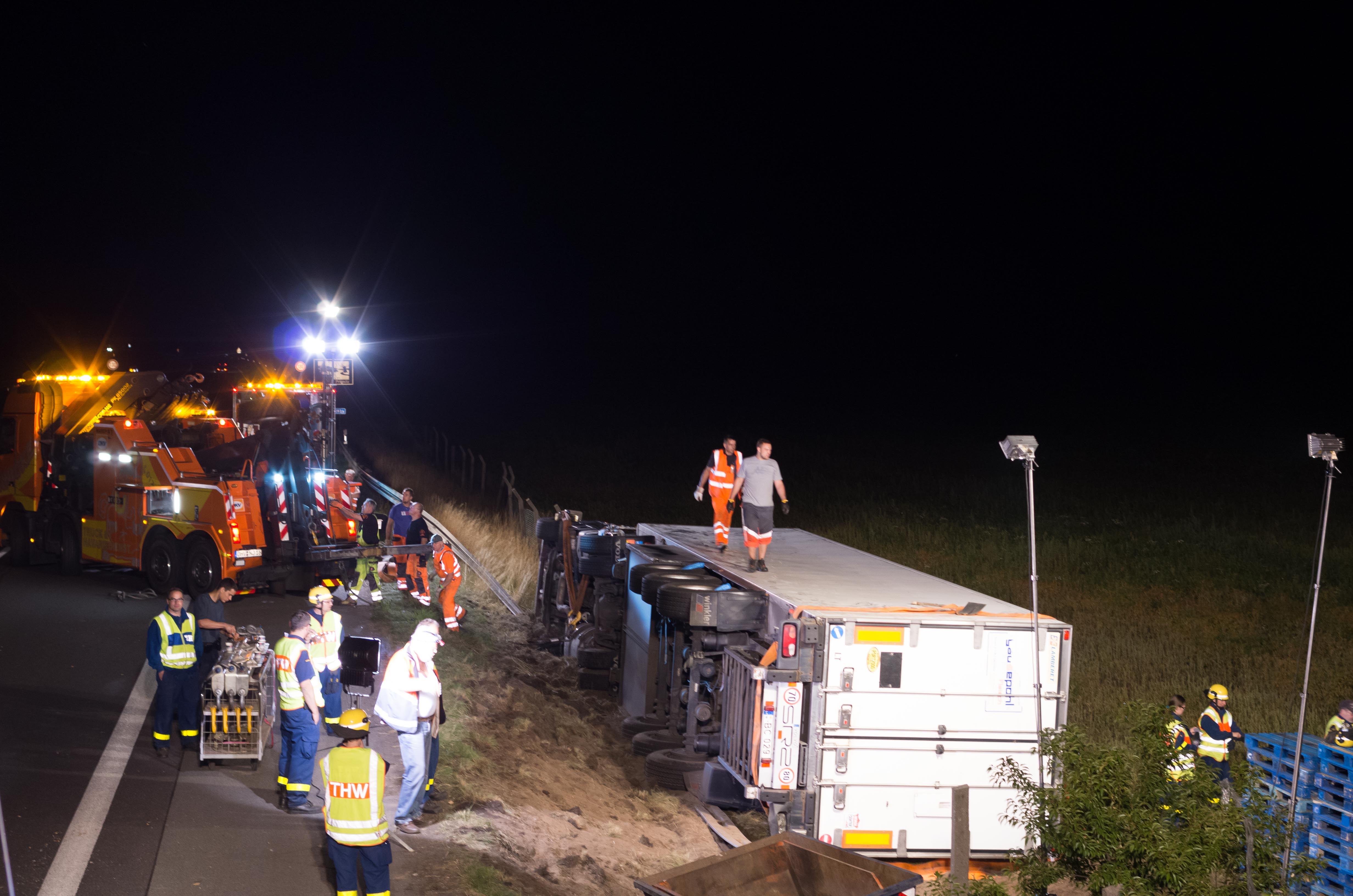 Weil der Einsatz bis in die frühen Morgenstunden des Sonntages dauerte, stellte der Gerätekraftwagen unserer 2. Bergungsgruppe für die Arbeiten der Autobahnpolizei das notwendige Licht zur Verfügung. Noch vor Beginn des morgendlichen Verkehrs konnte der LKW aufgerichtet und abtransportiert werden.