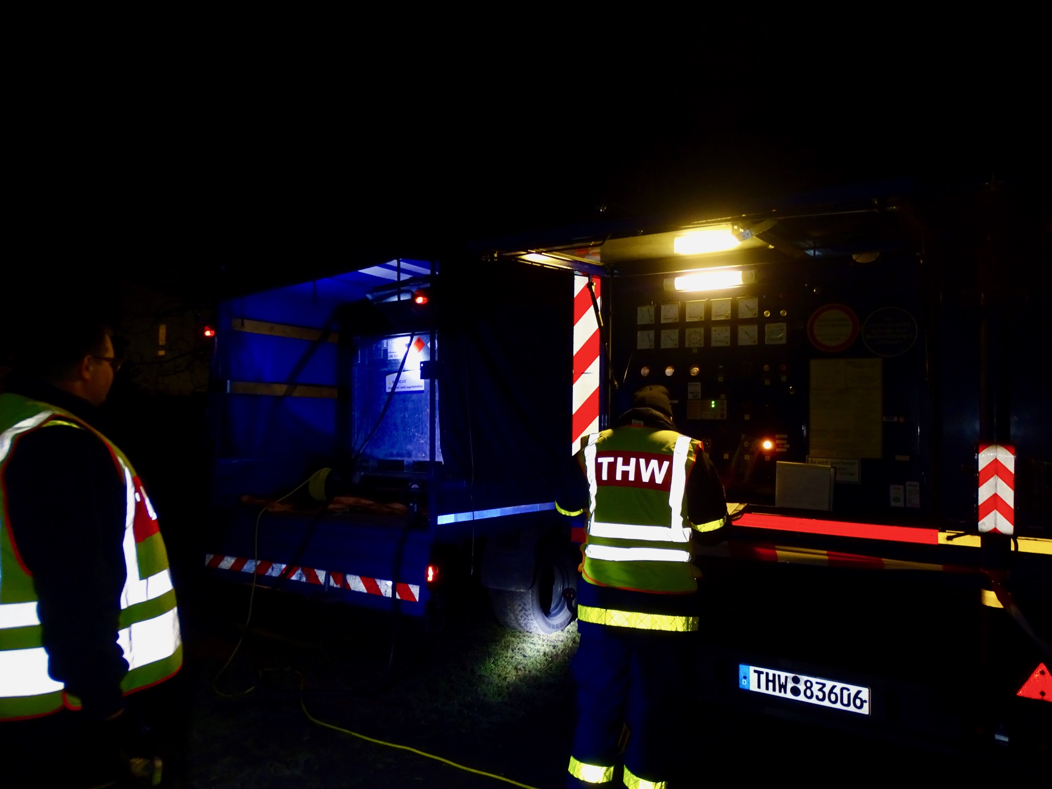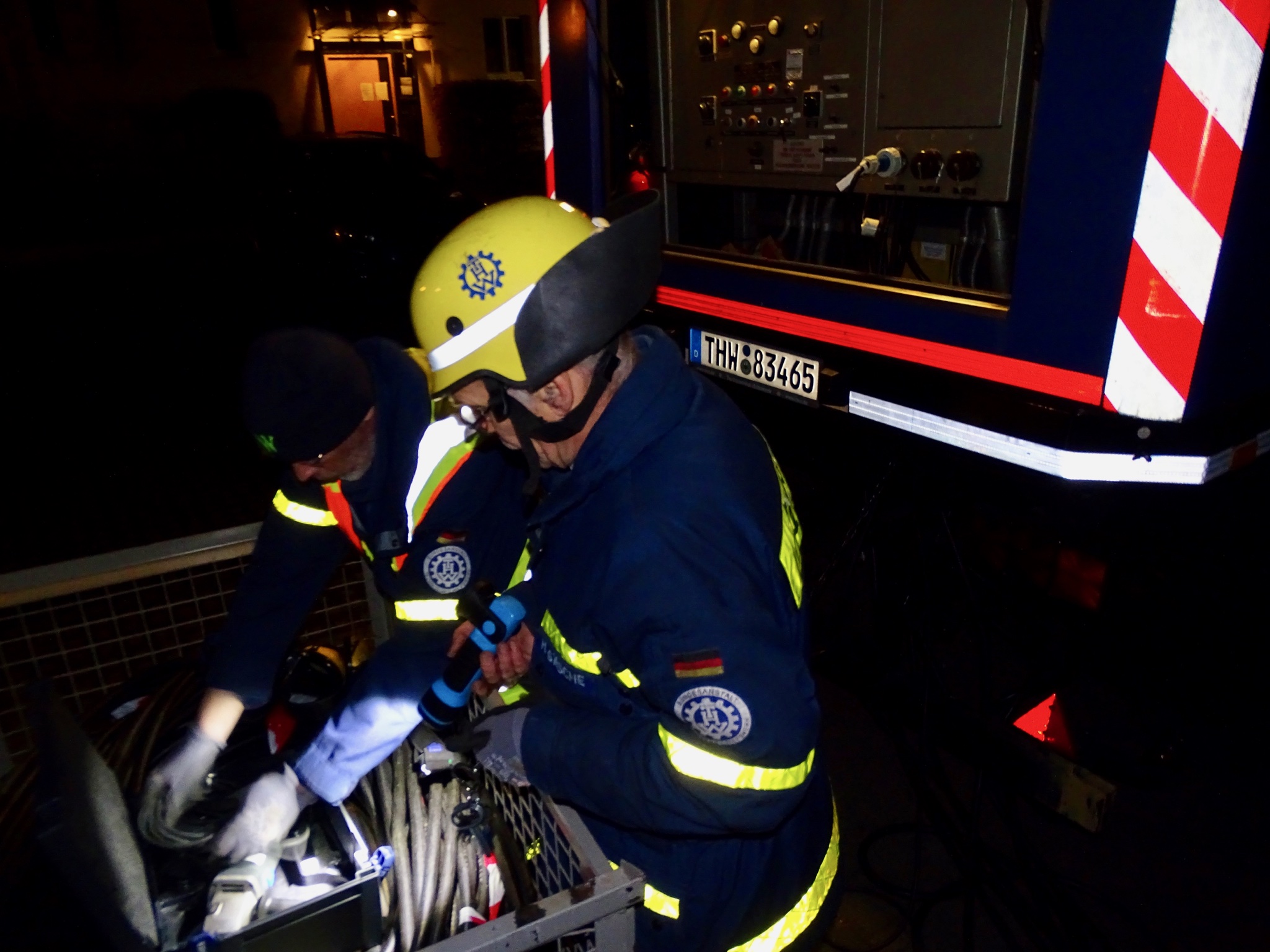 Die Fachgruppe E des OV Berlin Steglitz-Zehlendorf hat den Einsatz übernommen und damit begonnen, mittels des 175 kVA StAN-Aggregat und des 317 kVA NEA HV die behelfsmäßige Stromversorgung herzustellen.