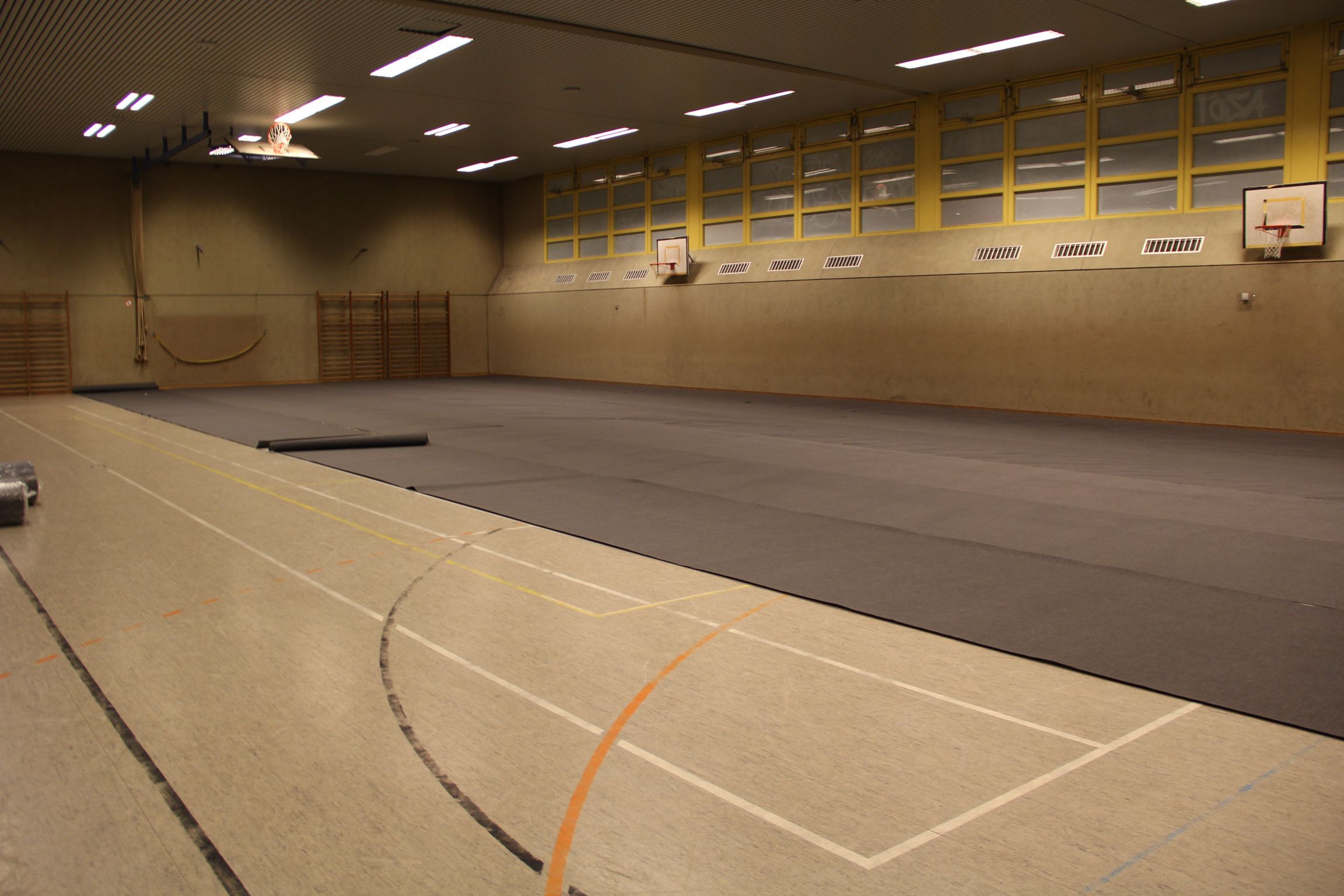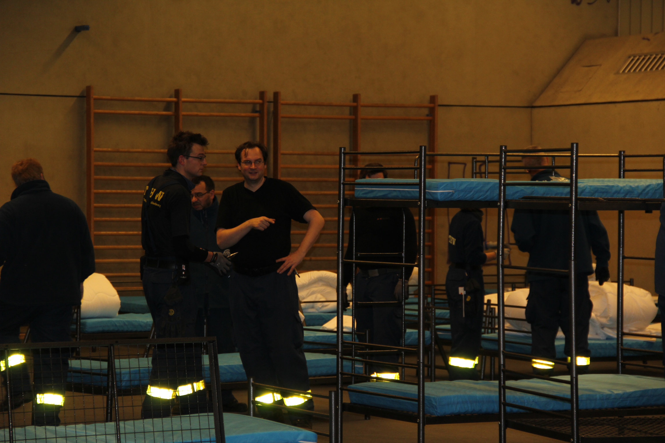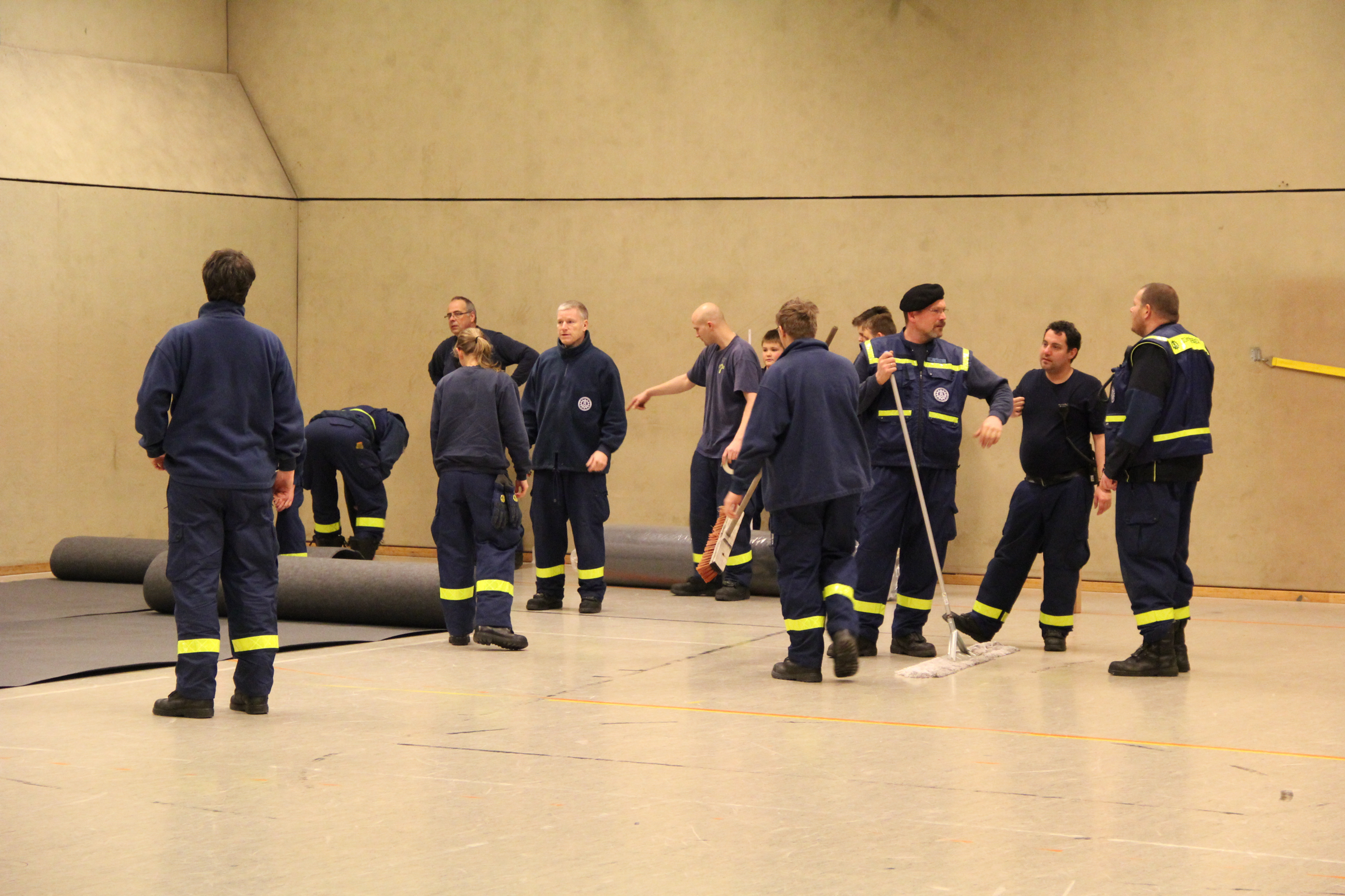 Am Nachmittag des 23. Dezember wurden unsere Helferinnen und Helfer, nur vier Tage nach dem letzten Einsatz dieser Art, wieder angefordert, um bei der Einrichtung zu helfen. Die Tätigkeiten waren weitestgehend dieselben: In möglichst kurzer Zeit den Boden einer Turnhalle mit Schutzbelag ausstatten, Betten und Sitzgelegenheiten aufstellen und für die neuen Bewohner bezugsfertig machen. Wegen der massiven Stahlbetten und der anderen Aufteilung der beiden Räume in dem Komplex war dafür aber eine wesentlich höhere Anzahl von Einsatzkräften notwendig.
