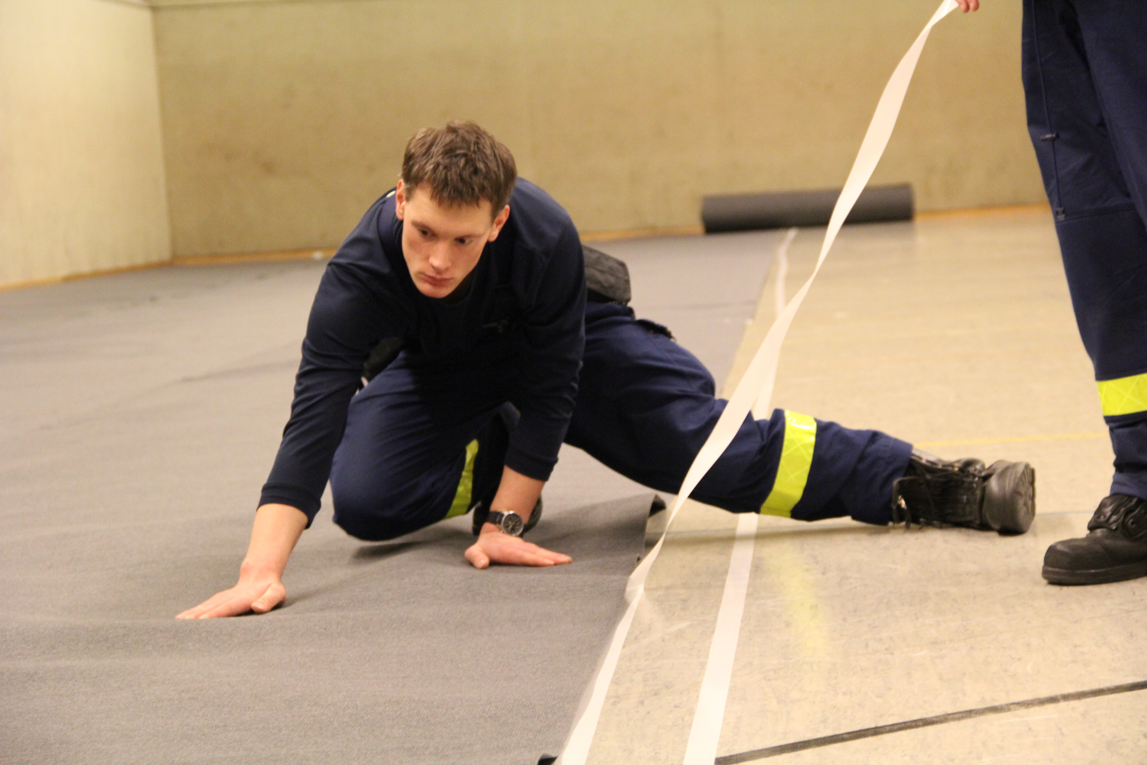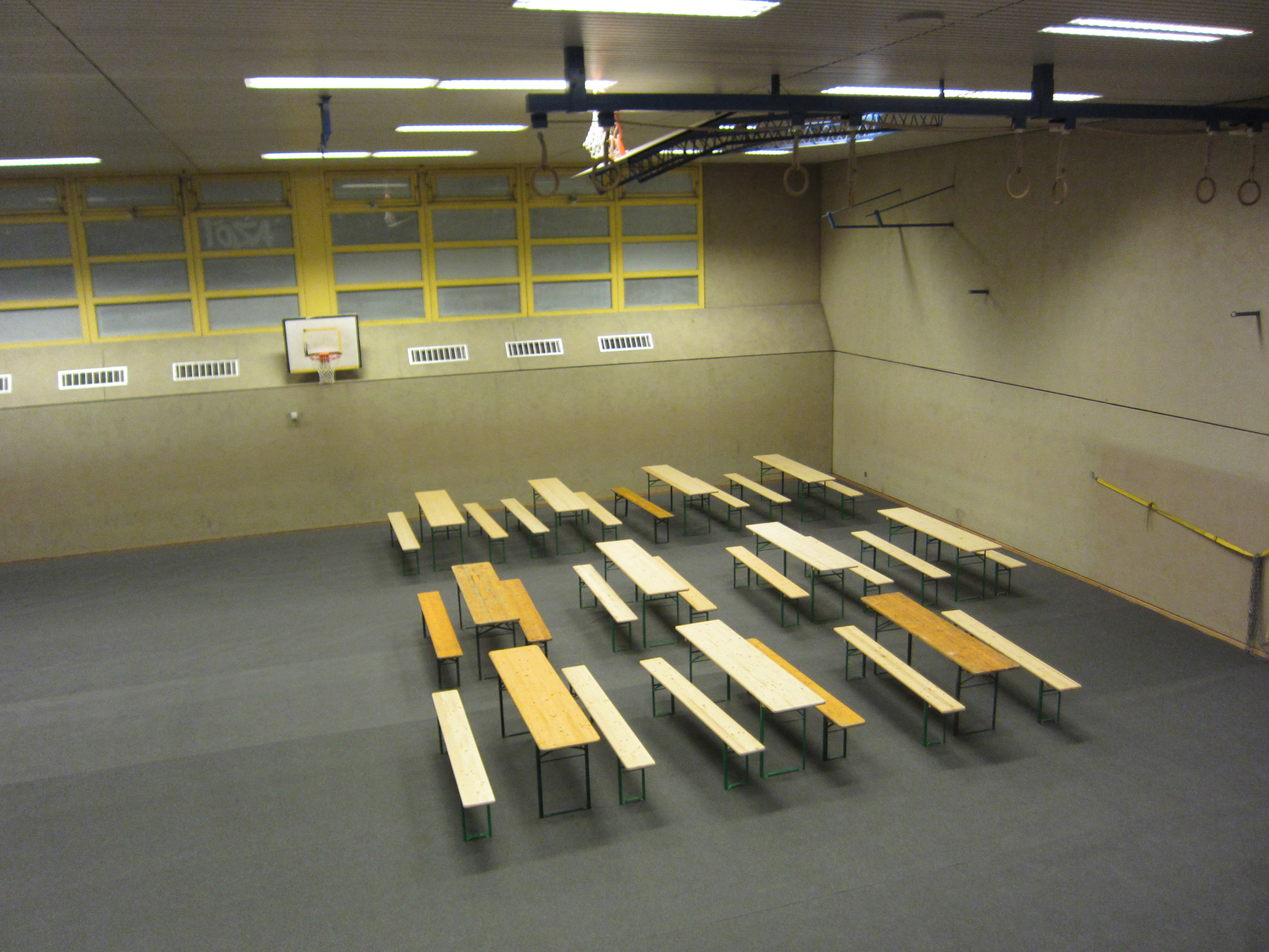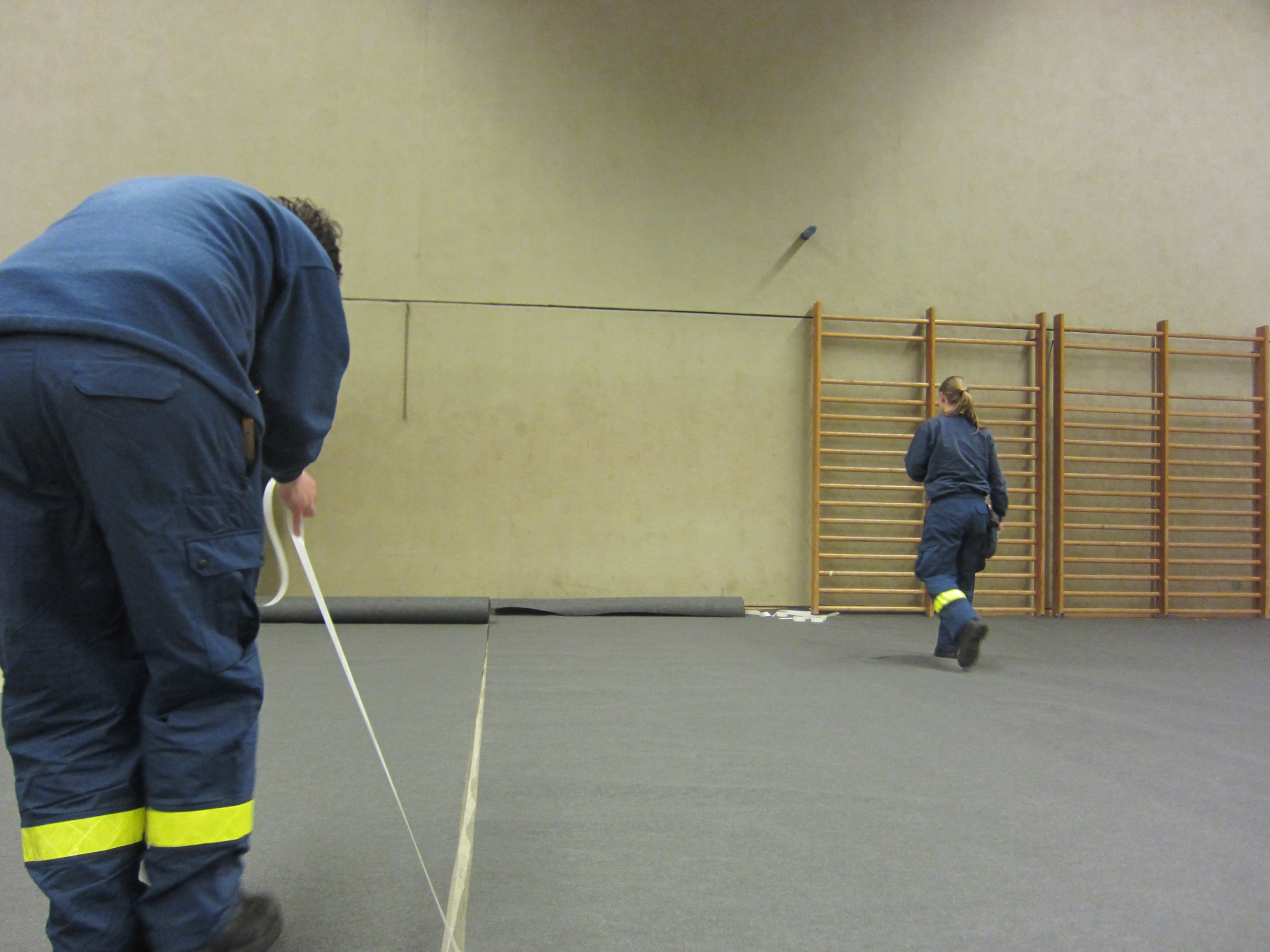 Am Nachmittag des 23. Dezember wurden unsere Helferinnen und Helfer, nur vier Tage nach dem letzten Einsatz dieser Art, wieder angefordert, um bei der Einrichtung zu helfen. Die Tätigkeiten waren weitestgehend dieselben: In möglichst kurzer Zeit den Boden einer Turnhalle mit Schutzbelag ausstatten, Betten und Sitzgelegenheiten aufstellen und für die neuen Bewohner bezugsfertig machen. Wegen der massiven Stahlbetten und der anderen Aufteilung der beiden Räume in dem Komplex war dafür aber eine wesentlich höhere Anzahl von Einsatzkräften notwendig.