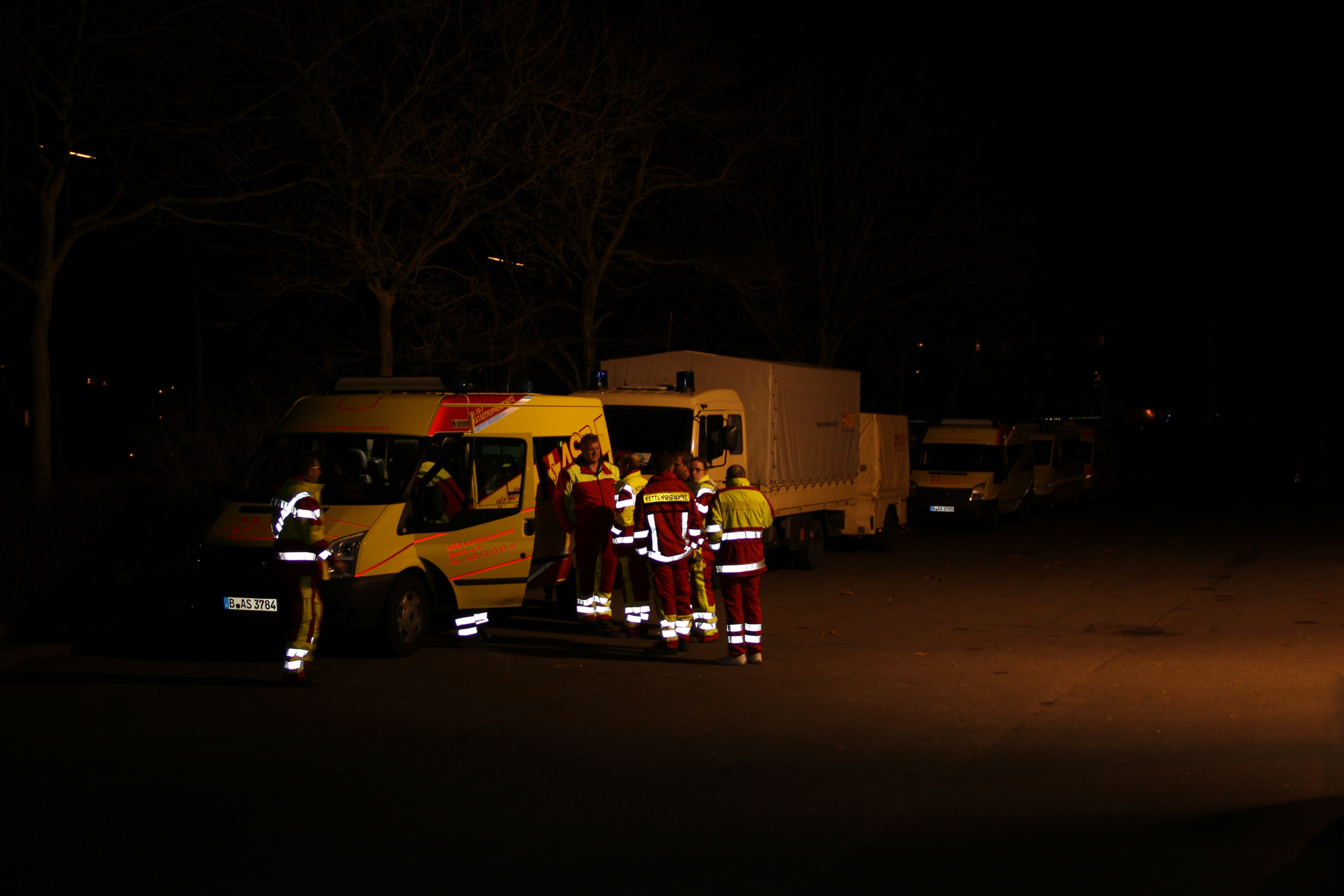 Rund 40 Helferinnen und Helfer, auch aus dem Nachbar-Ortsverband Berlin Tempelhof-Schöneberg, arbeiteten vom späten Nachmittag bis in den frühen Morgen des 24. Dezember, um den Menschen aus Syrien und anderen Krisenstaaten eine erste, provisorische Heimat in Deutschland zu bereiten. Dabei kamen ihnen auch die Erfahrungen des Einsatzes vom Wochenende zugute.