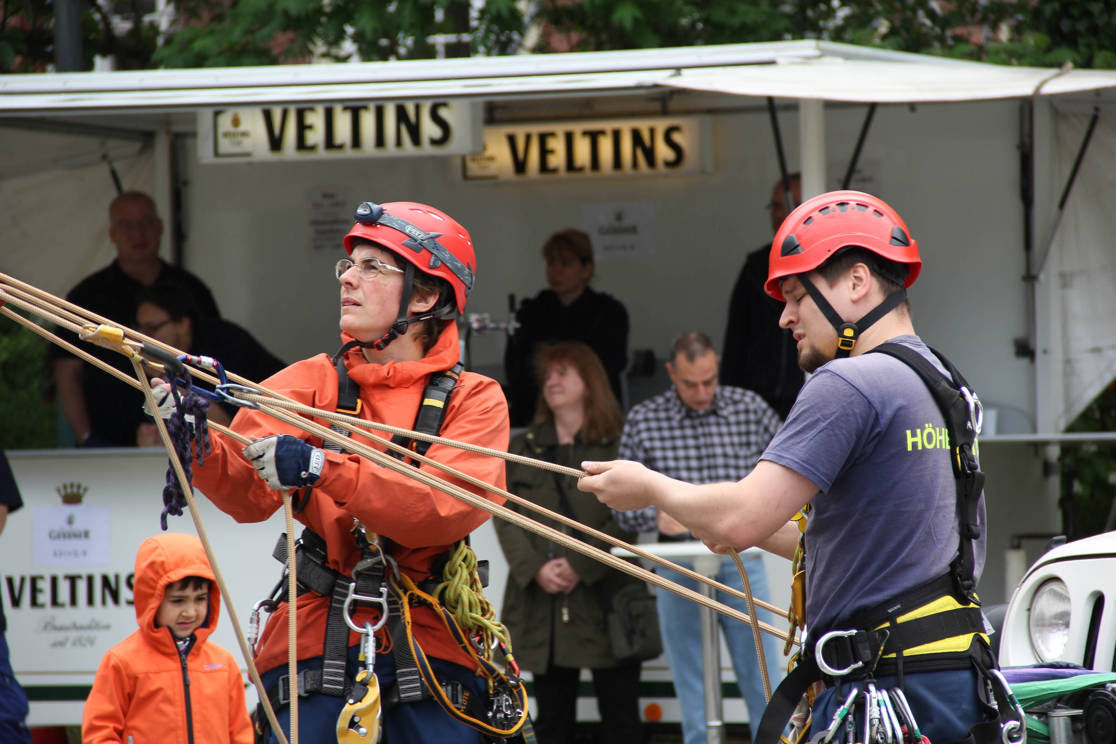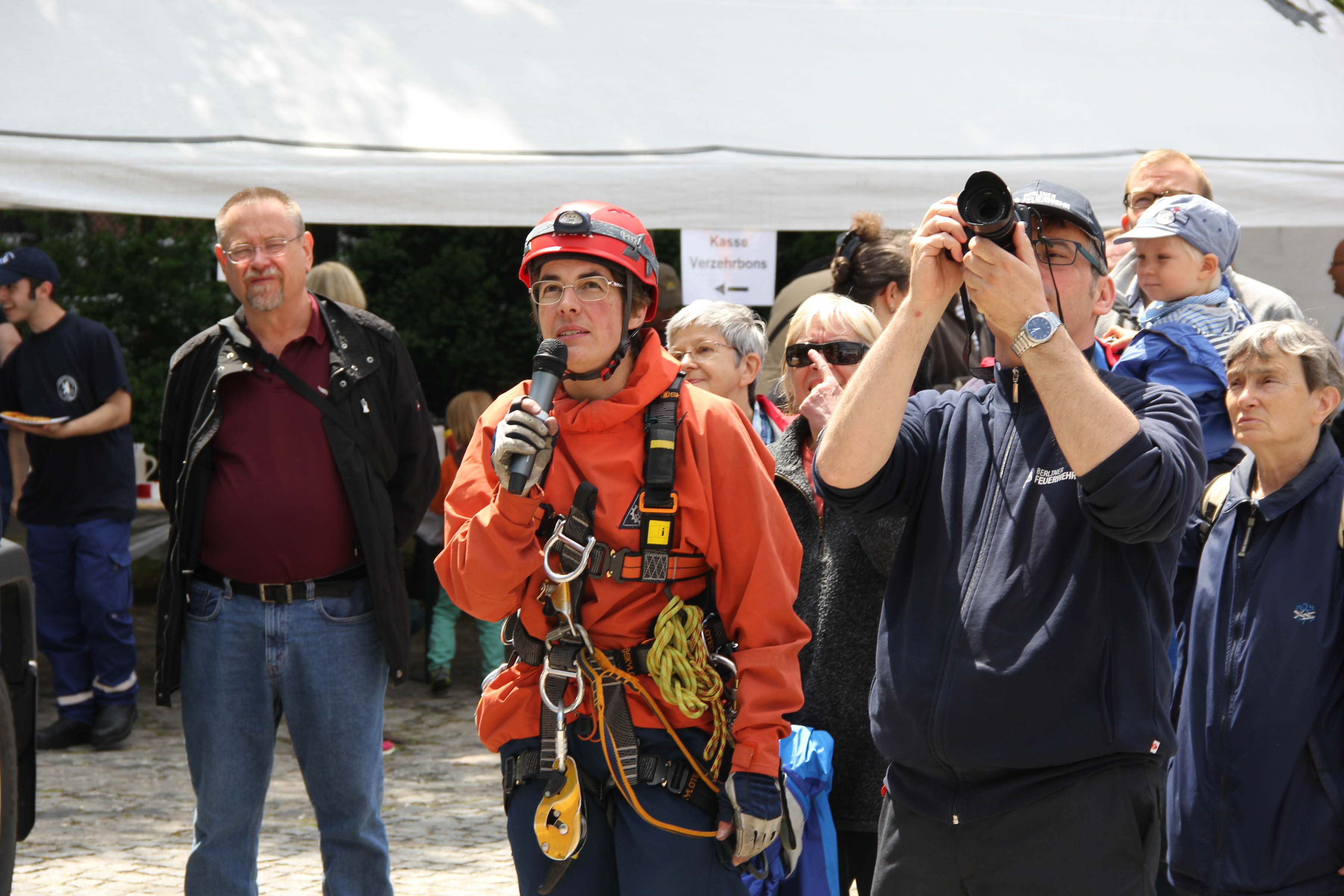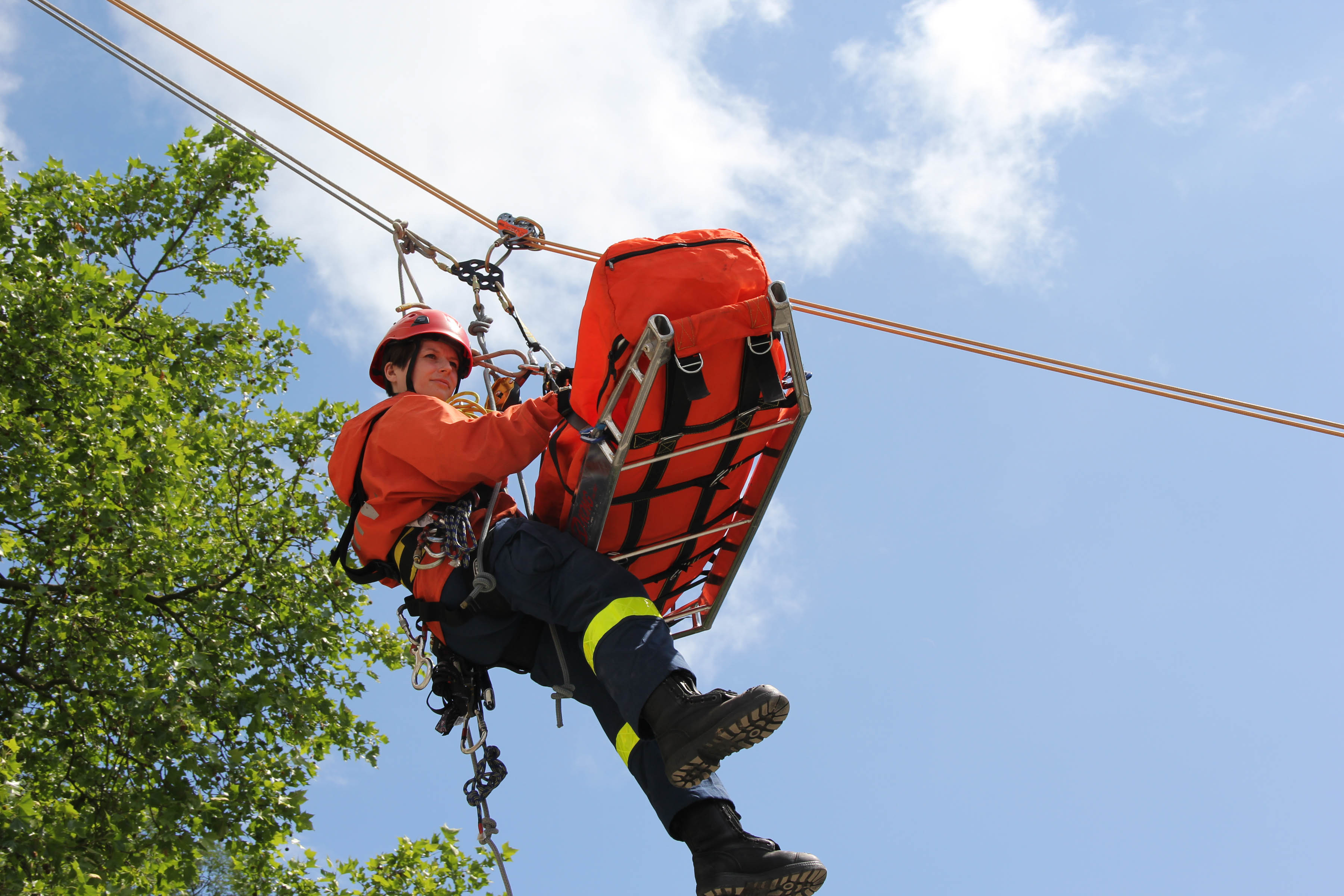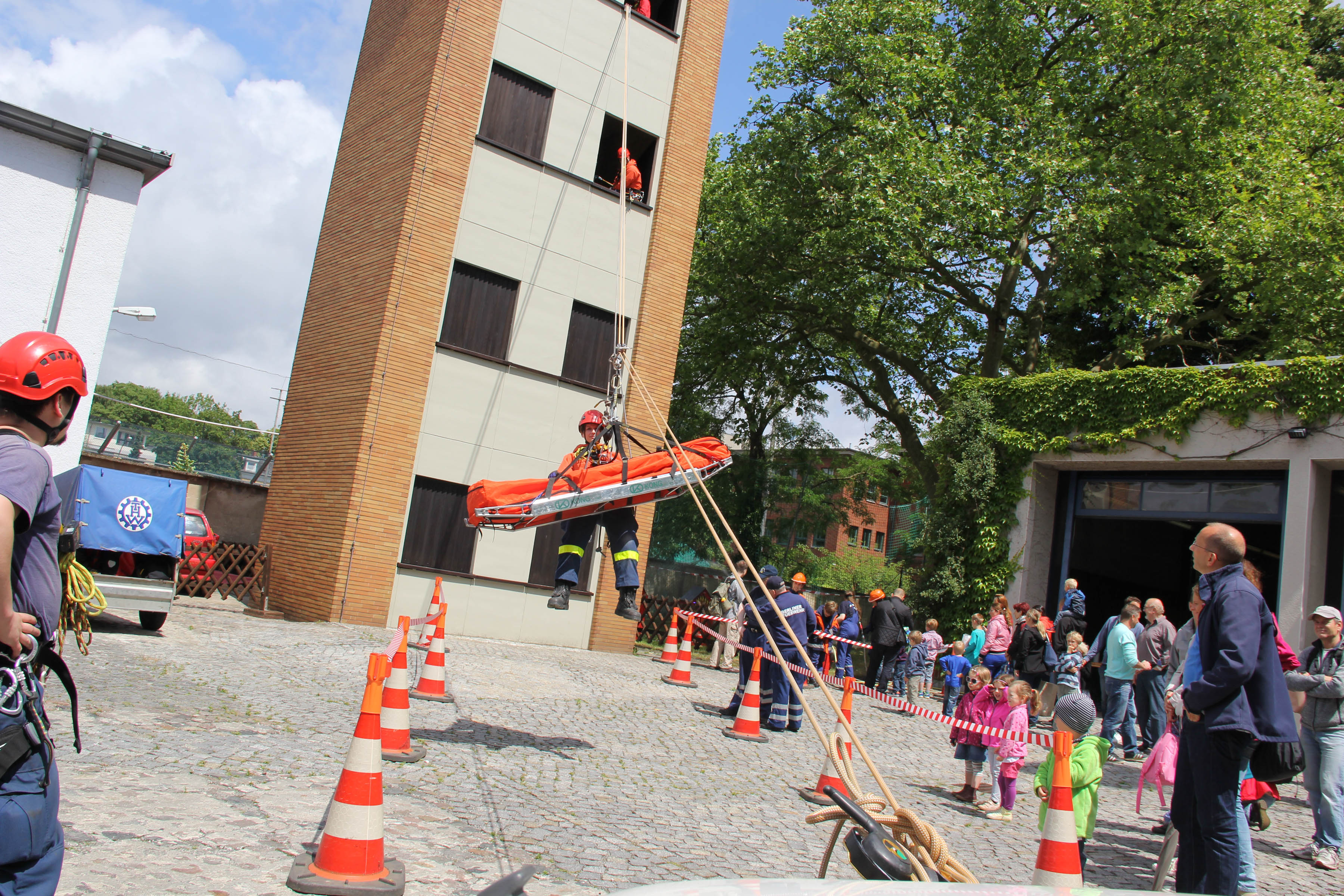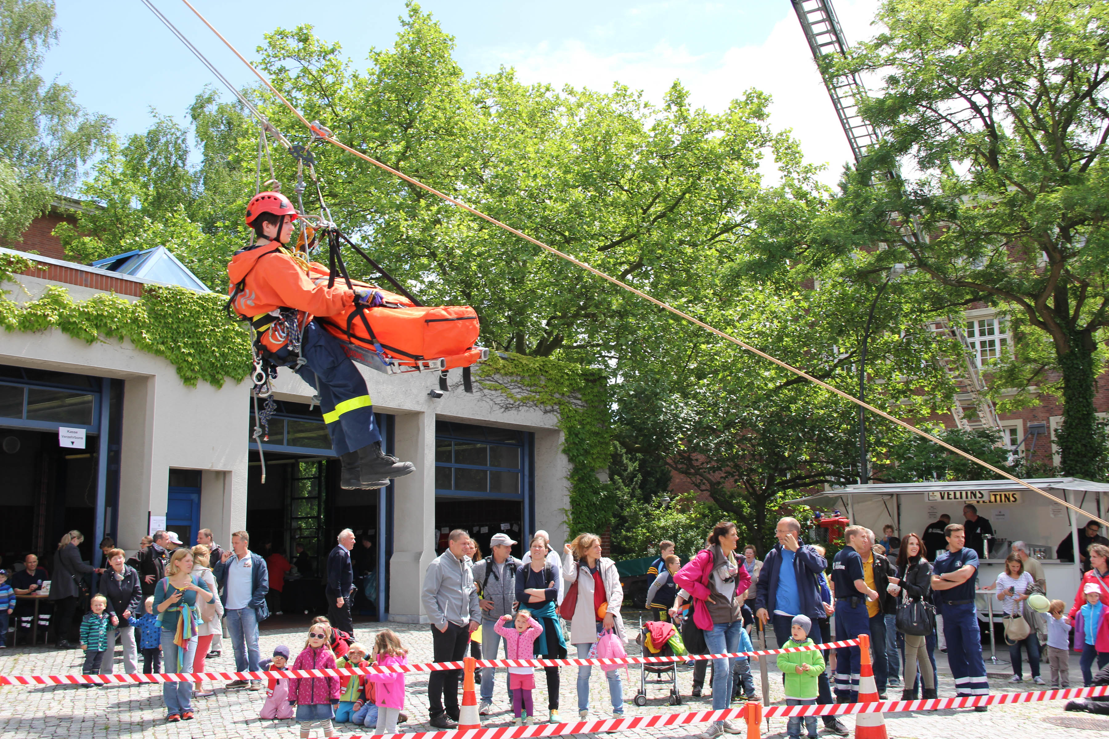 Zahlreiche Vorführungen zogen Besucherinnen und Besucher jeden Alters an. Wir hatten uns für unsere Freundinnen und Freunde der Freiwilligen Feuerwehr auch einen ganz besonderen Programmpunkt ausgedacht: An ihrem Übungsturm demonstrierten wir eine Schrägseilbahn, mit der im Ernstfall Verletzte auch über unwegsames Gelände gerettet werden können.