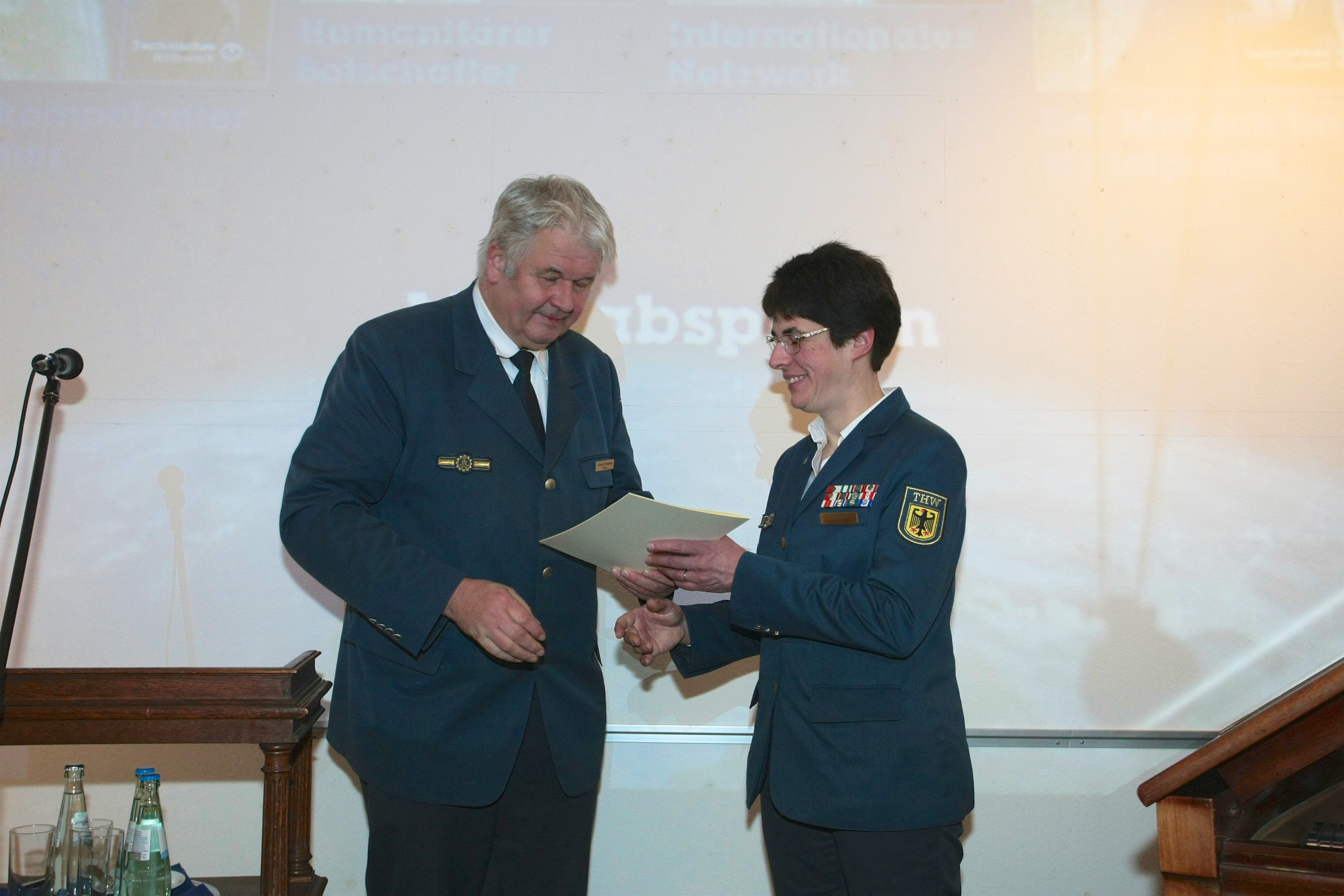 In seiner Laudatio betonte er unter anderem die viele ehrenamtliche Arbeit und Zeit, die Hedwig Karkut in den Aufbau der Höhenrettung im THW investiert hat. Außerdem hob er hervor, dass mit ihr erstmals eine Frau an der Spitze unseres Ortsverbandes steht. Großen Raum nahm auch die Kooperation mit der polnischen Feuerwehr ein, für die sich Karkut bei gemeinsamen Übungen und in Workshops engagiert hat.