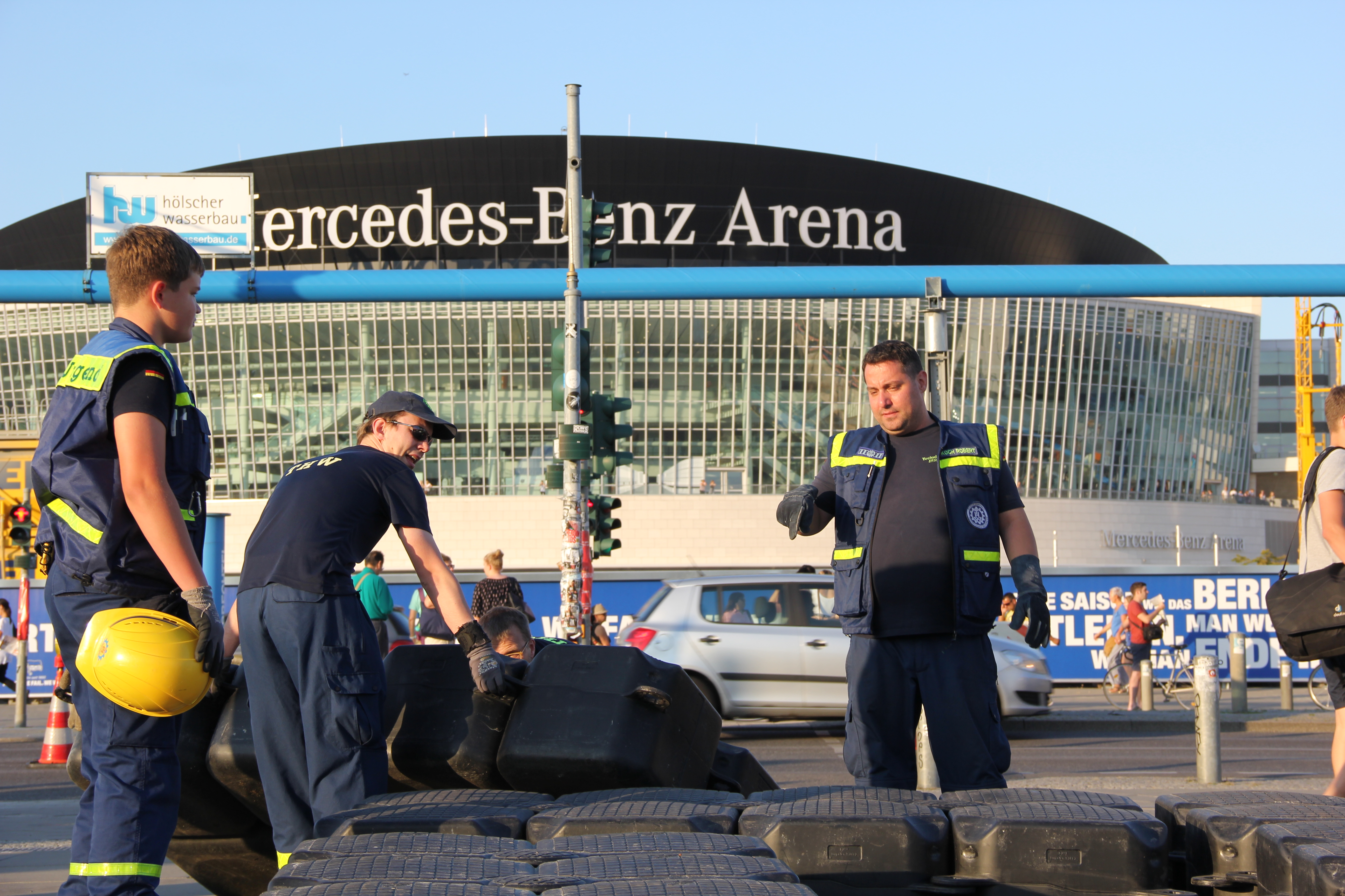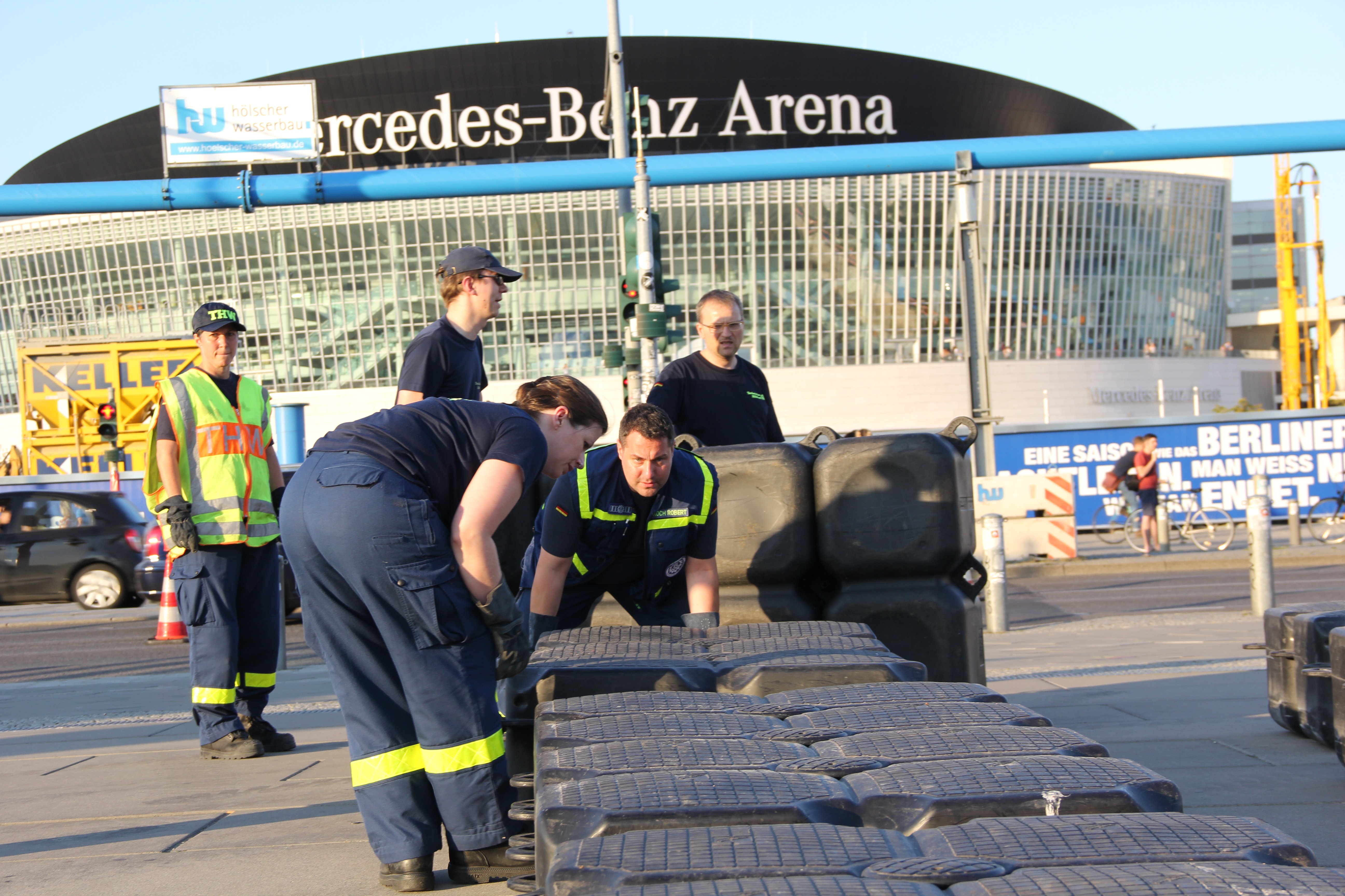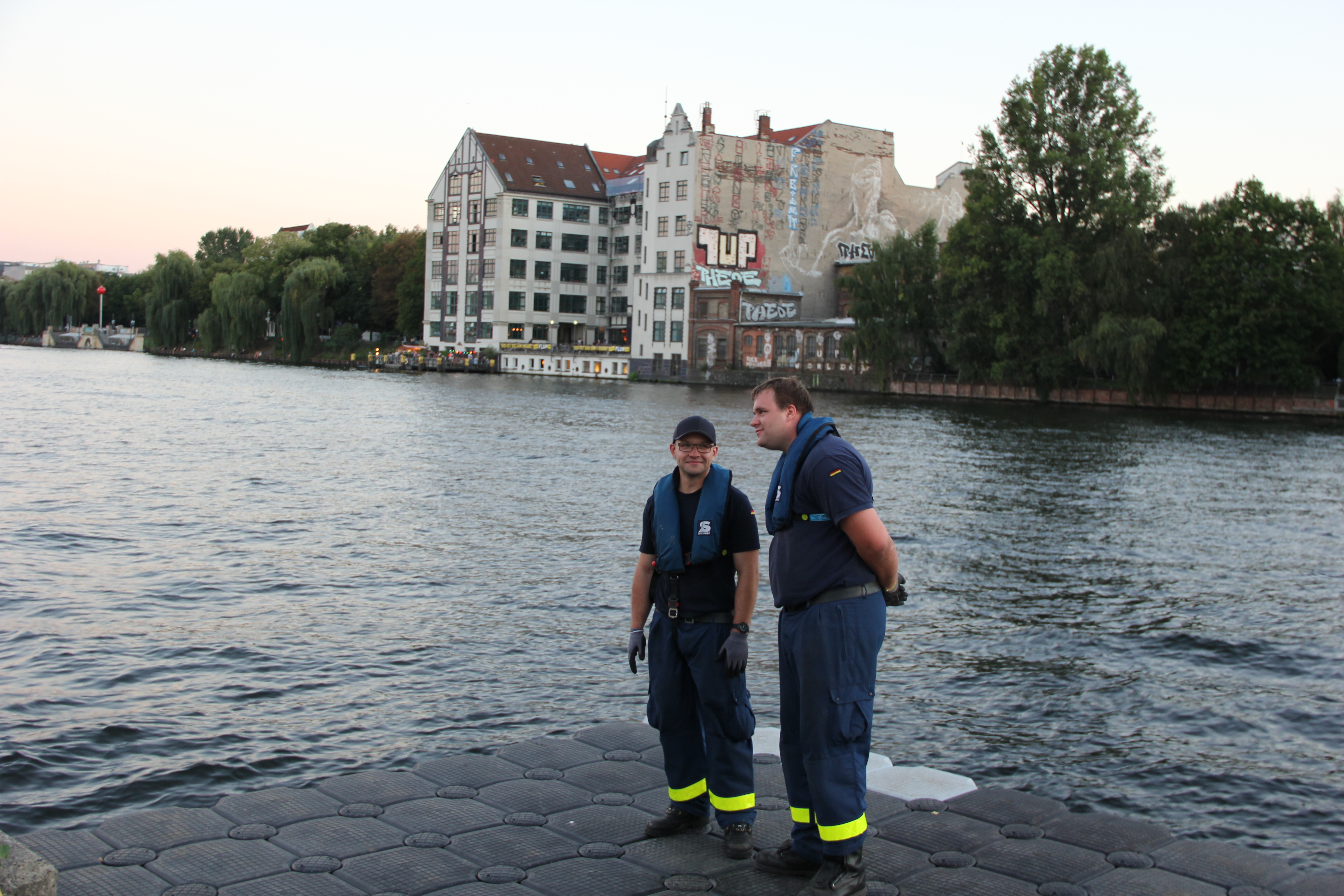 Gemeinsam mit den Ortsverbänden Berlin Charlottenburg-Wilmersdorf, Berlin Neukölln, Berlin Reinickendorf und Potsdam bauten unsere Einsatzkräfte am gestrigen Mittwoch die luftgefüllten Kunststoffteile zunächst am Ufer zu handlichen Flächen zusammen, die dann direkt auf dem Wasser verbunden wurden. Über 40 Frauen und Männer aus den Ortsverbänden waren am Abend bis zum Einbruch der Dunkelheit im Einsatz, um den rechtzeitigen Aufbau für die Rennläufe am Samstag und Sonntag zu gewährleisten.