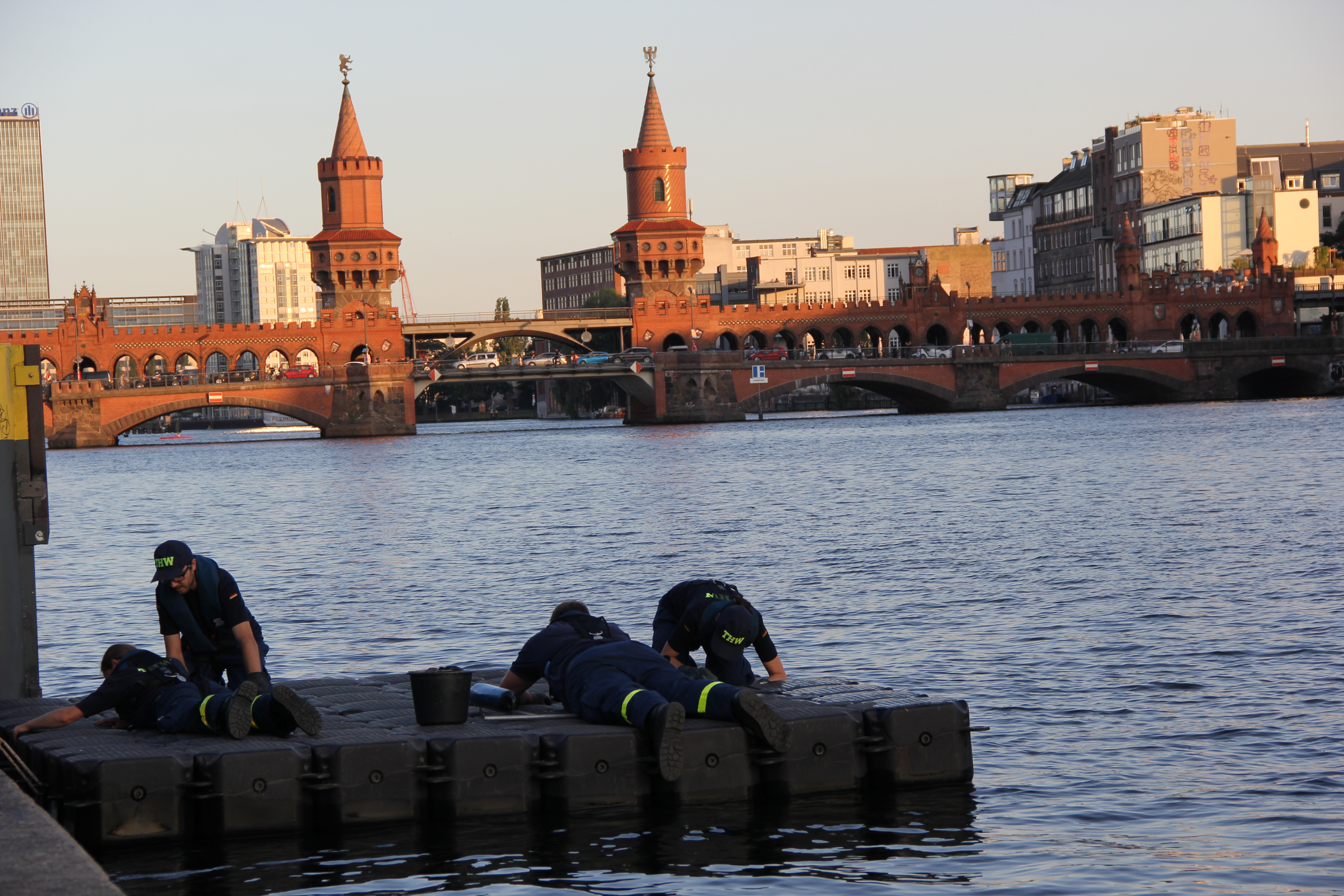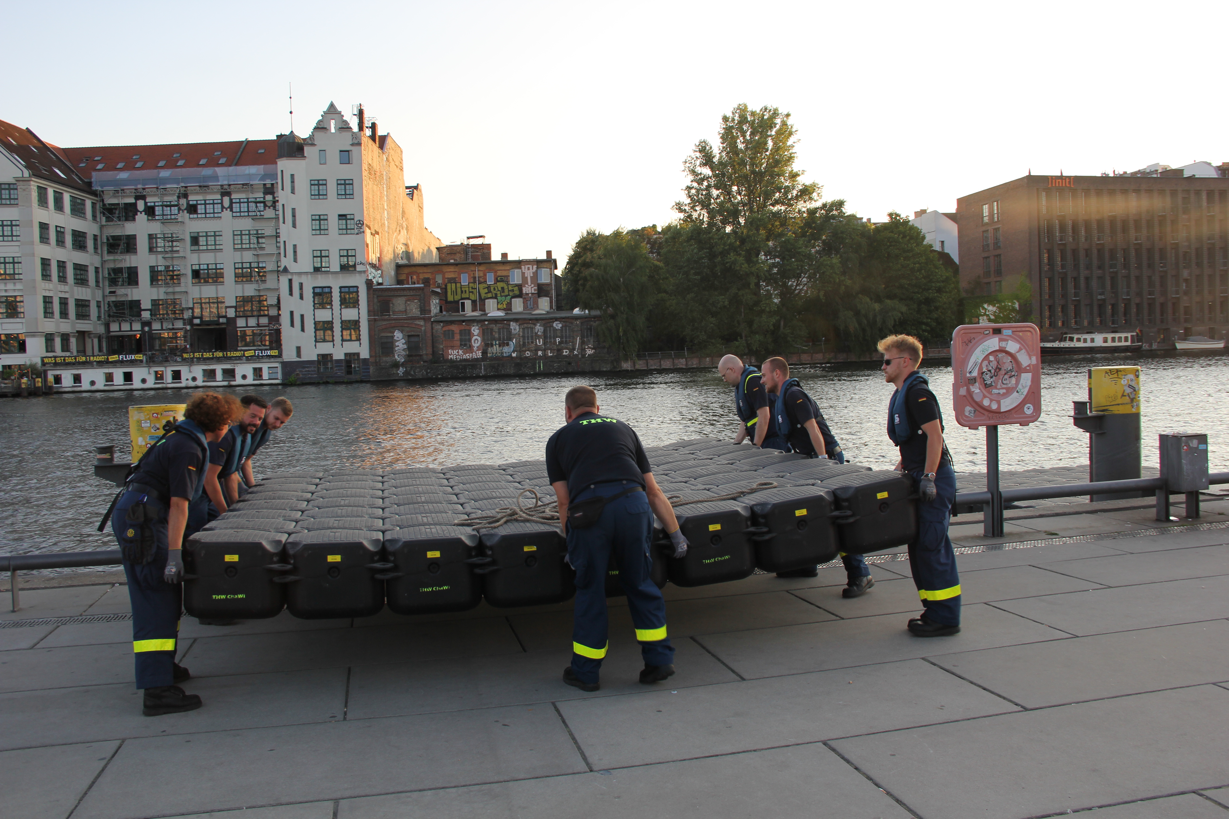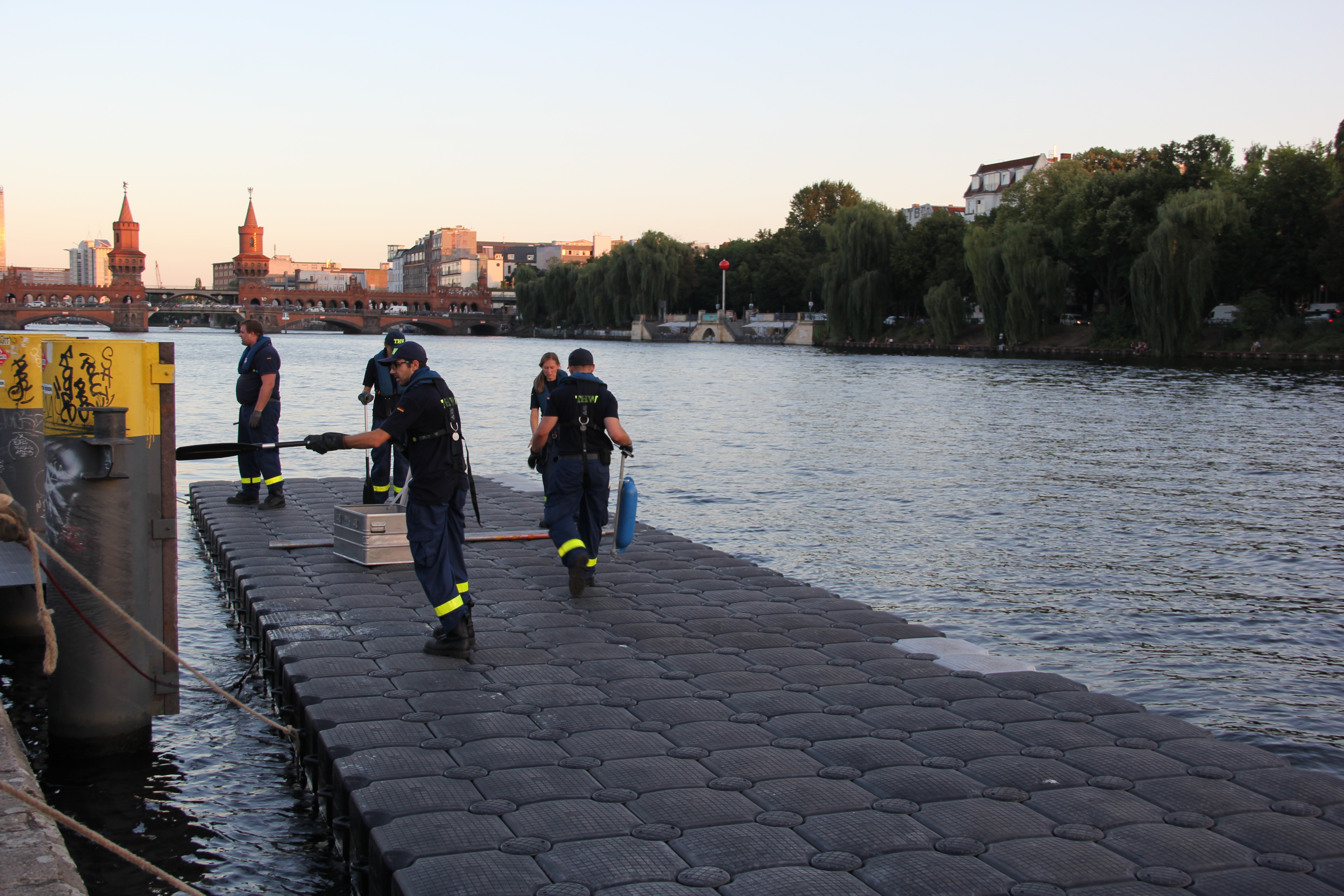 Das Jetfloat®-System ist vielseitig einsetzbar, auch als dreißig Meter langer Steg für die langen und empfindlichen Ruderboote. Diese können nämlich nicht über die steile Betonwand am Ufer der Spree ins Wasser gelassen zu werden, ohne dabei Schaden zu nehmen. Deshalb stellt das THW seit mehreren Jahren für den Berliner Ruderverband einen Schwimmsteg. Bei mehreren Events im Jahr vertrauen die Sportlerinnen und Sportler auf unsere Kompetenz in Sachen Behelfsbauten.