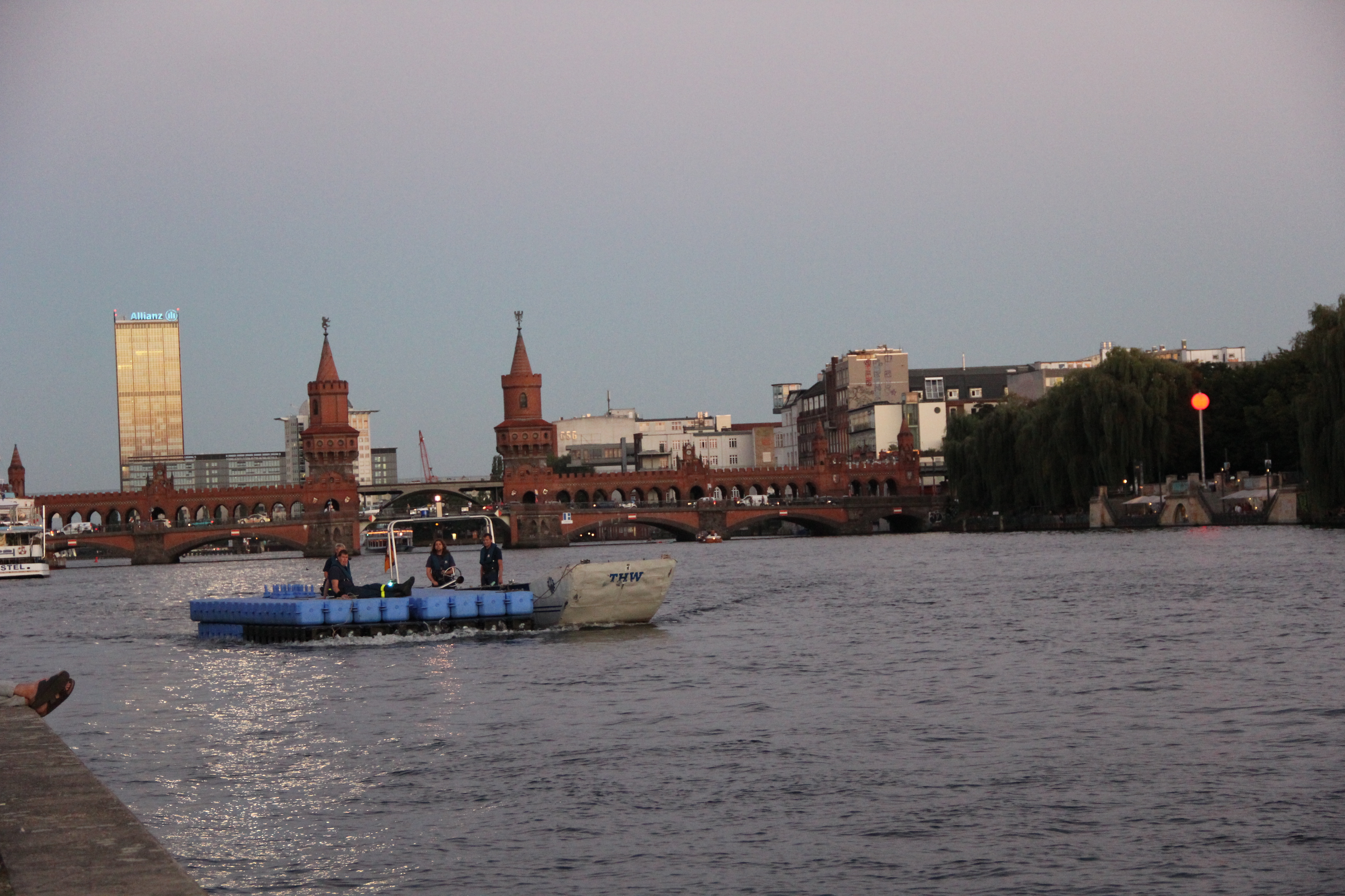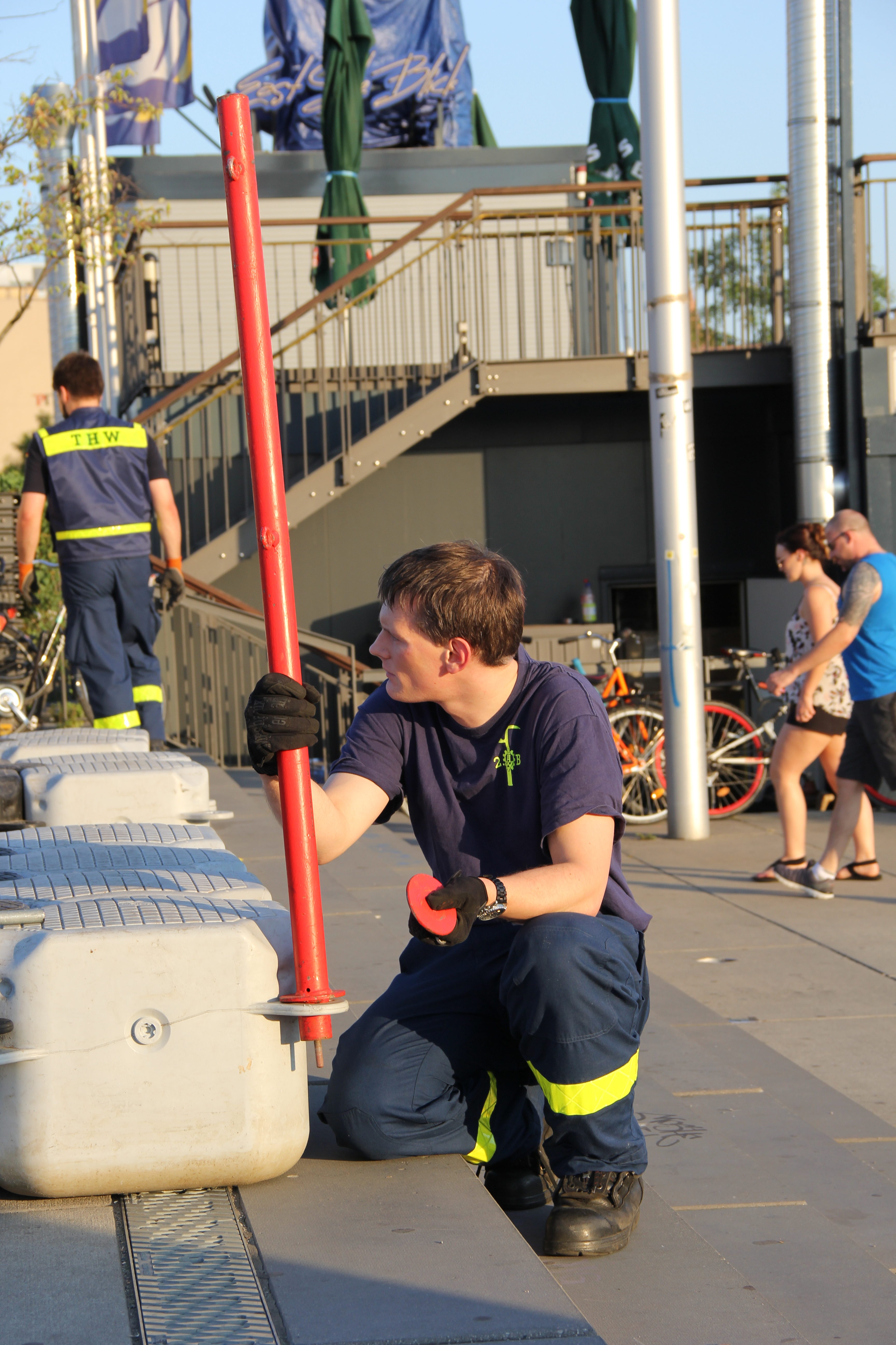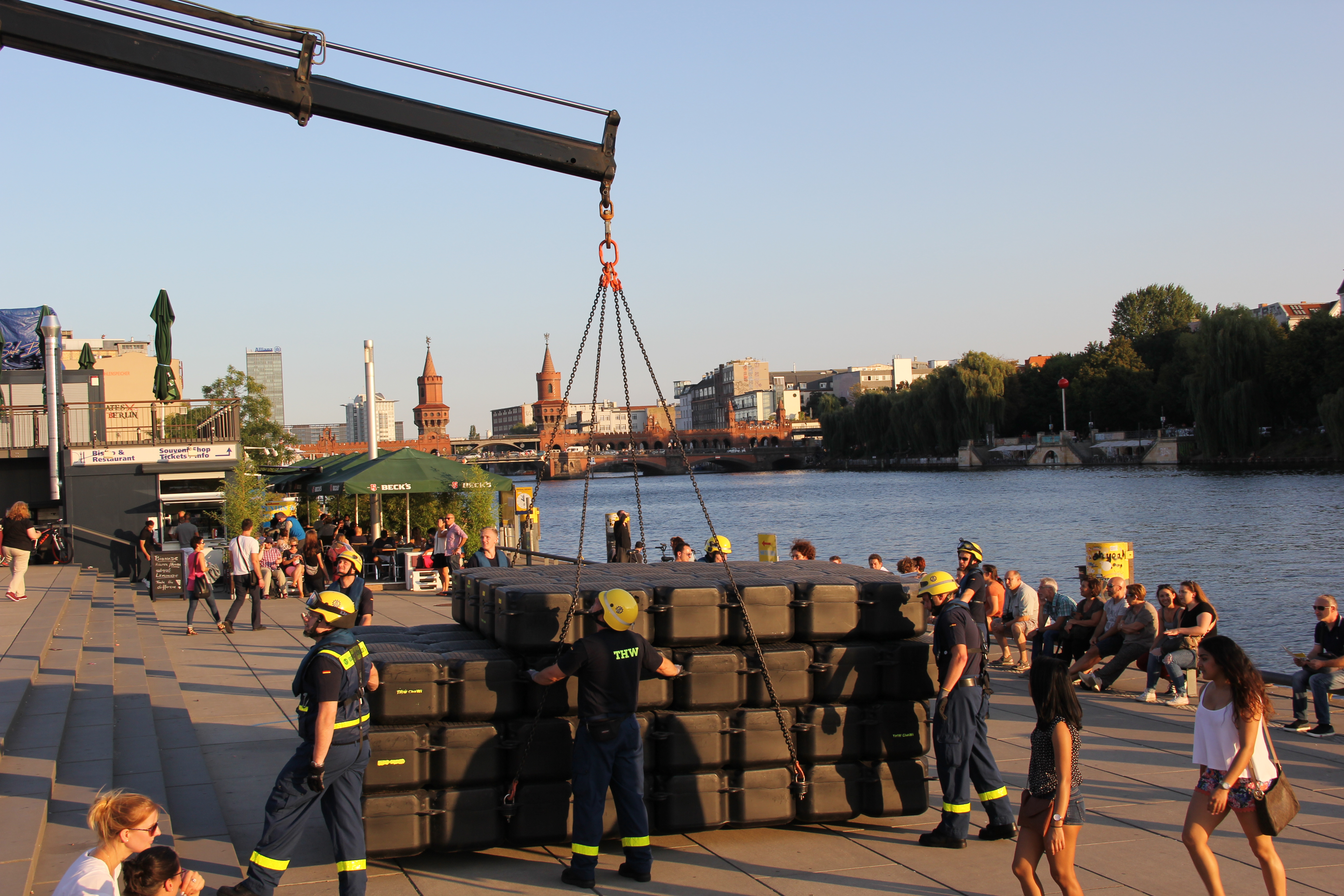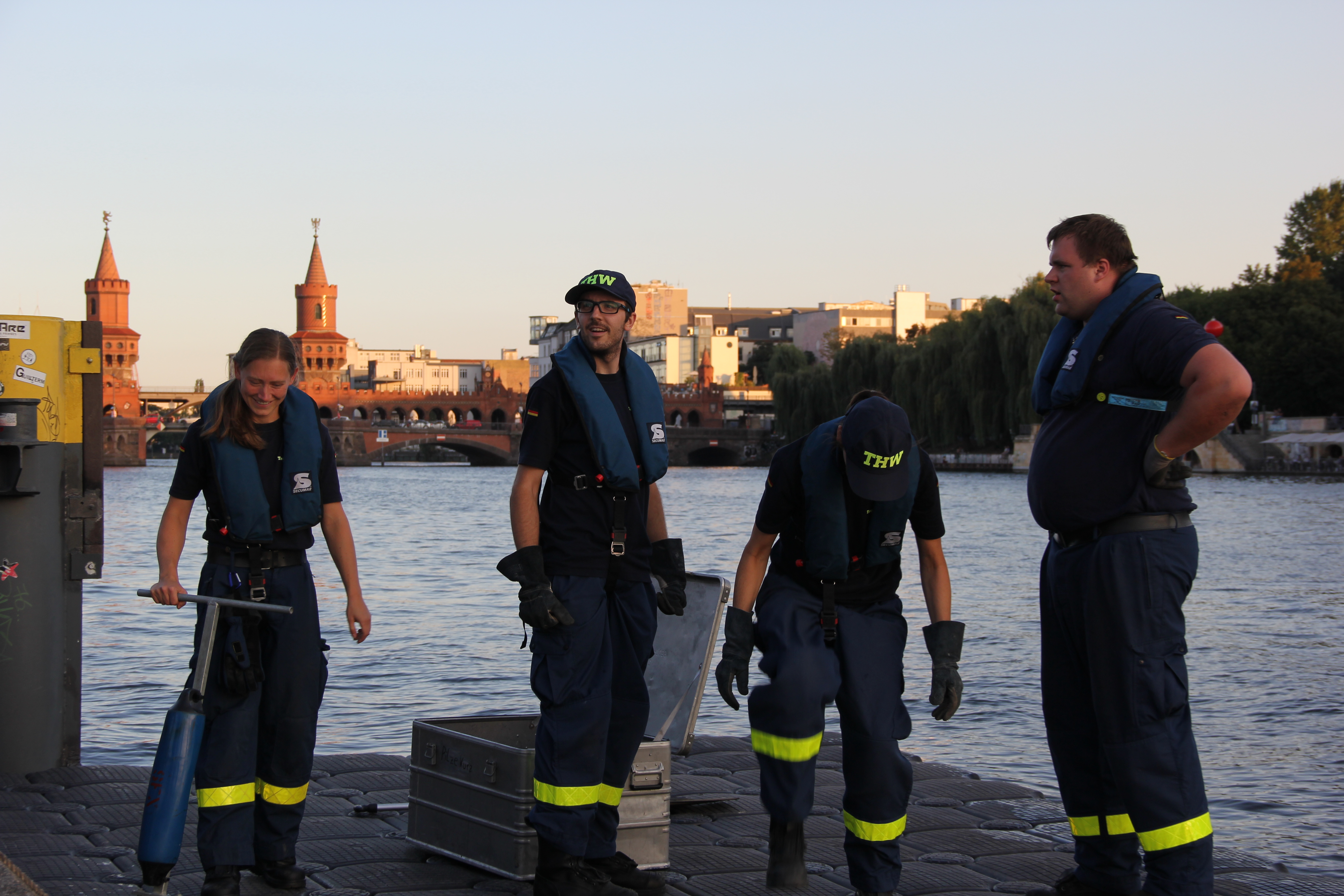Das Jetfloat®-System ist vielseitig einsetzbar, auch als dreißig Meter langer Steg für die langen und empfindlichen Ruderboote. Diese können nämlich nicht über die steile Betonwand am Ufer der Spree ins Wasser gelassen zu werden, ohne dabei Schaden zu nehmen. Deshalb stellt das THW seit mehreren Jahren für den Berliner Ruderverband einen Schwimmsteg. Bei mehreren Events im Jahr vertrauen die Sportlerinnen und Sportler auf unsere Kompetenz in Sachen Behelfsbauten.