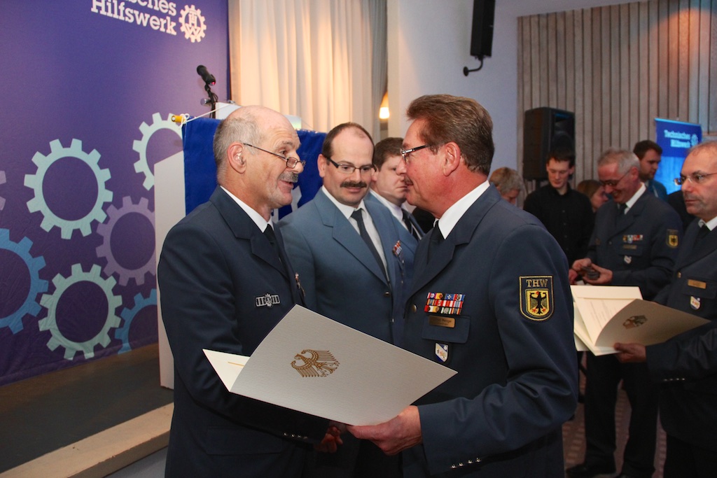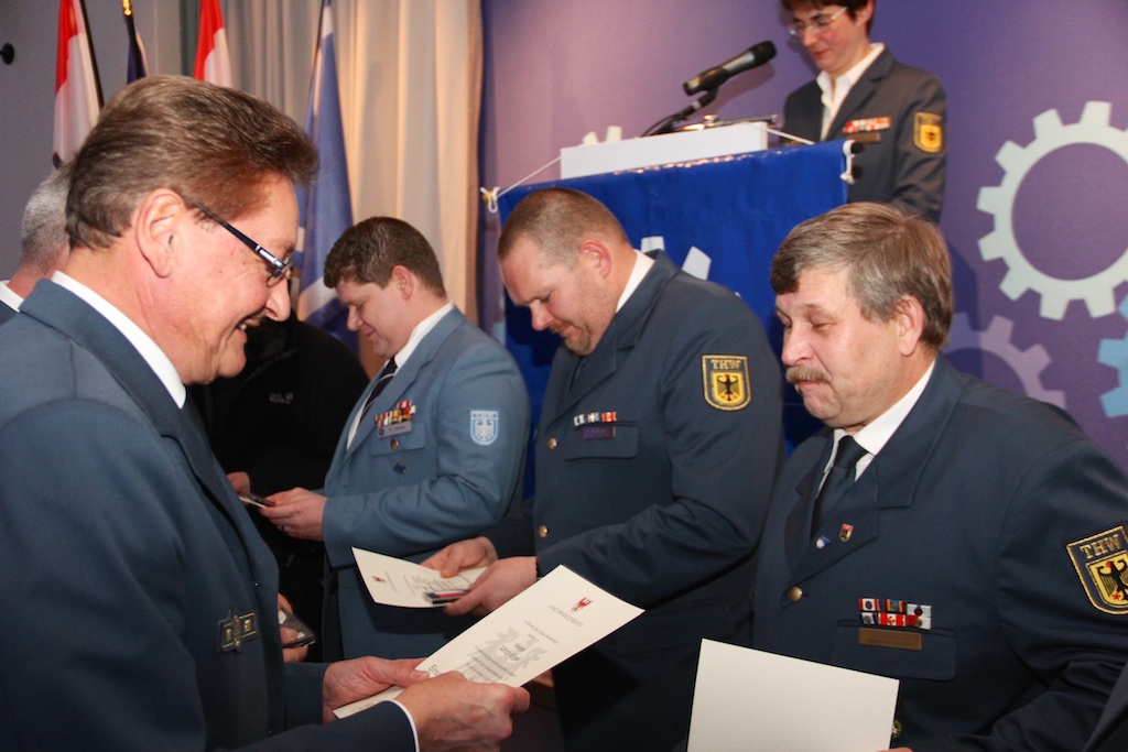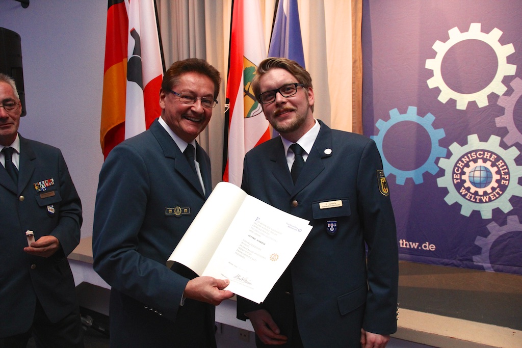 Für seine besonderen Verdienste um die technische Hilfe im Ausland erhielt Jürgen Ertel das Helferzeichen in Gold mit Kranz. Er hatte in diesem Jahr gleich mehrere Wochen im ehrenamtlichen Dienst für die humanitäre Hilfe verbracht, etwa im Mittleren Osten. Die selbe Ehrung erhielt Per Ernst für seine Arbeit mit der THW-Jugend.