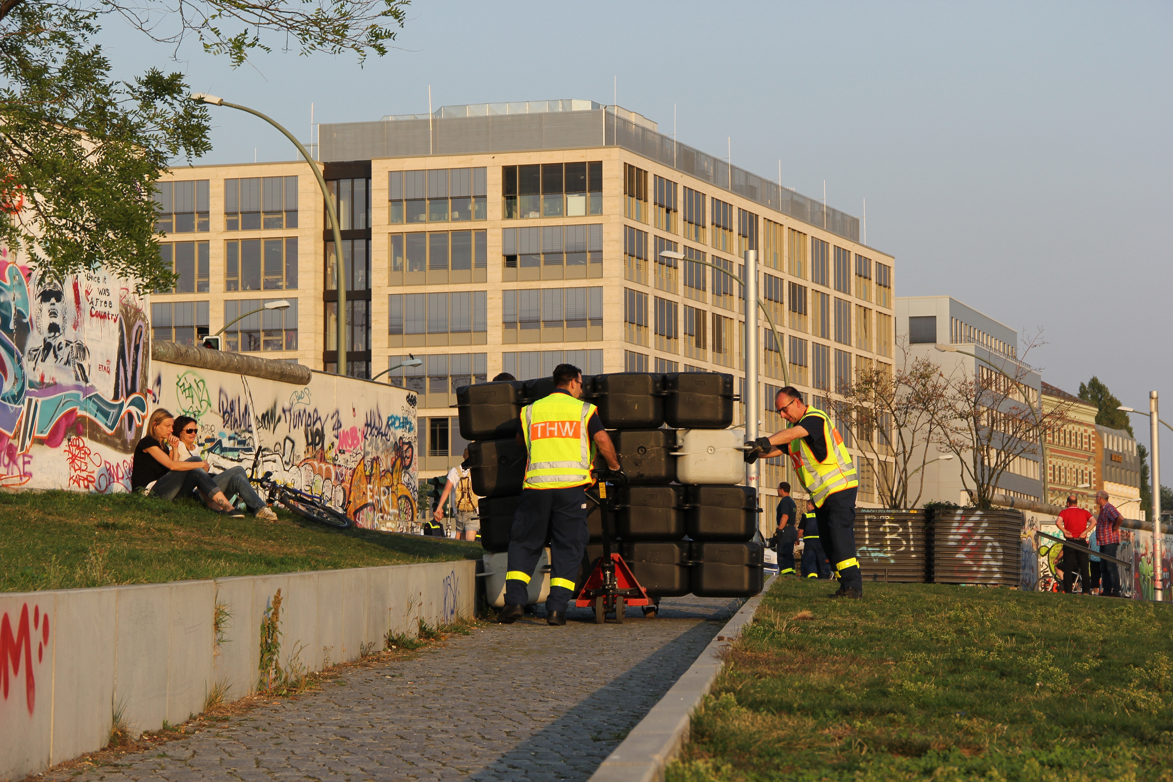Denn auf der Spree an der East Side Gallery, wo die Boote am Wochenende zu Wasser gelassen werden sollen, ist das Ufer viel zu hoch für die empfindlichen Sportgeräte der Ruderer. Deshalb schufen am gestrigen Mittwoch unsere Helferinnen und Helfer gemeinsam mit Einsatzkräften aus den Ortsverbänden Charlottenburg-Wilmersdorf, Potsdam und Reinickendorf einen neuen Steg.
