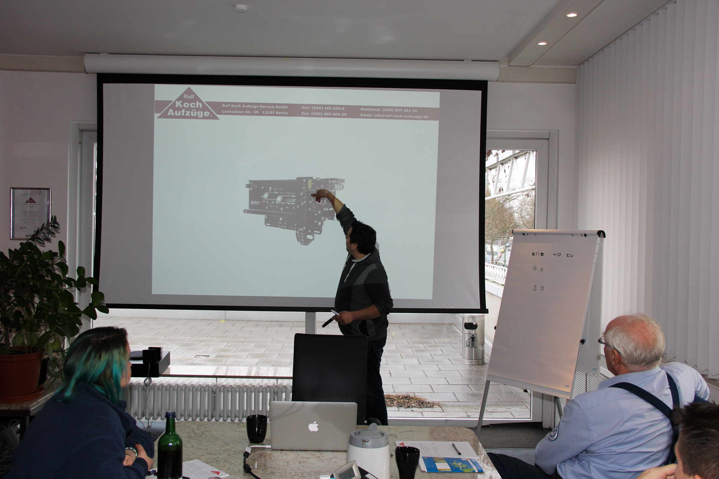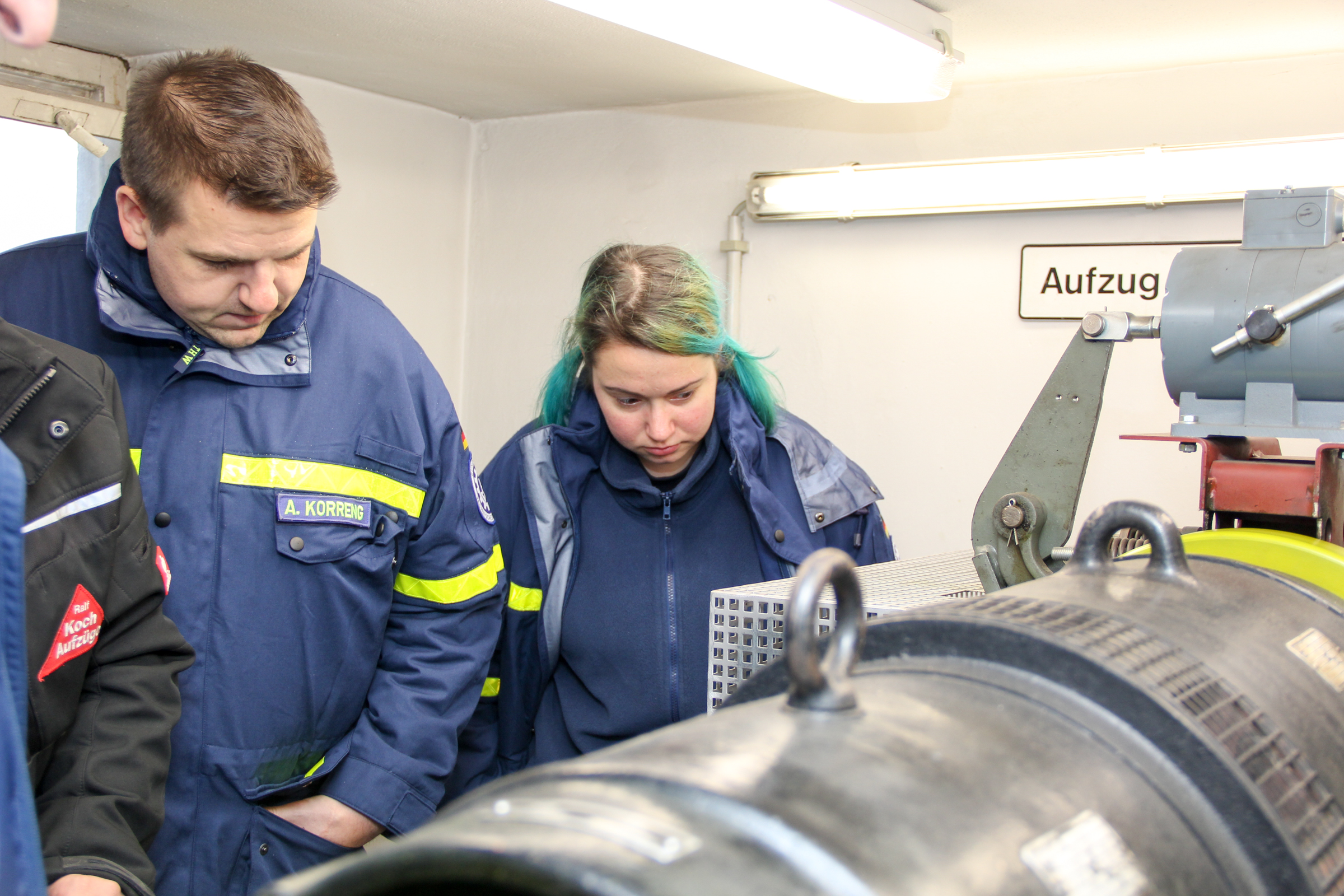 Insbesondere bei den Feuerwehr-bereitschaften, also wenn das THW an einem Samstag die Berliner Feuerwehr im regulären Dienst unterstützt, kommt es immer wieder vor, dass Personen aus stehen gebliebenen Aufzügen befreit werden müssen. Damit das möglichst ohne Beschädigung der teuren und für eingeschränkte Berlinerinnen und Berliner wichtigen Anlagen passiert, werden die Einsatzkräfte mit freundlicher Unterstützung der Ralf Koch Aufzugs-Service GmbH fachmännisch ausgebildet.